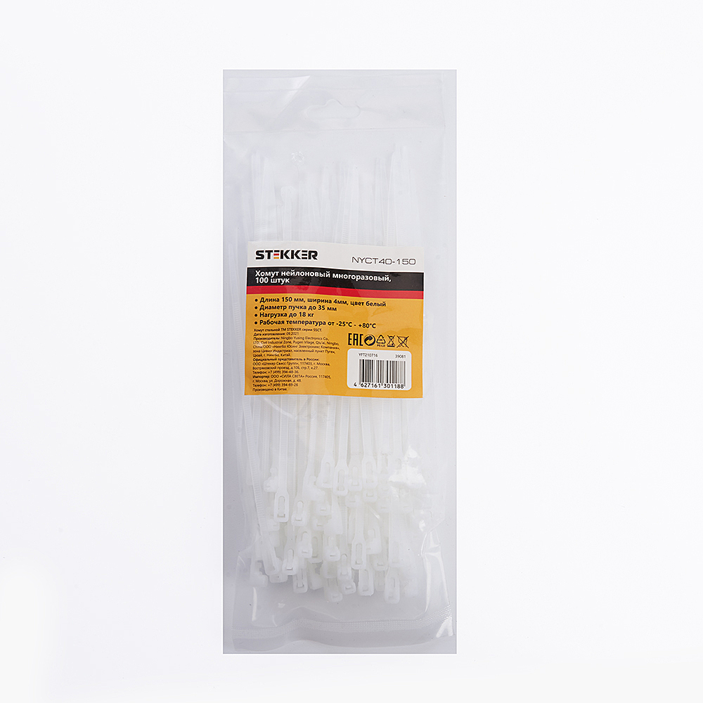 Хомут электромонтажный STEKKER NYCT40-150, Да, белый, материал - нейлон , размер 4*150мм, максимальный диаметр пучка - -мм, нагрузка - -кг, диапазон рабочих температур -35?C - +80?C, рекомендуемая температура хранениня -2...+25С