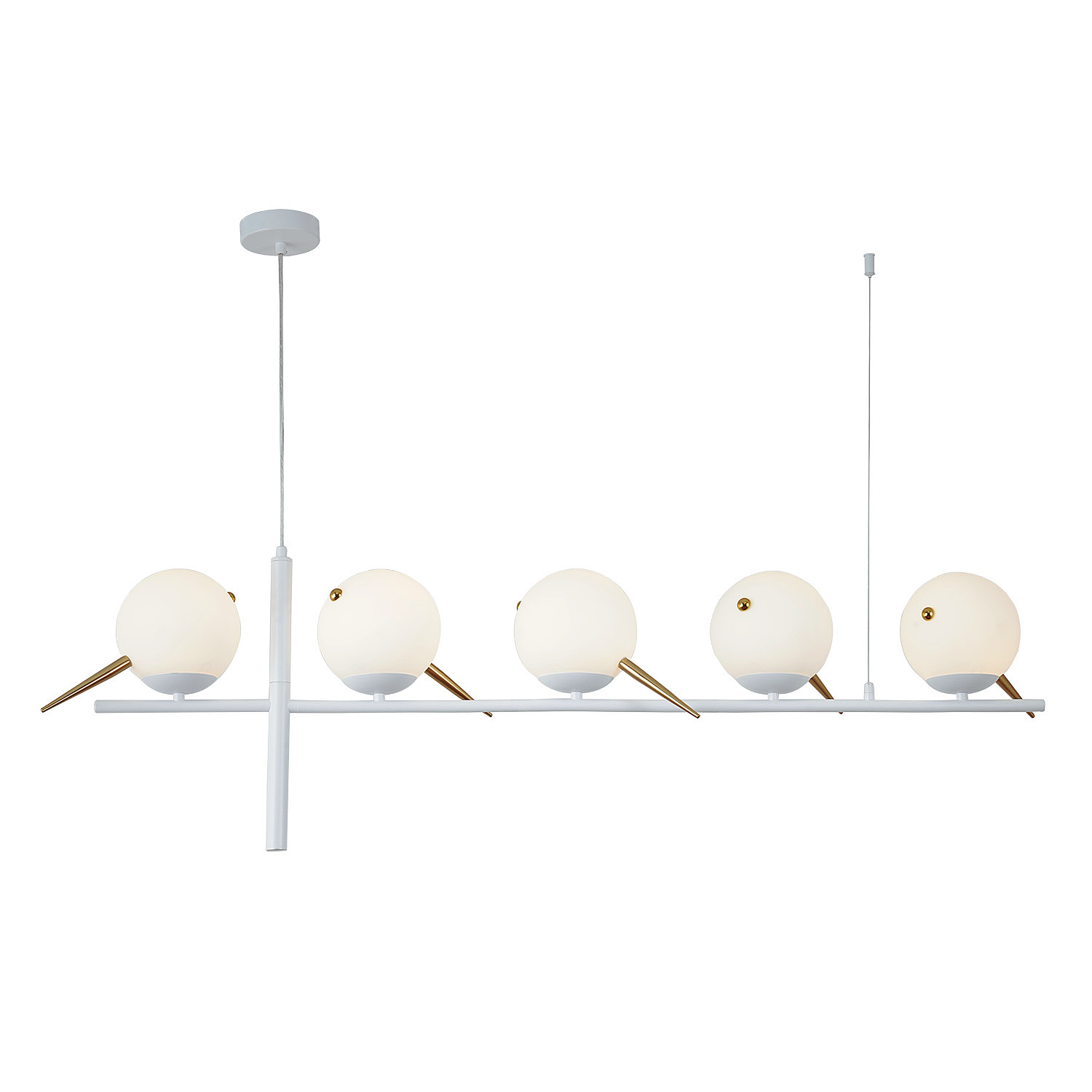 Каркас белого цвета, выдувные плафоны из стекла белого цвета с декоративными элементами из металла золотого цвета. Высота подвесной люстры регулируетс