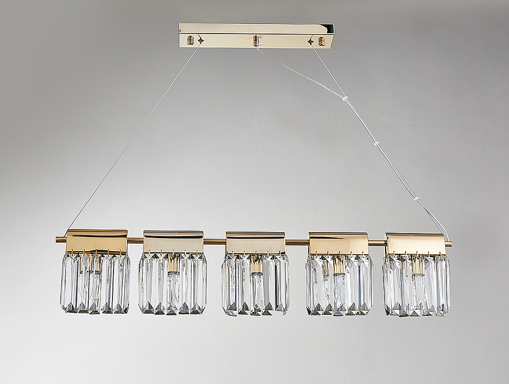 Допускается отличие страны-изготовителя, указанной в характеристиках. Линии производства могут находиться в нескольких государствах. Это не влияет на качество изготовления товара: все заводы данного бренда работают по общим стандартам, а готовые изделия проходят соответствующий контроль.США Коллекция 4200 ЦветЦвет арматуры Золото Цвет Золото Материал арматуры Железо крашеное Цвет декора прозрачный Материал декора Хрусталь РазмерыВысота (мм) 1380 Длина (мм) 850 Высота минимальная (мм) 180 Ширина (мм) 50 ЭлектрикаКоличество ламп (шт) 5 Цоколь E14 Мощность лампы (Вт) 60 Напряжение (В) 220 Дополнительная информацияТип подвеса На тросах -