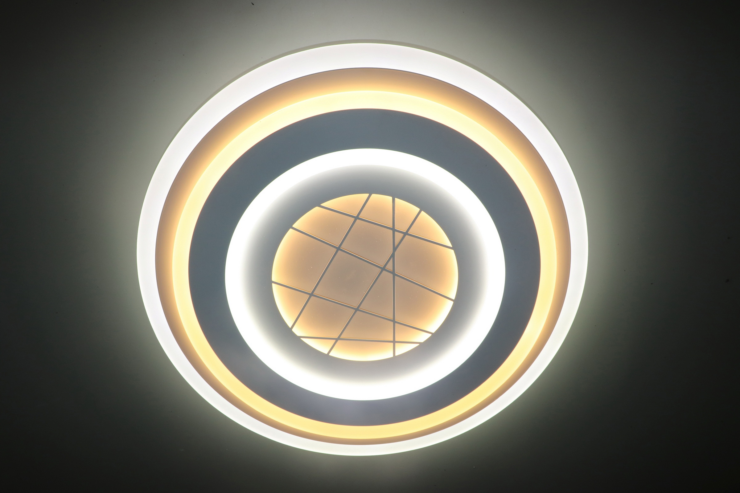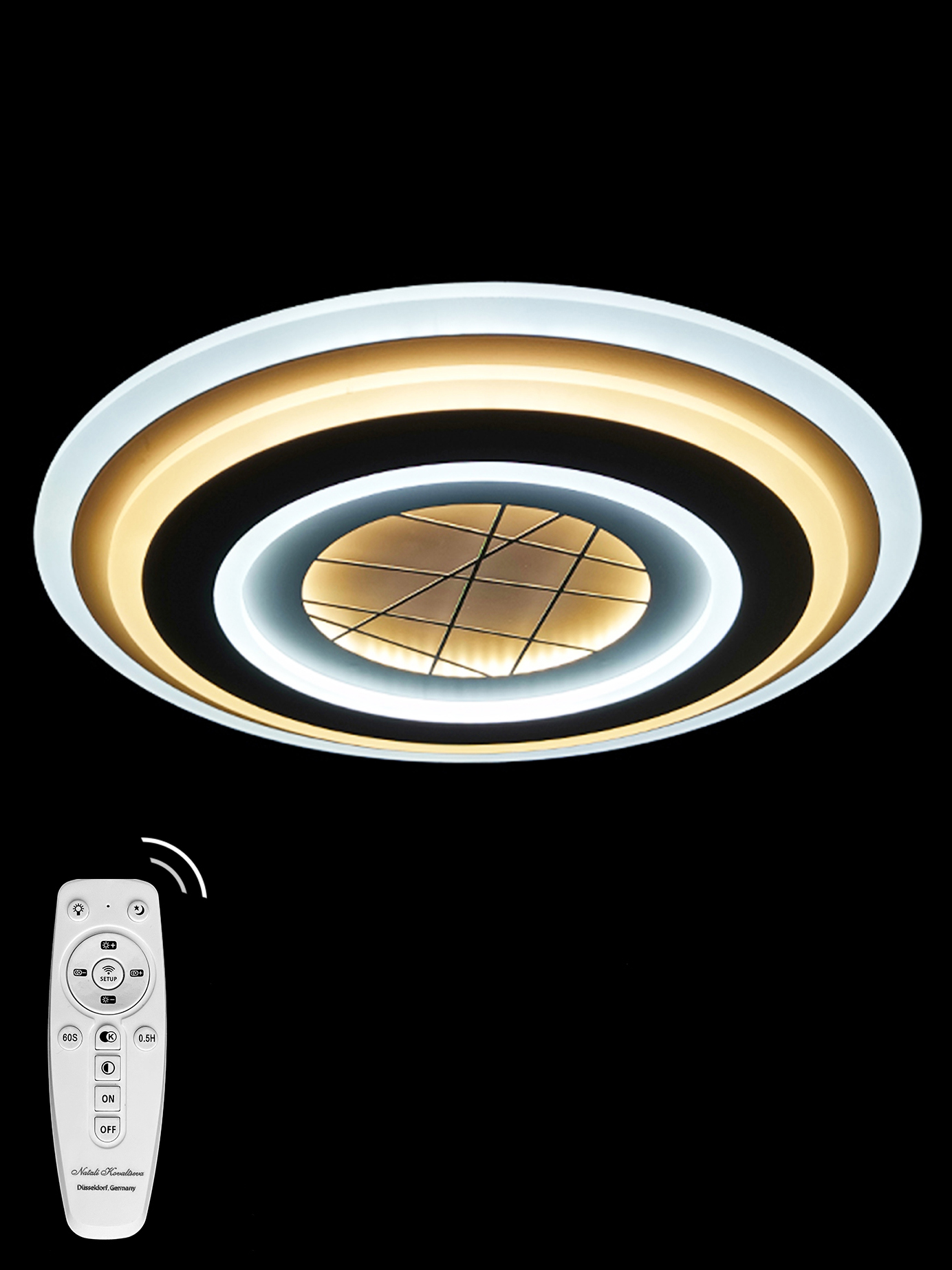 Изделие рассчитано на 60 Вт, общая мощность лампы 80. Потолочный светодиодный светильник может осветить до 25 метров2.Тип цоколя - LED, Степень защиты 20 IP 3 режима, пульт управления, металл, акрил.