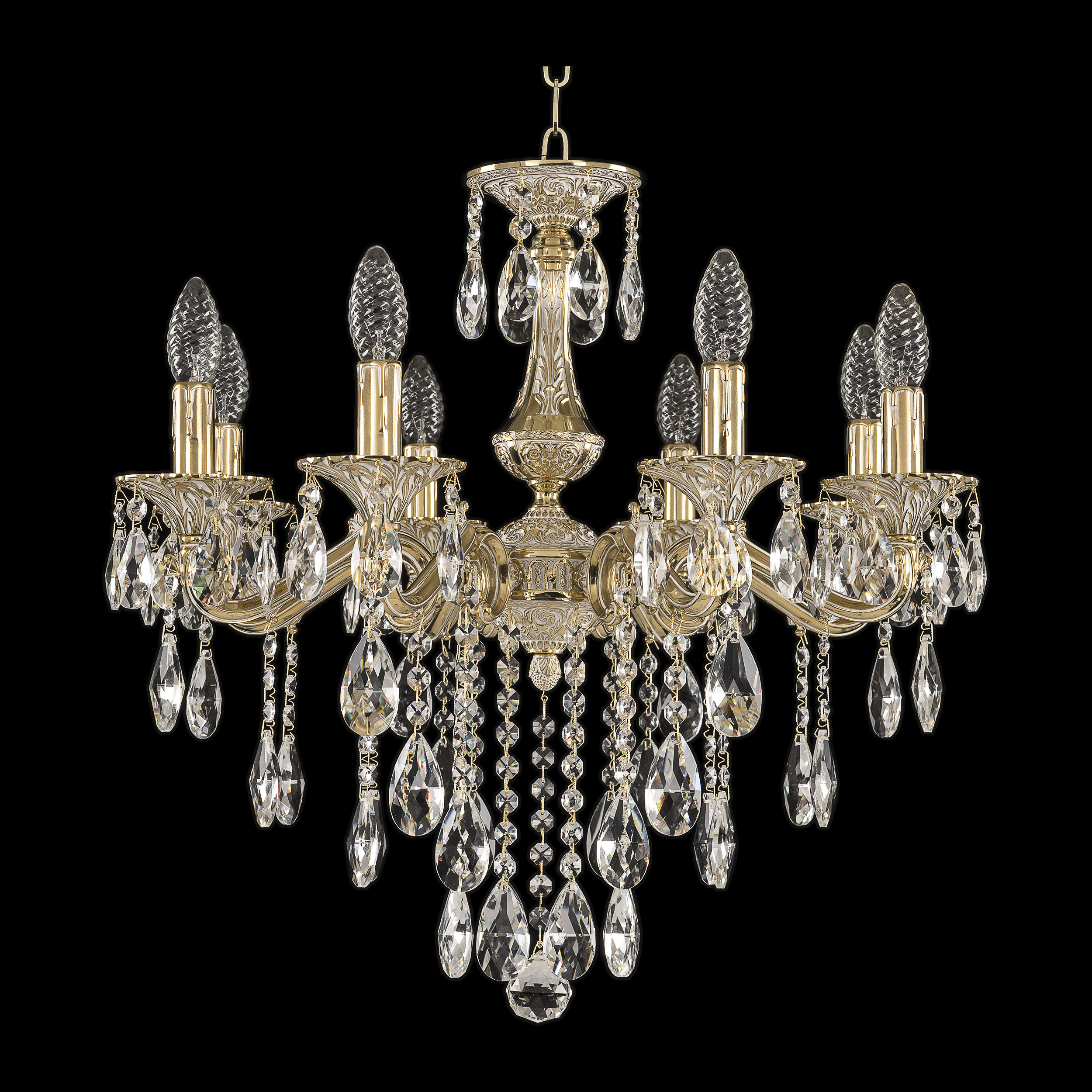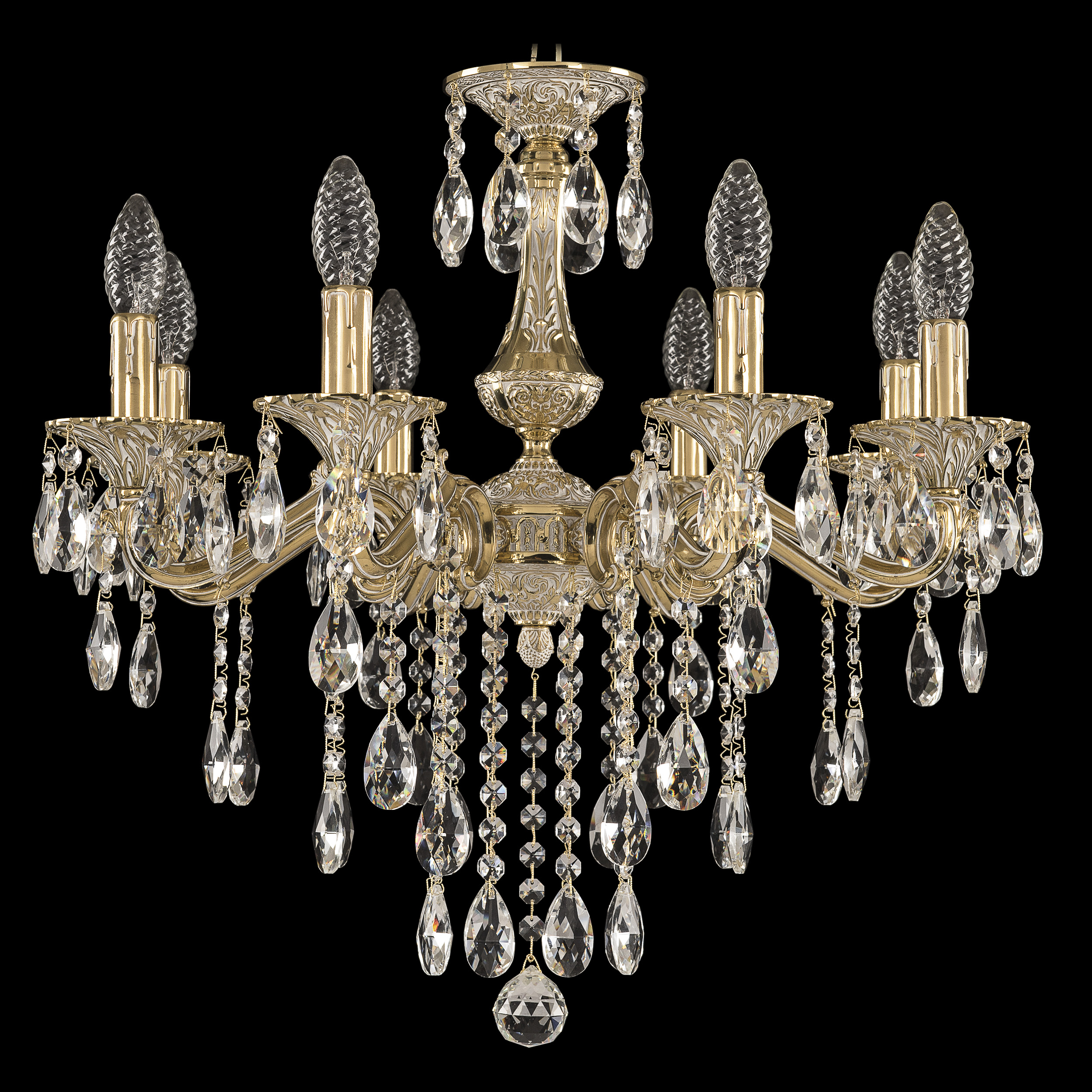 Допускается отличие страны-изготовителя, указанной в характеристиках. Линии производства могут находиться в нескольких государствах. Это не влияет на качество изготовления товара: все заводы данного бренда работают по общим стандартам, а готовые изделия проходят соответствующий контроль.Чехия Коллекция 7202 ЦветЦвет арматуры золото белёное Цвет Золото Материал арматуры Латунь Цвет декора бесцветный РазмерыВысота (мм) 560 Диаметр (мм) 580 Ширина (мм) 580 ЭлектрикаКоличество ламп (шт) 8 Цоколь E14 Мощность лампы (Вт) 40 Дополнительная информацияВес (Кг) 8 Тип подвеса На цепи -