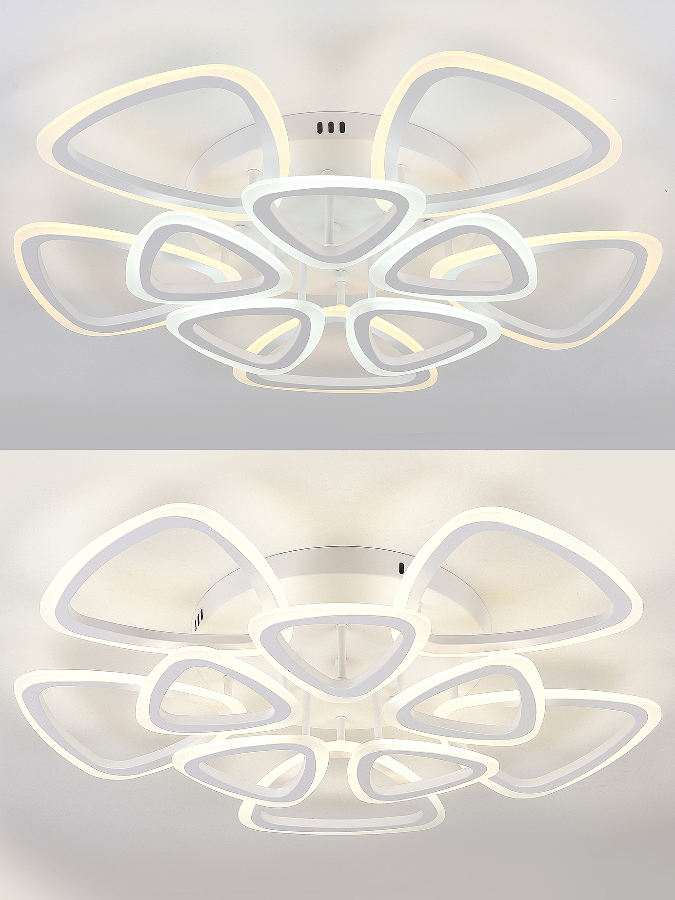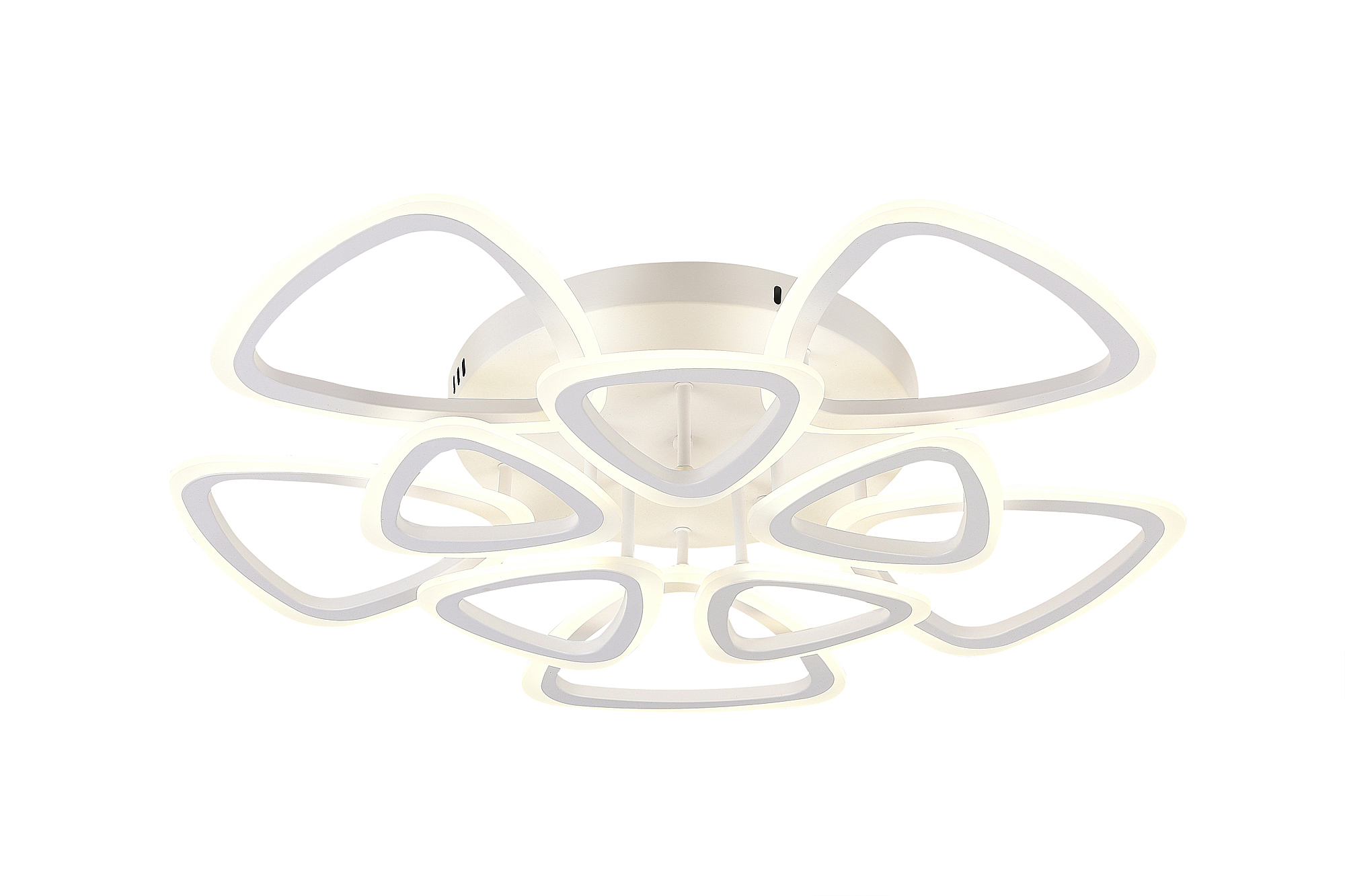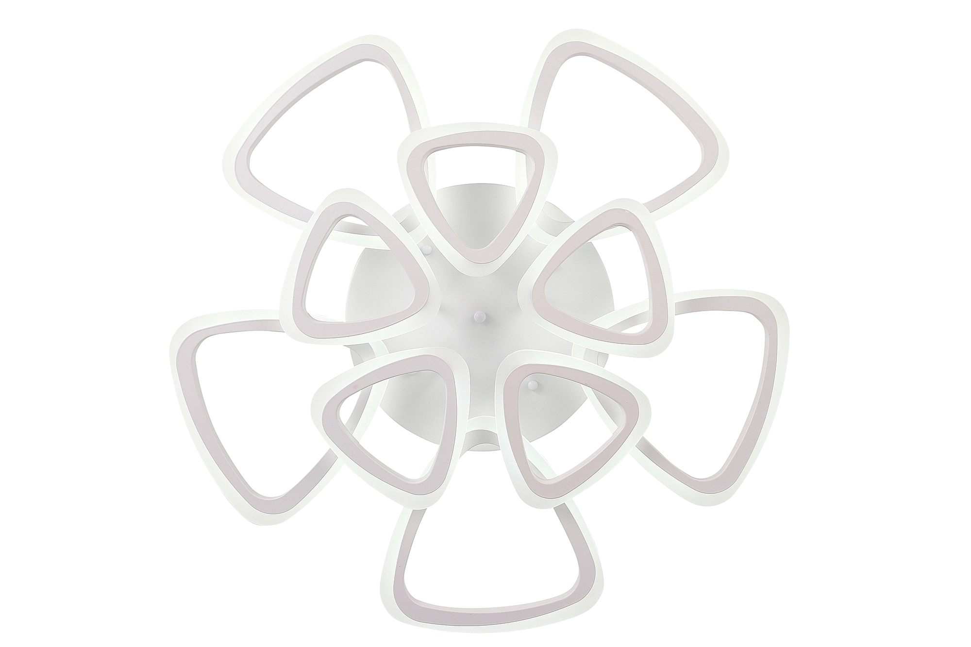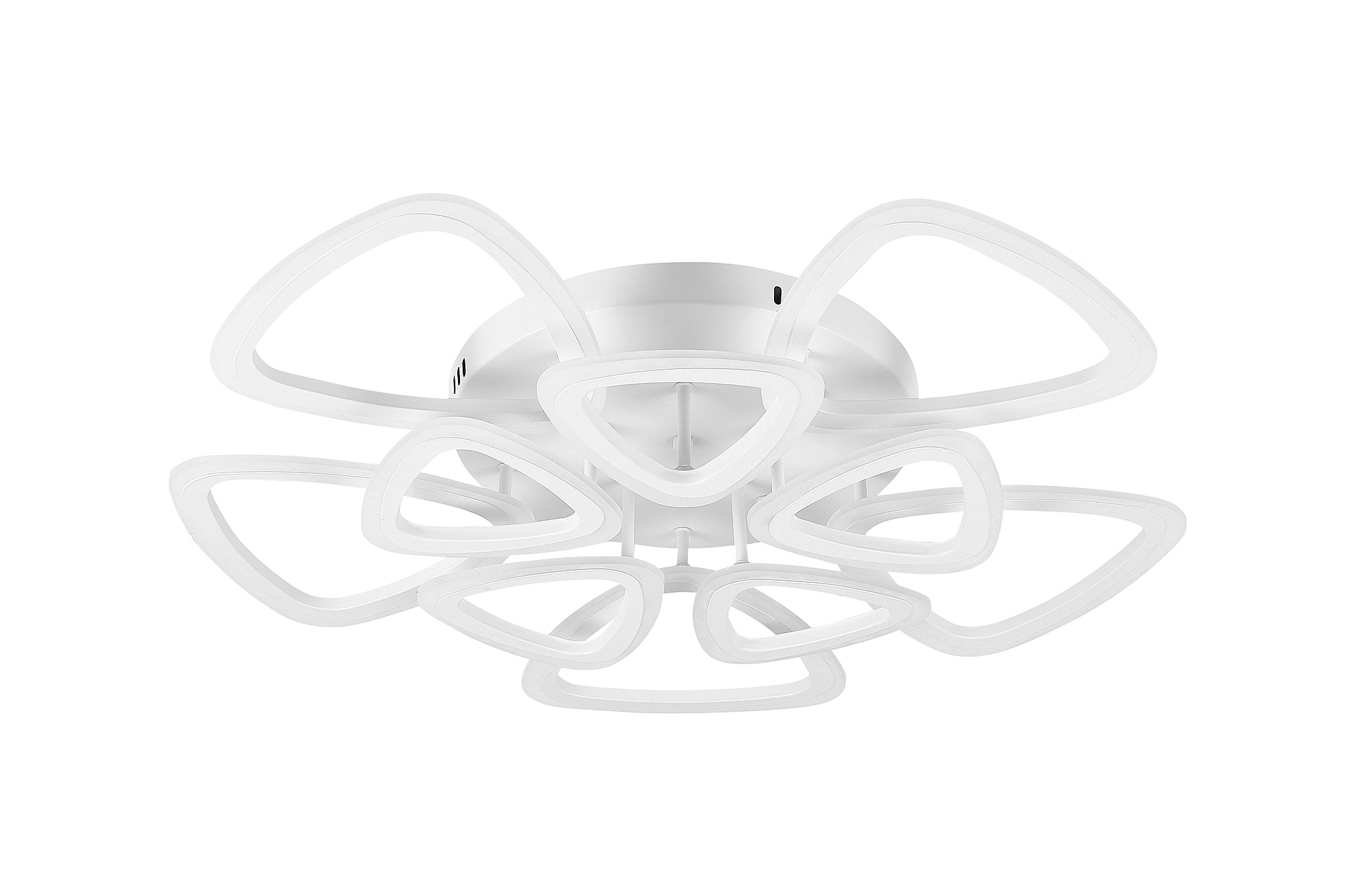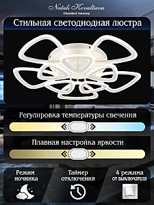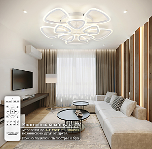 Светодиодный светильник с дистанционным управлением через пульт ДУ, смартфон, планшет. Лицевую часть составляют равноудалённые друг от друга рожки с симметричным дизайнерским узором. По их периметру расположена подсветка, акрил обеспечивает отличное рассеивание света. Дизайн люстры выполнен в современном стиле в белом цвете и отлично подойдёт в любой интерьер. Люстра имеет тёплый, естественный и холодный свет с регулировкой температуры свечения от 3000 до 6500 K. Обладает плавной настройкой яркости в диапазоне от 10% до 100%. Имеется режим ночника и таймер отключения. От стандартного выключателя люстра имеет 4 режима свечения. Данные функции делают светильник оптимальным в процессе использования. Общая мощность 200W со световым потоком 1400 lm позволяет осветить до 32 кв.м. Он прост в сборке, установке и экономичен в обслуживании. Люстра подойдёт для всех видов потолков. Степень защиты 20 IP.