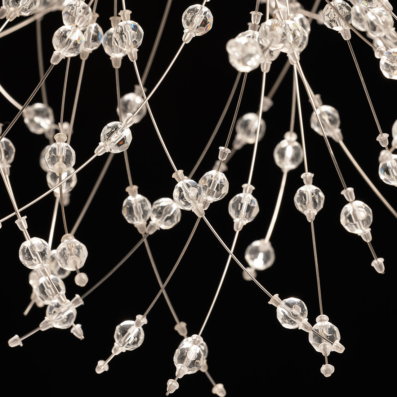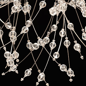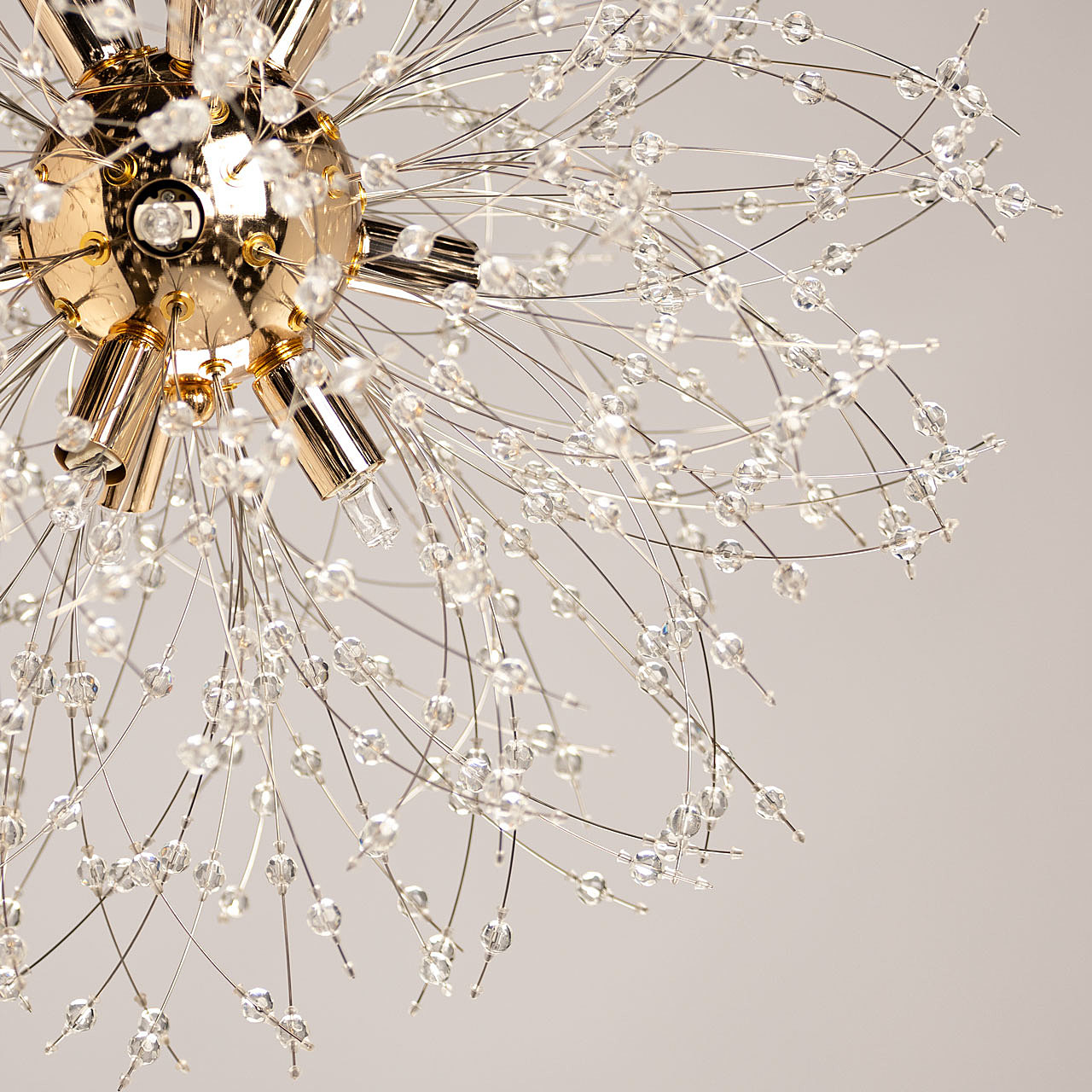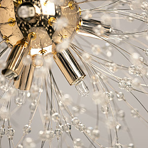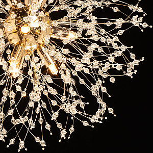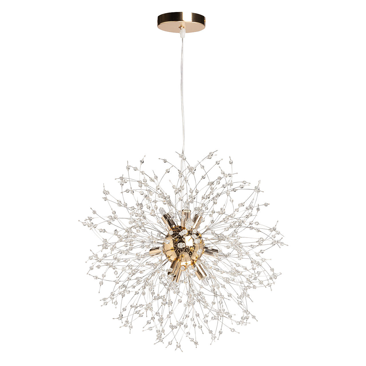 Оригинальный дизайн подвесной люстры привлекает к себе внимание. Цвет золота прекрасно сочетается с хрустальным декором. Бусины из прозрачного хрусталя, нанизанные на стальные нити, создают легкий и воздушный дизайн. Люстра станет прекрасным дополнением к любому интерьеру. Регулируемый подвес позволяет устанавливать комфортную высоту. Заменяемые источники света удобны в эксплуатации. Металлическое основание светильника гальванизировано в цвет золота. Люстра декорирована прозрачными хрустальными бусинами.