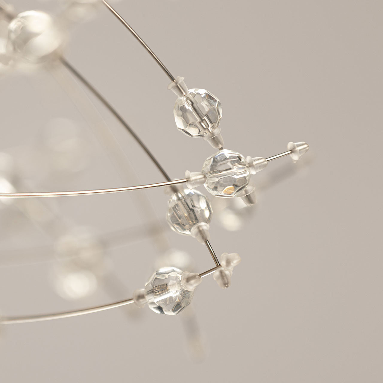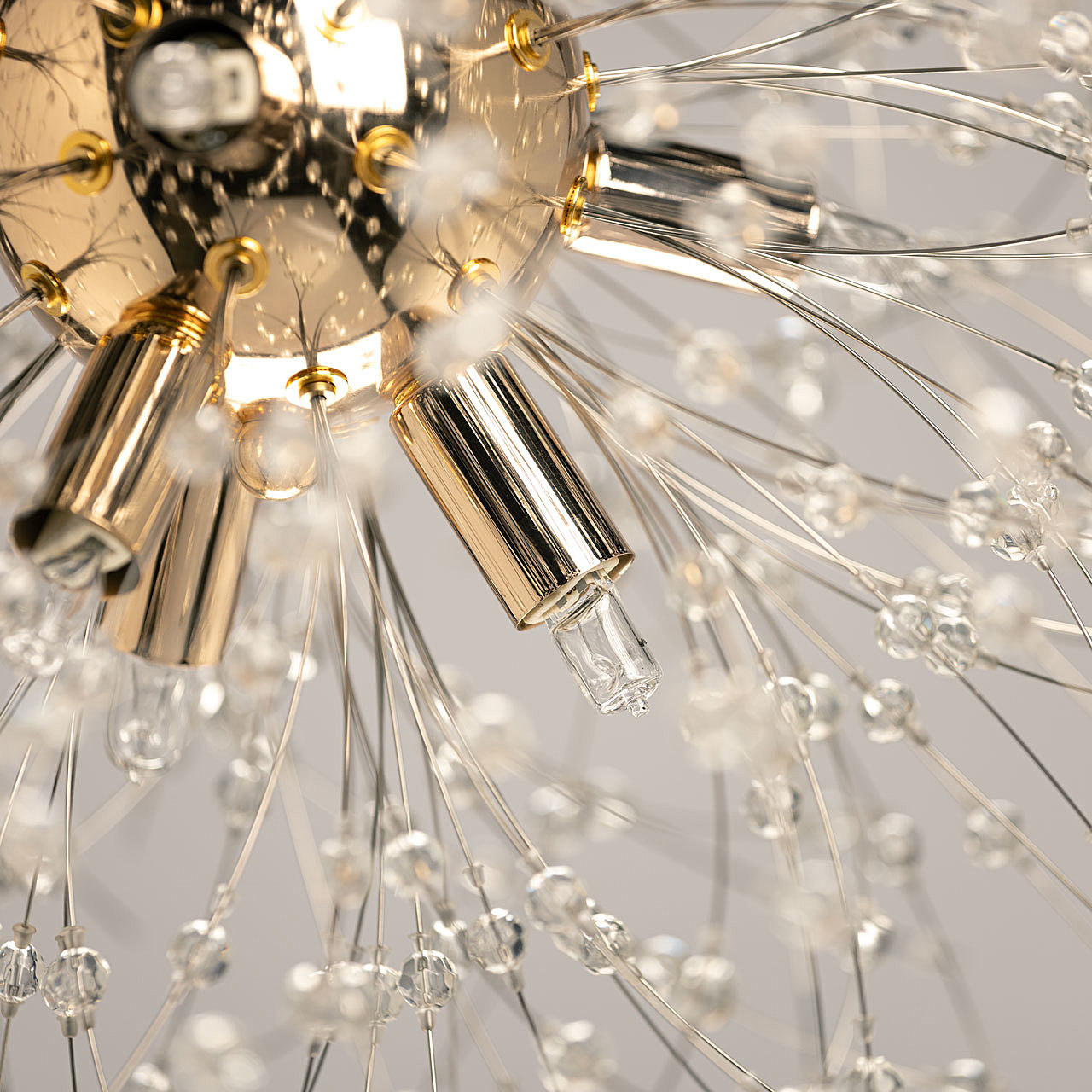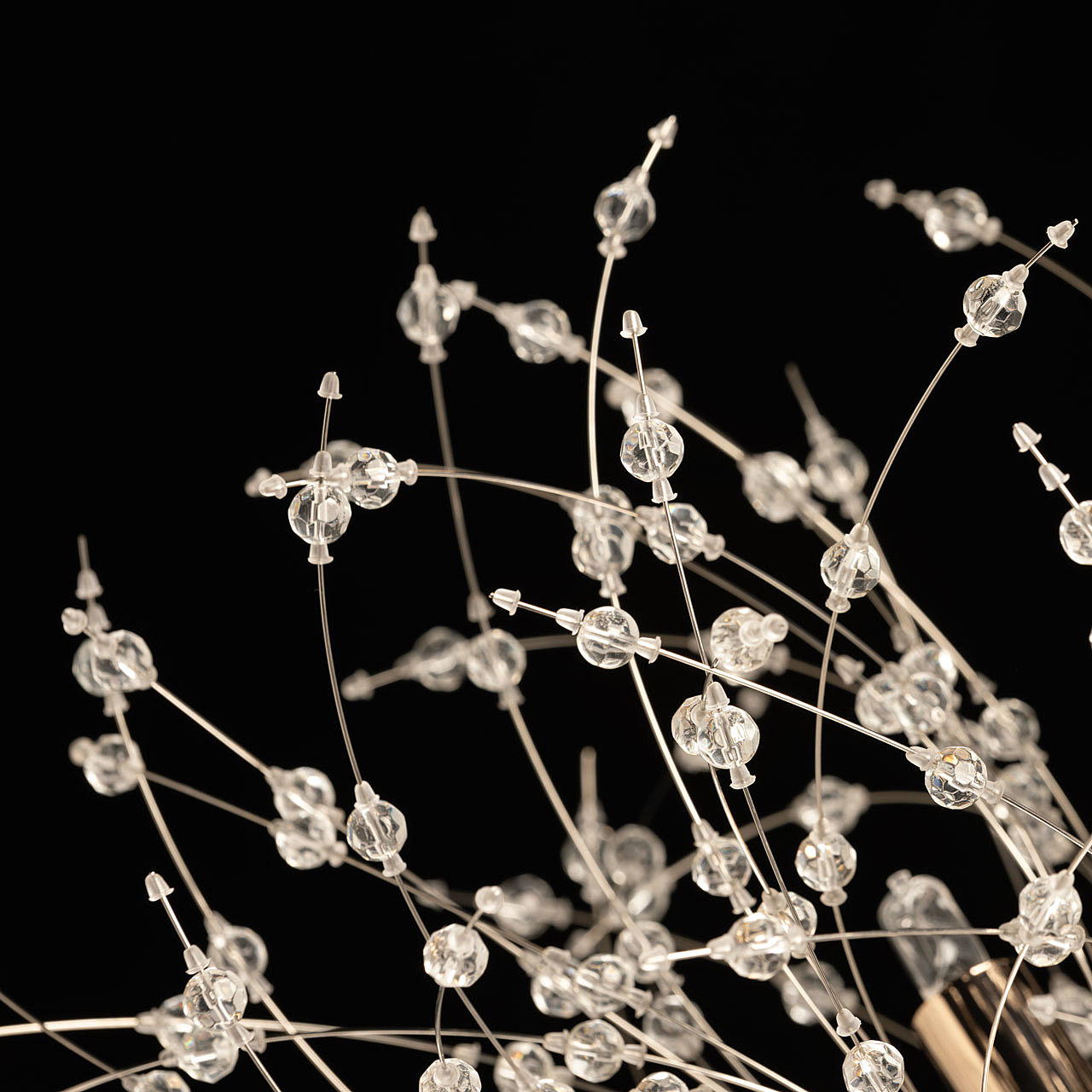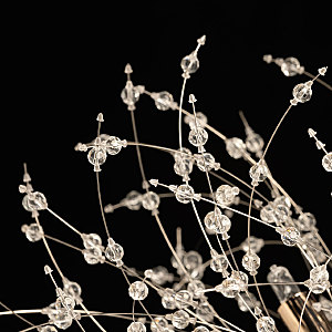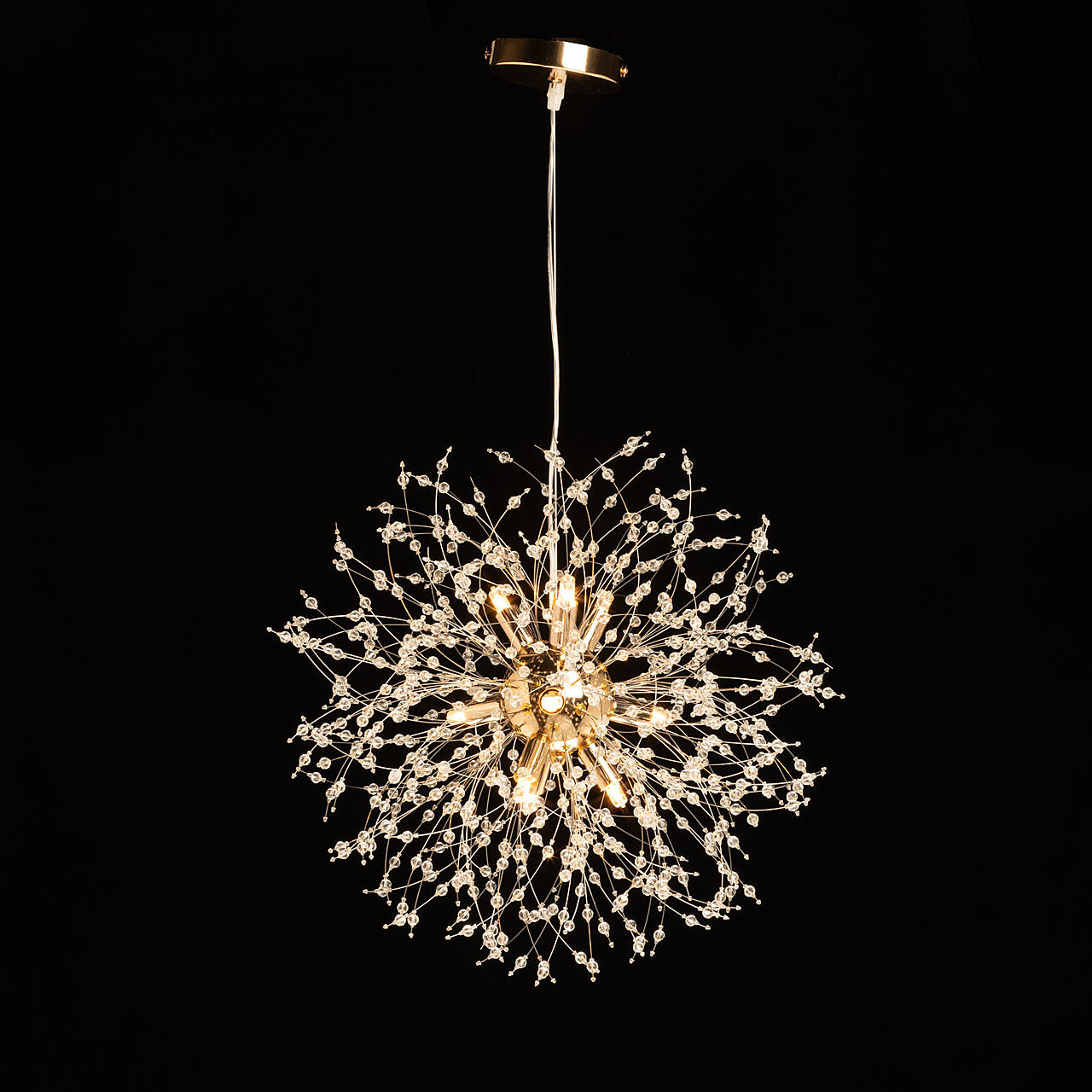 Оригинальный дизайн подвесной люстры привлекает к себе внимание. Цвет золота прекрасно сочетается с хрустальным декором. Бусины из прозрачного хрусталя, нанизанные на стальные нити, создают легкий и воздушный дизайн. Люстра станет прекрасным дополнением к любому интерьеру. Регулируемый подвес позволяет устанавливать комфортную высоту. Заменяемые источники света удобны в эксплуатации. Металлическое основание светильника гальванизировано в цвет золота. Люстра декорирована прозрачными хрустальными бусинами.