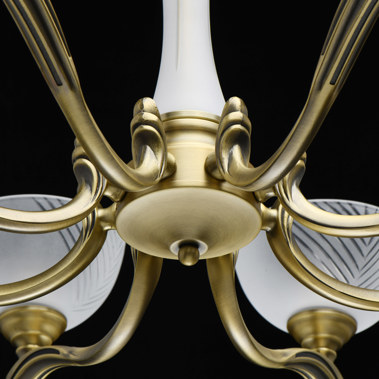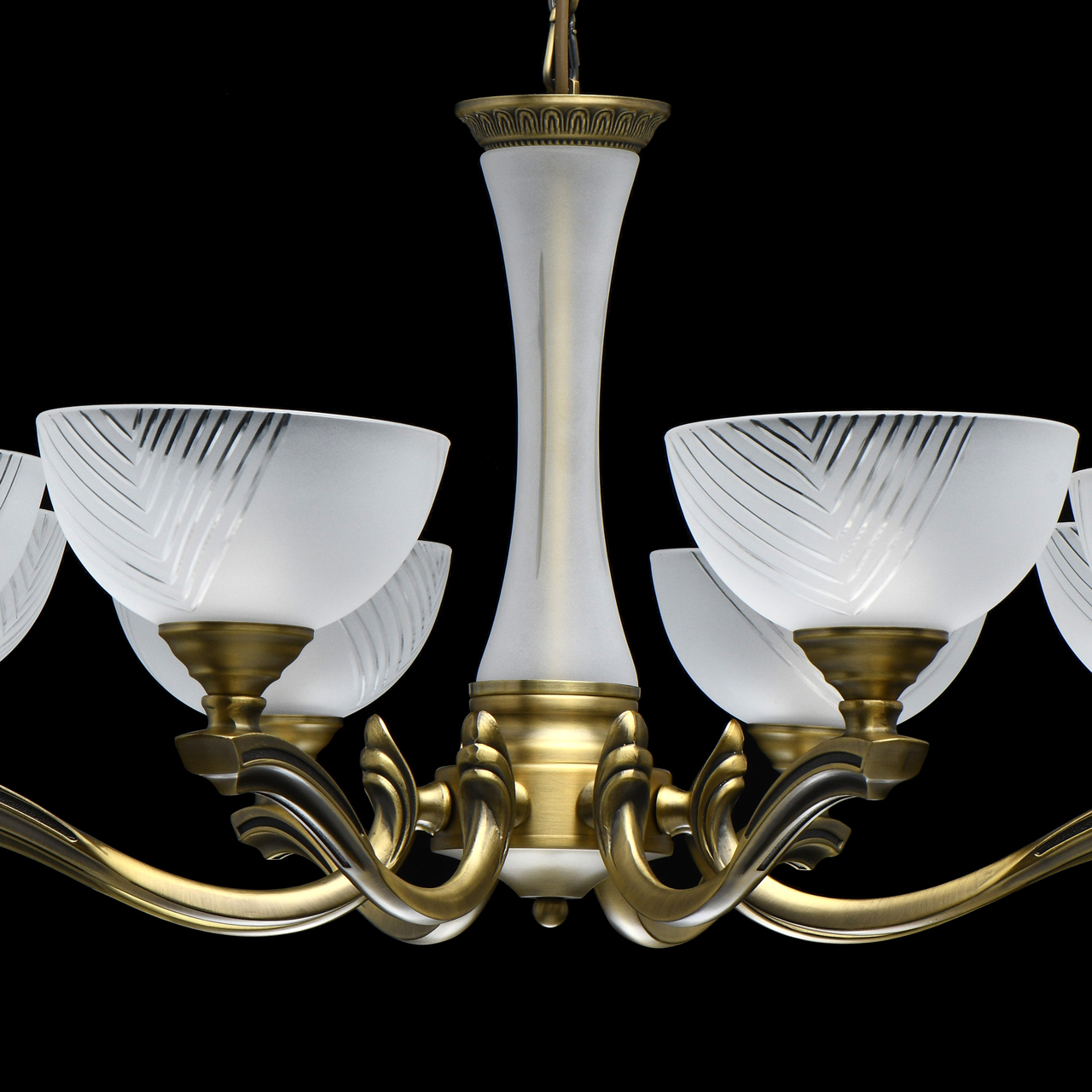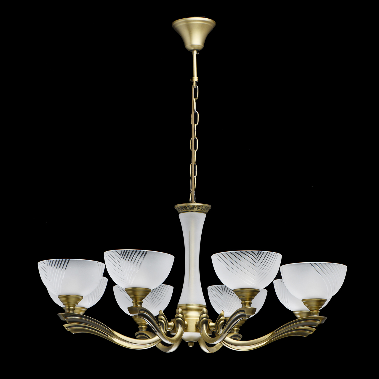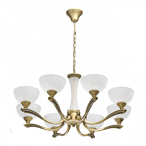 Классическая форма парадной люстры из благородной латуни.Элегантный стеклянный декор центральной оси с алмазной гранью.Плафоны матового стекла с алмазной гранью мягко рассеивают свет.Возможность регулировать высоту светильника за счет звеньев цепи.Расширенная семья из бра, настольного света, подвесов на 5, 8 и 9 ламп и потолочного светильника.