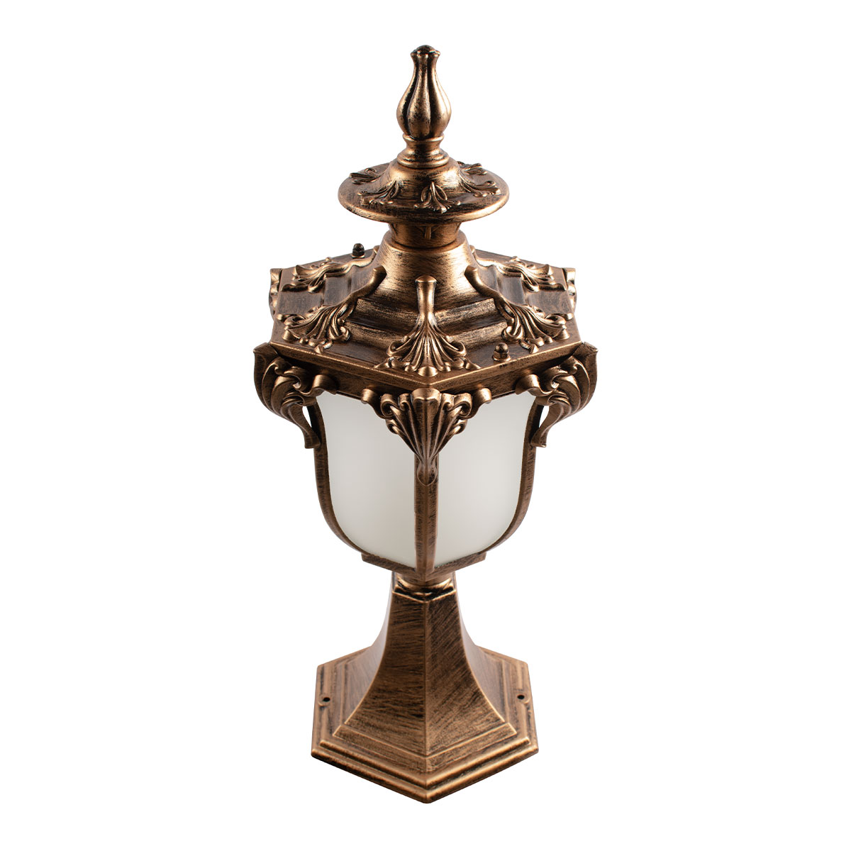 Допускается отличие страны-изготовителя, указанной в характеристиках. Линии производства могут находиться в нескольких государствах. Это не влияет на качество изготовления товара: все заводы данного бренда работают по общим стандартам, а готовые изделия проходят соответствующий контроль.Испания Коллекция Alessano ЦветЦвет арматуры Бронза Цвет Бронза Материал арматуры Металл Цвет плафона бронза Материал плафона Стекло РазмерыВысота (мм) 430 Диаметр (мм) 200 Ширина (мм) 200 ЭлектрикаКоличество ламп (шт) 1 Цоколь E27 Мощность лампы (Вт) 100 Общая мощность (Вт) 100 Напряжение (В) 220 Дополнительная информацияСтепень защиты (IP) IP55 Место установки на пол Вес (Кг) 0.9 -