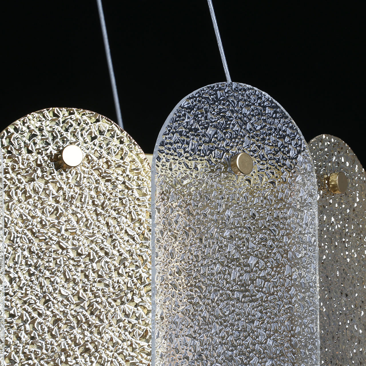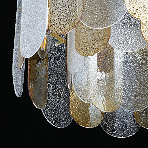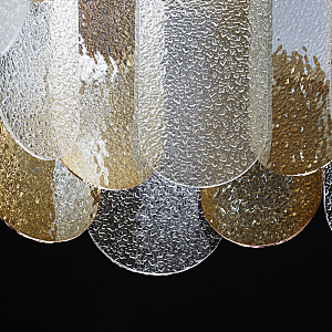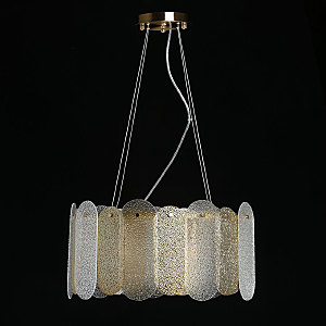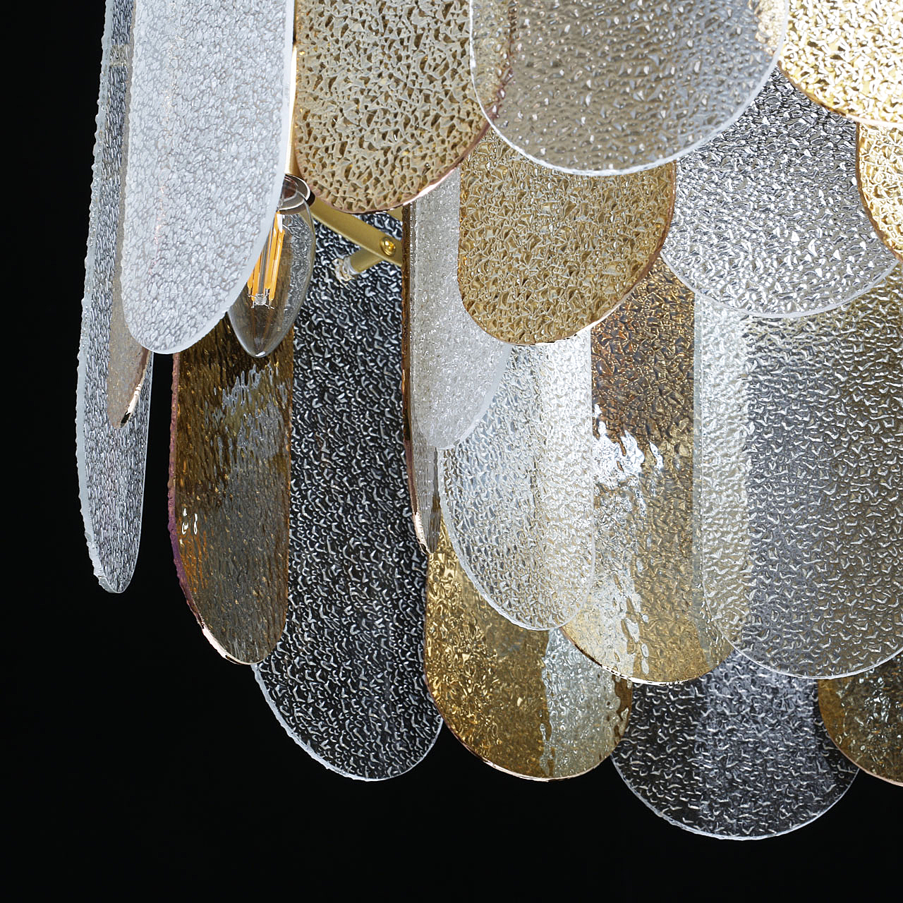 Подвесной светильник в современном дизайне хорошо подойдет в гостиную и спальню. Модный цвет бронзы сохраняет свою актуальность. Декор из фактурных стеклянных пластин обеспечивает комфортное освещение. Сочетание прозрачного стекла и стекла цвета шампань создает красивый свет.Подвесы в виде тросов позволяют устанавливать комфортную высоту. Заменяемые источники света удобны в эксплуатации.