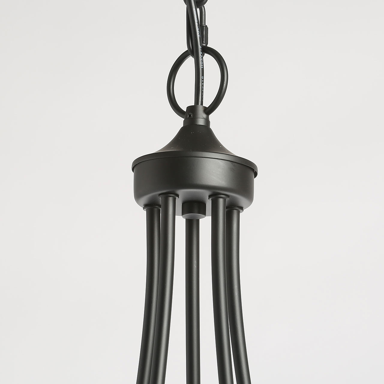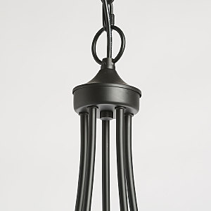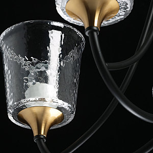 Металлическое основание окрашено в черный цвет. Отдельные элементы основания гальванизированы в цвет бронзы. Светильник декорирован плафонами из прозрачного фактурного стекла.