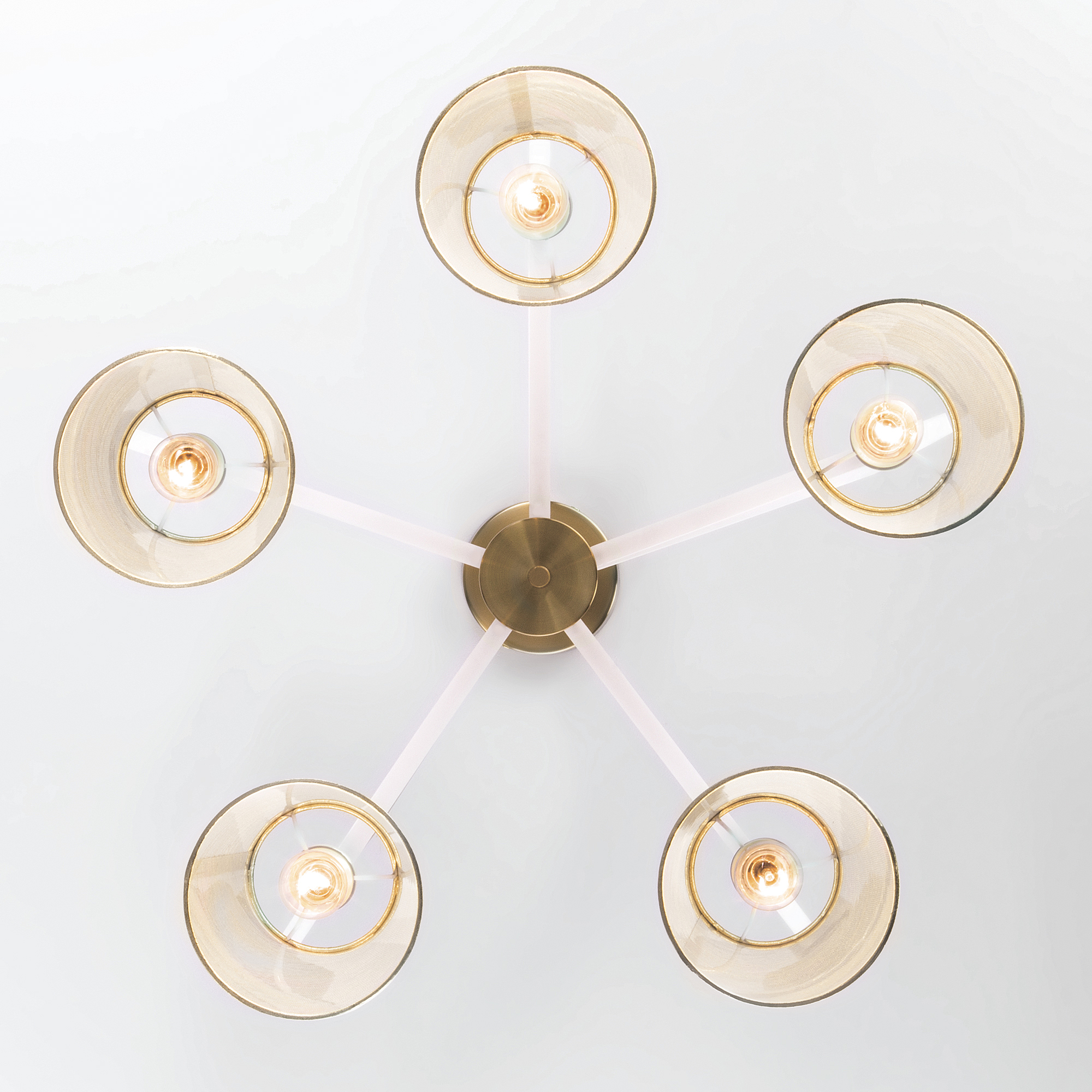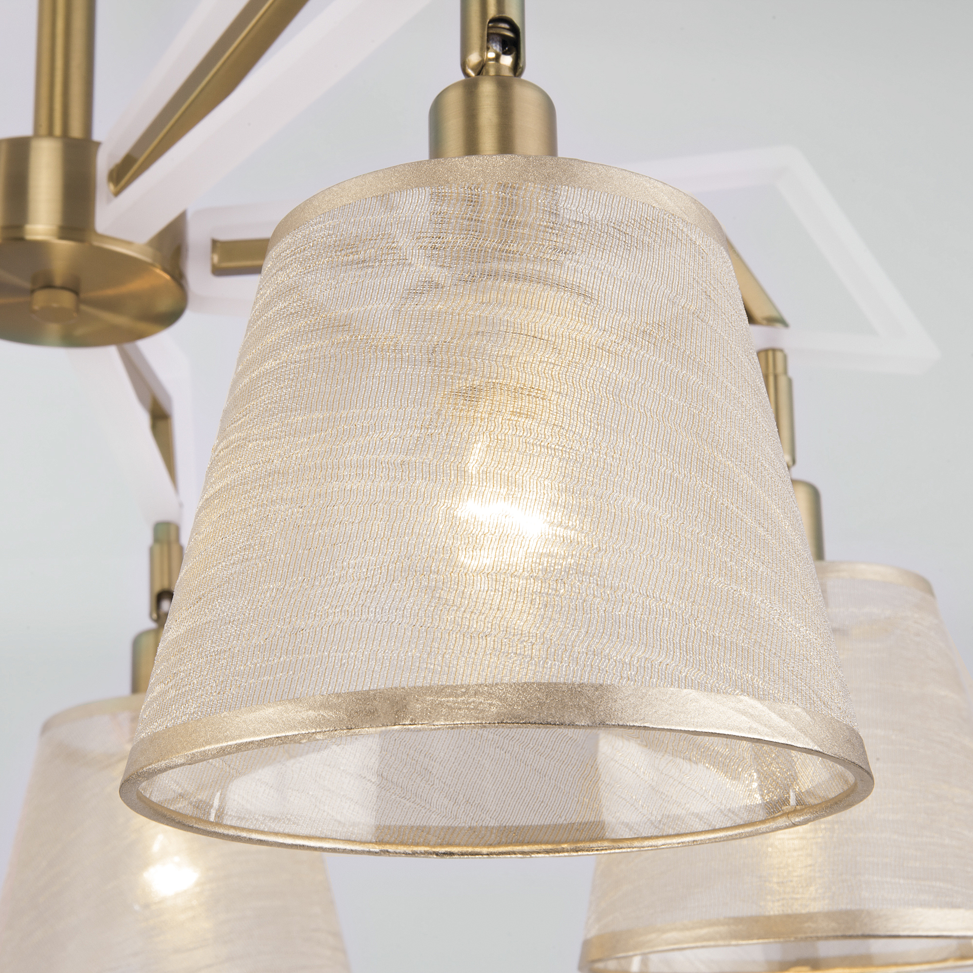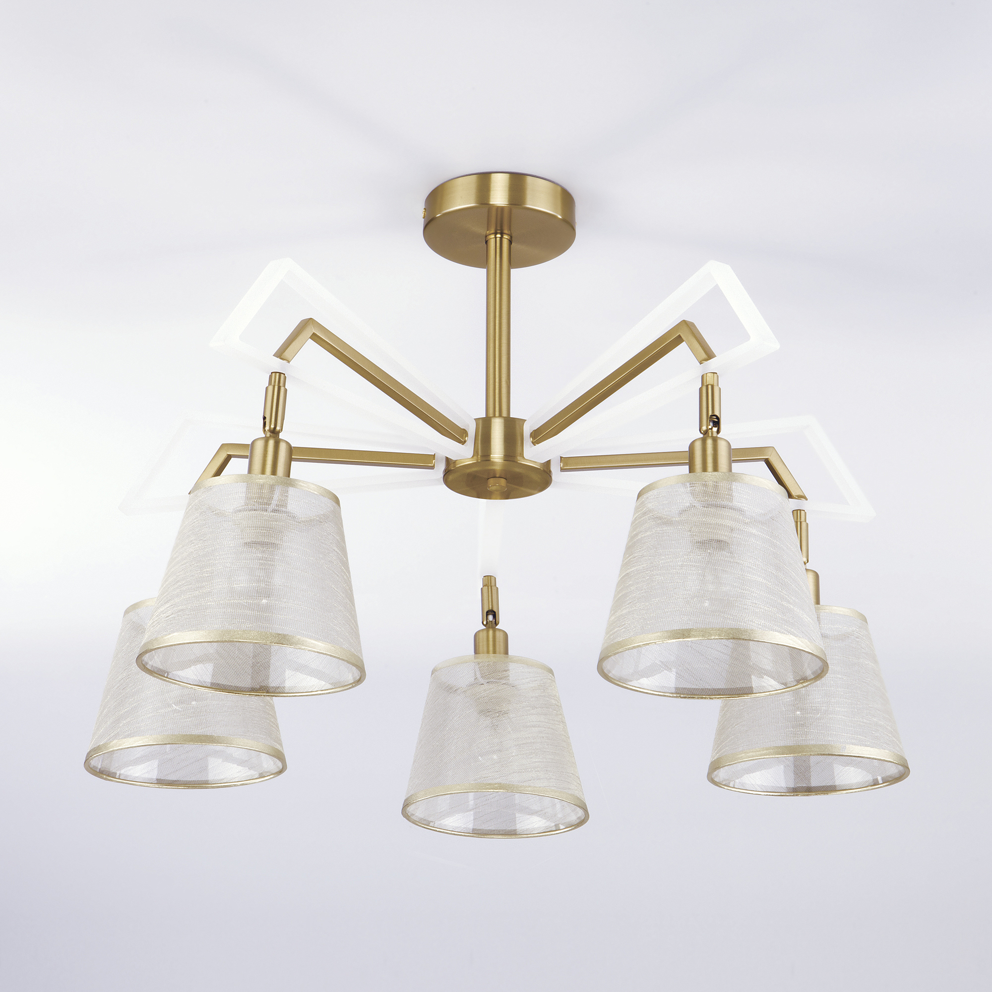 Допускается отличие страны-изготовителя, указанной в характеристиках. Линии производства могут находиться в нескольких государствах. Это не влияет на качество изготовления товара: все заводы данного бренда работают по общим стандартам, а готовые изделия проходят соответствующий контроль.Китай Коллекция Alicante ЦветЦвет арматуры золотая бронза Цвет Бронза Материал арматуры Металл Цвет плафона золотистый Материал декора Акрил Материал плафона Ткань РазмерыВысота (мм) 410 Длина (мм) 640 Ширина (мм) 640 ЭлектрикаКоличество ламп (шт) 5 Цоколь E14 Мощность лампы (Вт) 40 Напряжение (В) 220 Площадь освещения 14 Дополнительная информацияСпособ крепления Планка Степень защиты (IP) IP20 -