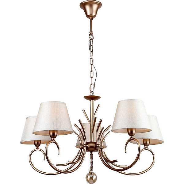 Люстра подвесная 1006/03/05P Stilfort серии Ameli - воплощение классического стиля. Арматура, изготовленная из металла в цвете "матовое золото", украшена подвесным стеклянным элементом. Плафоны люстры выполнены из поливинилхлорида в нежном кремовом цвете.