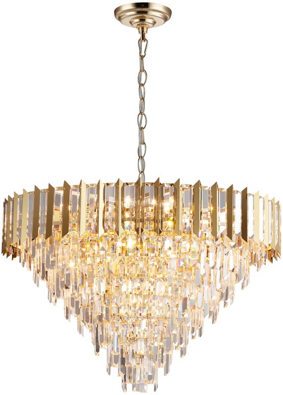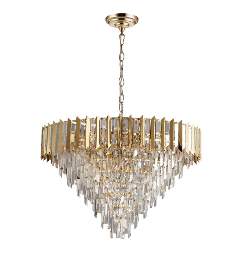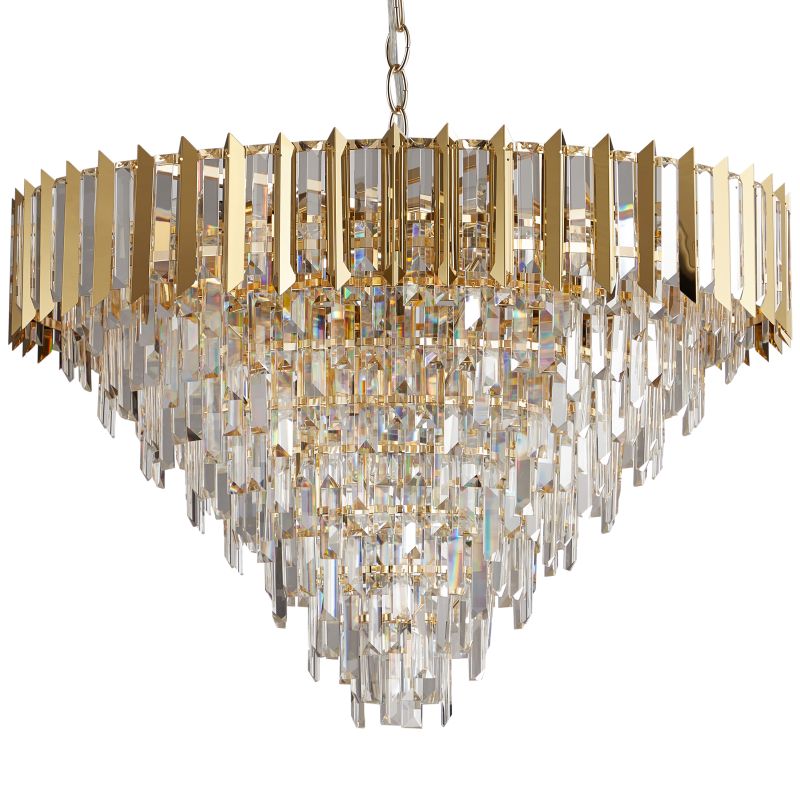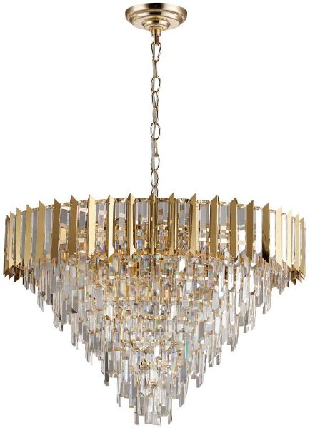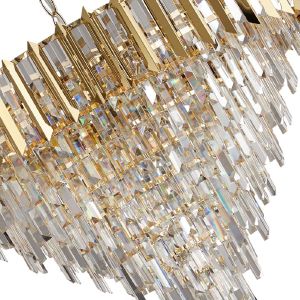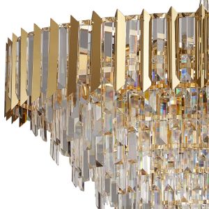 Люстра подвесная из коллекции Amman выполнена из металла, гальванизированного в цвет золота, и декорирована прозрачным хрусталем прямоугольной формы. Верхний ярус люстры дополнительно оформлен вставками из нержавеющей стали, гальванизированной в цвет арматуры.