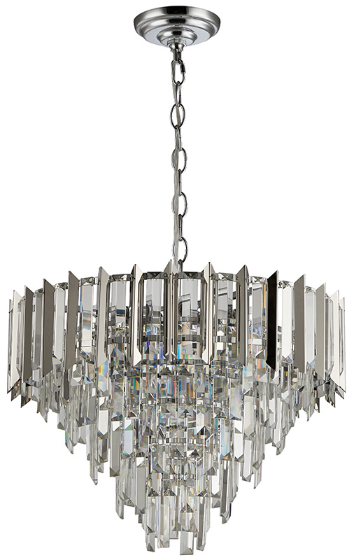 Люстра подвесная из коллекции Amman выполнена из металла, гальванизированного в цвет хрома, и декорирована прозрачным хрусталем прямоугольной формы. Верхний ярус люстры дополнительно оформлен вставками из нержавеющей стали, гальванизированной в цвет арматуры.