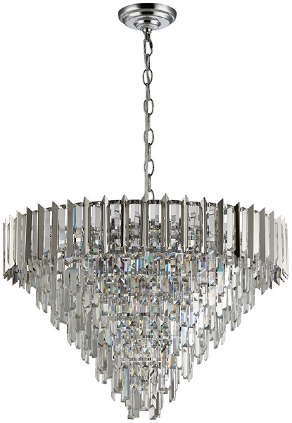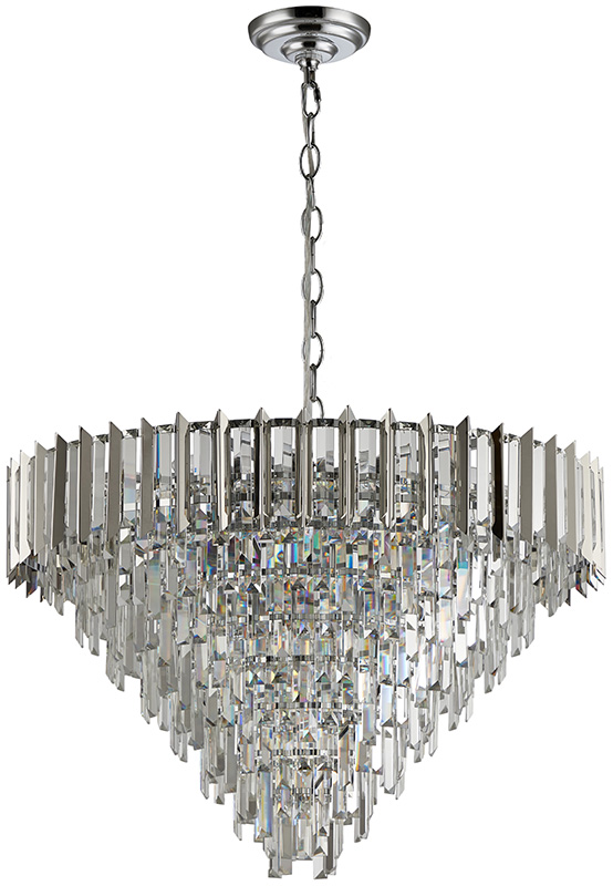Люстра подвесная из коллекции Amman выполнена из металла, гальванизированного в цвет хрома, и декорирована прозрачным хрусталем прямоугольной формы. Верхний ярус люстры дополнительно оформлен вставками из нержавеющей стали, гальванизированной в цвет арматуры.