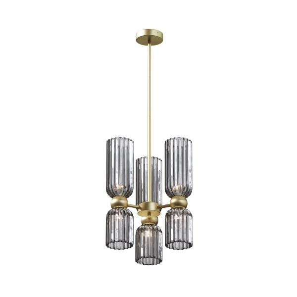 Металлическая арматура в цвете золота. Плафоны стеклянные нескольких цветов: коньячный, дымчатый, белый, серый. Источник света: цоколь Е14. Высота регулируется сегментами штанги или с помощью трехметрового провода. Серия применима в помещениях с высокими потолками. Поверхность стеклянных плафонов рифленая, усиливающая световые эффекты.