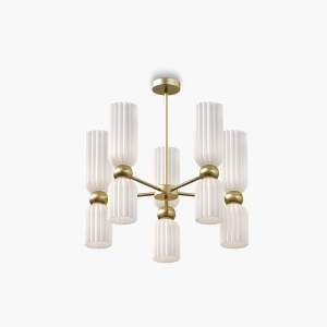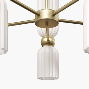Металлическая арматура в цвете золота. Плафоны стеклянные нескольких цветов: коньячный, дымчатый, белый, серый. Источник света: цоколь Е14. Высота регулируется сегментами штанги или с помощью трехметрового провода. Серия применима в помещениях с высокими потолками. Поверхность стеклянных плафонов рифленая, усиливающая световые эффекты.