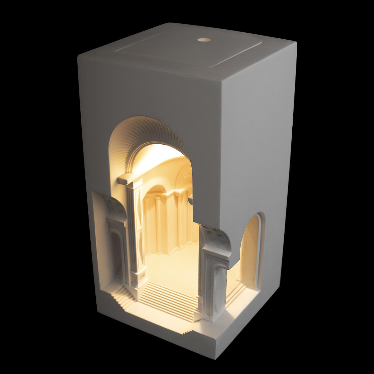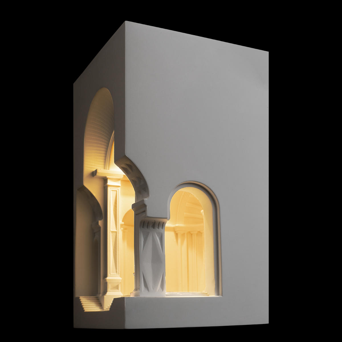 Antique — это встраиваемый гипсовый светильник, выполненный в виде архитектурного фрагмента. Он представляет собой арку с колоннами, статуями и ступенями, ведущими внутрь. Арка украшена рельефными узорами, что придает ей изысканный вид.У светильников элегантный дизайн, создающий впечатление глубины и перспективы. Antique подойдет для тех, кто ценит классический стиль и хочет добавить уникальности в интерьер.