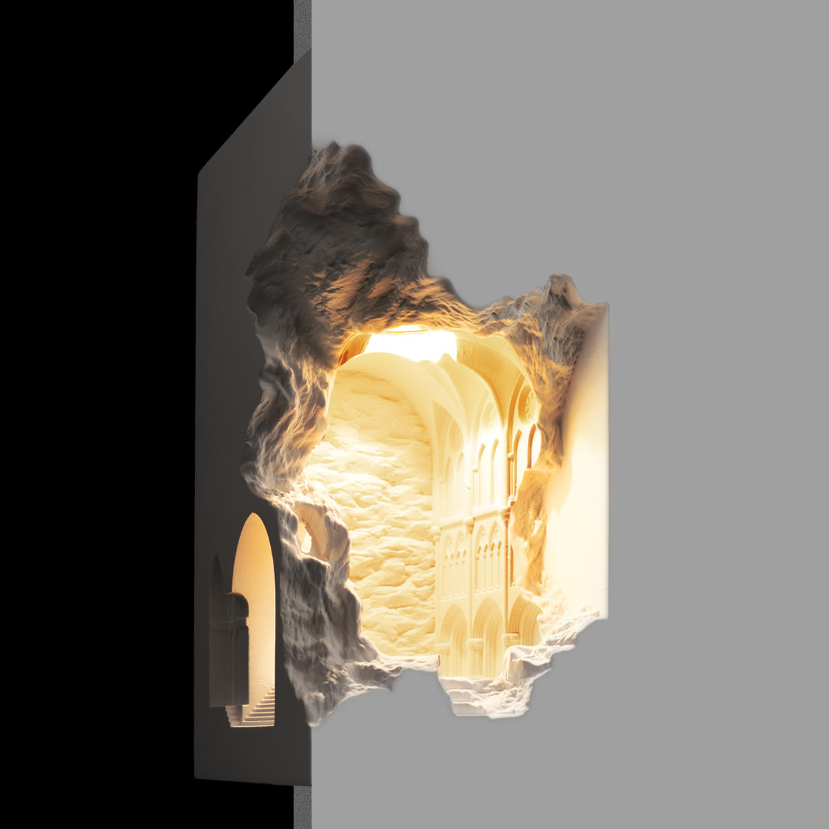 Antique — это встраиваемый гипсовый светильник, выполненный в виде архитектурного фрагмента. Он представляет собой арку с колоннами, статуями и ступенями, ведущими внутрь. Арка украшена рельефными узорами, что придает ей изысканный вид.У светильников элегантный дизайн, создающий впечатление глубины и перспективы. Antique подойдет для тех, кто ценит классический стиль и хочет добавить уникальности в интерьер.