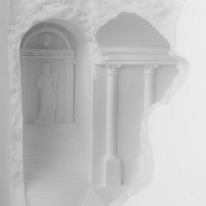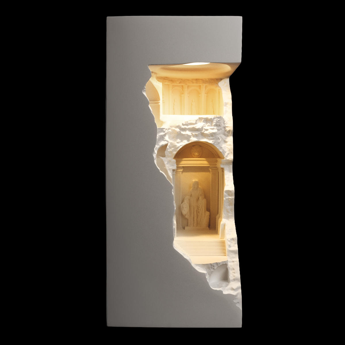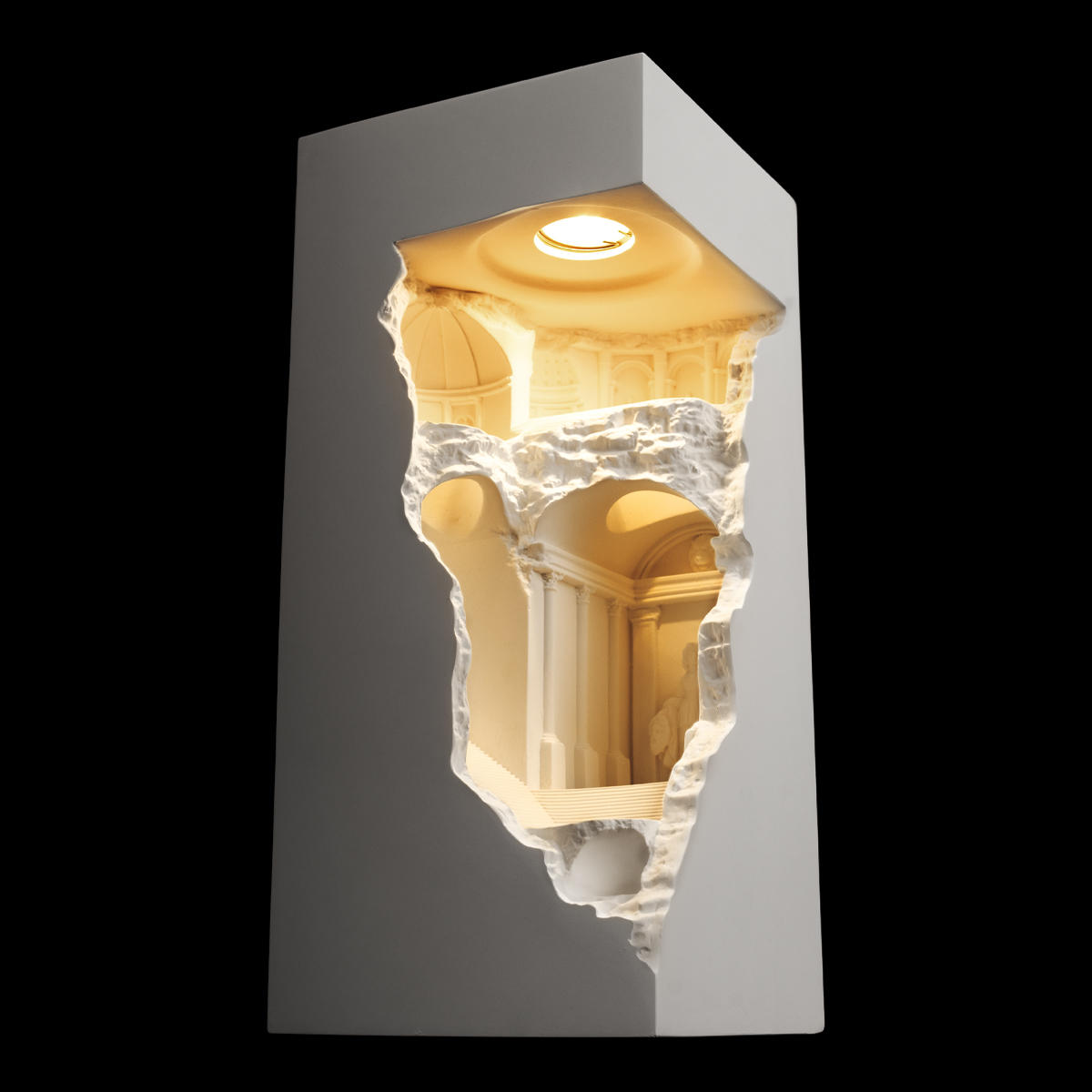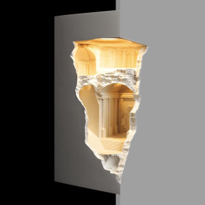 Antique — это встраиваемый гипсовый светильник, выполненный в виде архитектурного фрагмента. Он представляет собой арку с колоннами, статуями и ступенями, ведущими внутрь. Арка украшена рельефными узорами, что придает ей изысканный вид.У светильников элегантный дизайн, создающий впечатление глубины и перспективы. Antique подойдет для тех, кто ценит классический стиль и хочет добавить уникальности в интерьер.