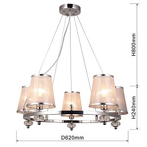 Допускается отличие страны-изготовителя, указанной в характеристиках. Линии производства могут находиться в нескольких государствах. Это не влияет на качество изготовления товара: все заводы данного бренда работают по общим стандартам, а готовые изделия проходят соответствующий контроль.Германия Коллекция Argus ЦветЦвет арматуры Хром Цвет Хром Материал арматуры Металл Цвет декора прозрачный Цвет плафона серебряный Материал декора Хрусталь Материал плафона Органза РазмерыВысота (мм) 1040 Диаметр (мм) 620 Высота минимальная (мм) 240 Ширина (мм) 620 ЭлектрикаКоличество ламп (шт) 5 Цоколь E14 Мощность лампы (Вт) 40 Напряжение (В) 220 Дополнительная информацияСпособ крепления Планка Вес (Кг) 2,6 Тип подвеса На тросах -