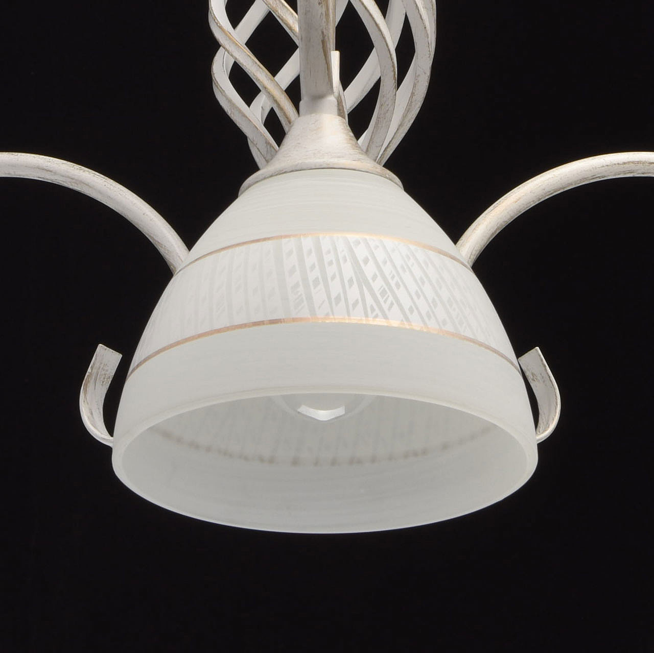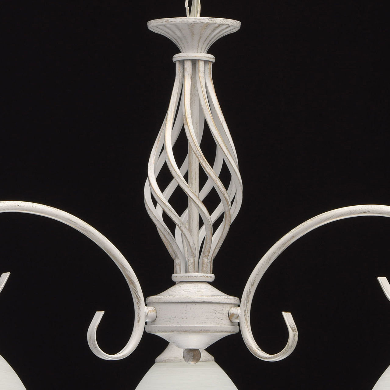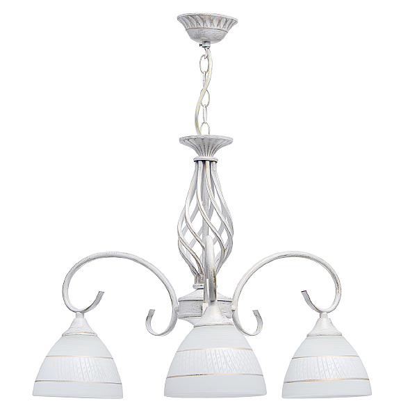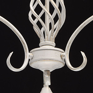 Изящная люстра из коллекции "Ариадна" станет отличным дополнением классических интерьеров. Металлическое основание нежного белого оттенка подчеркнуто эффектом патинирования в цвет золота. В золотом тоне выполнены и полоски на белых стеклянных плафонах. Особый шарм светильнику придает витой декор в центральной части.