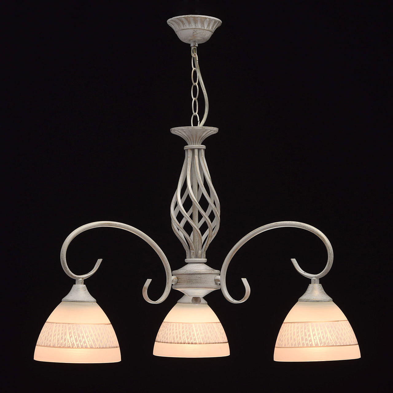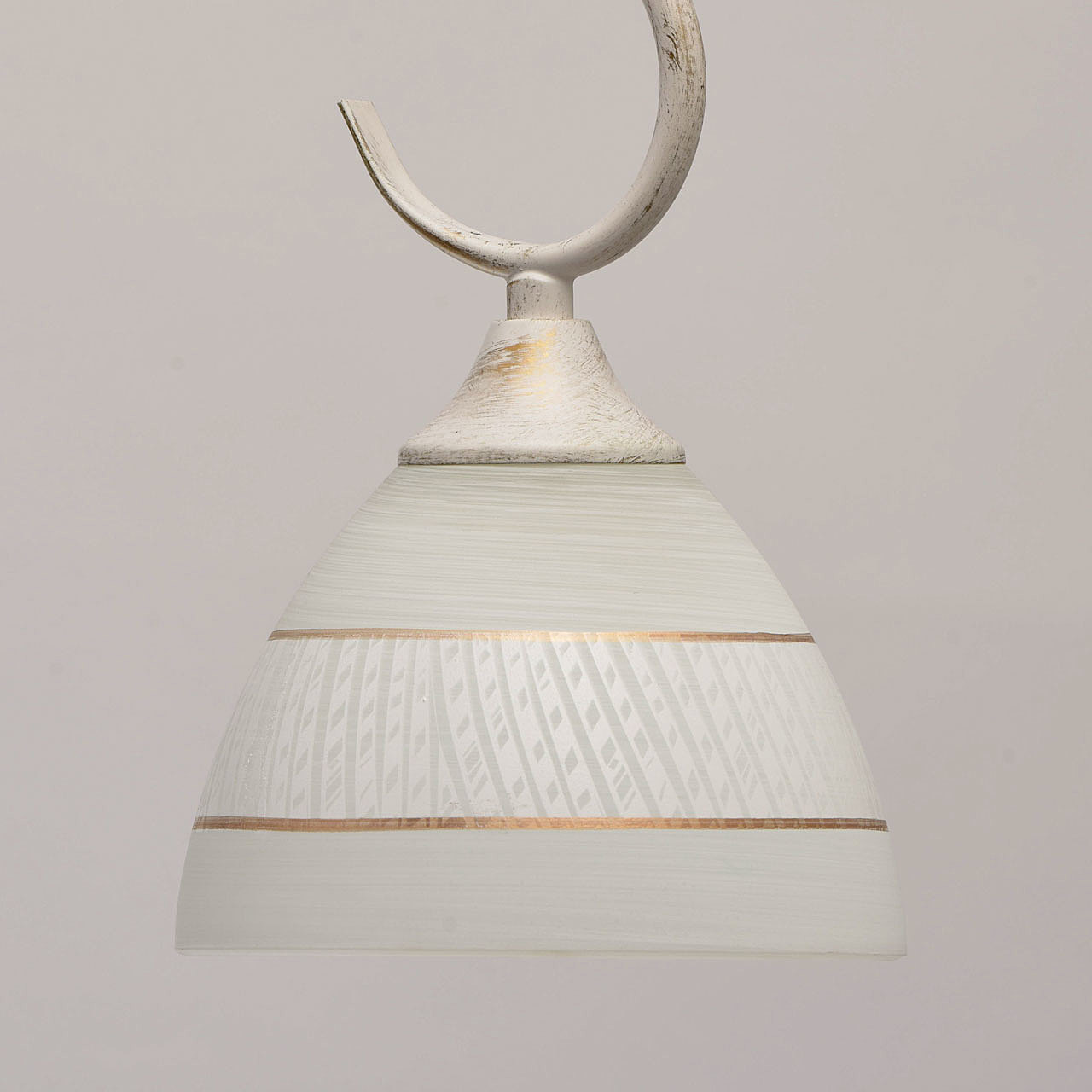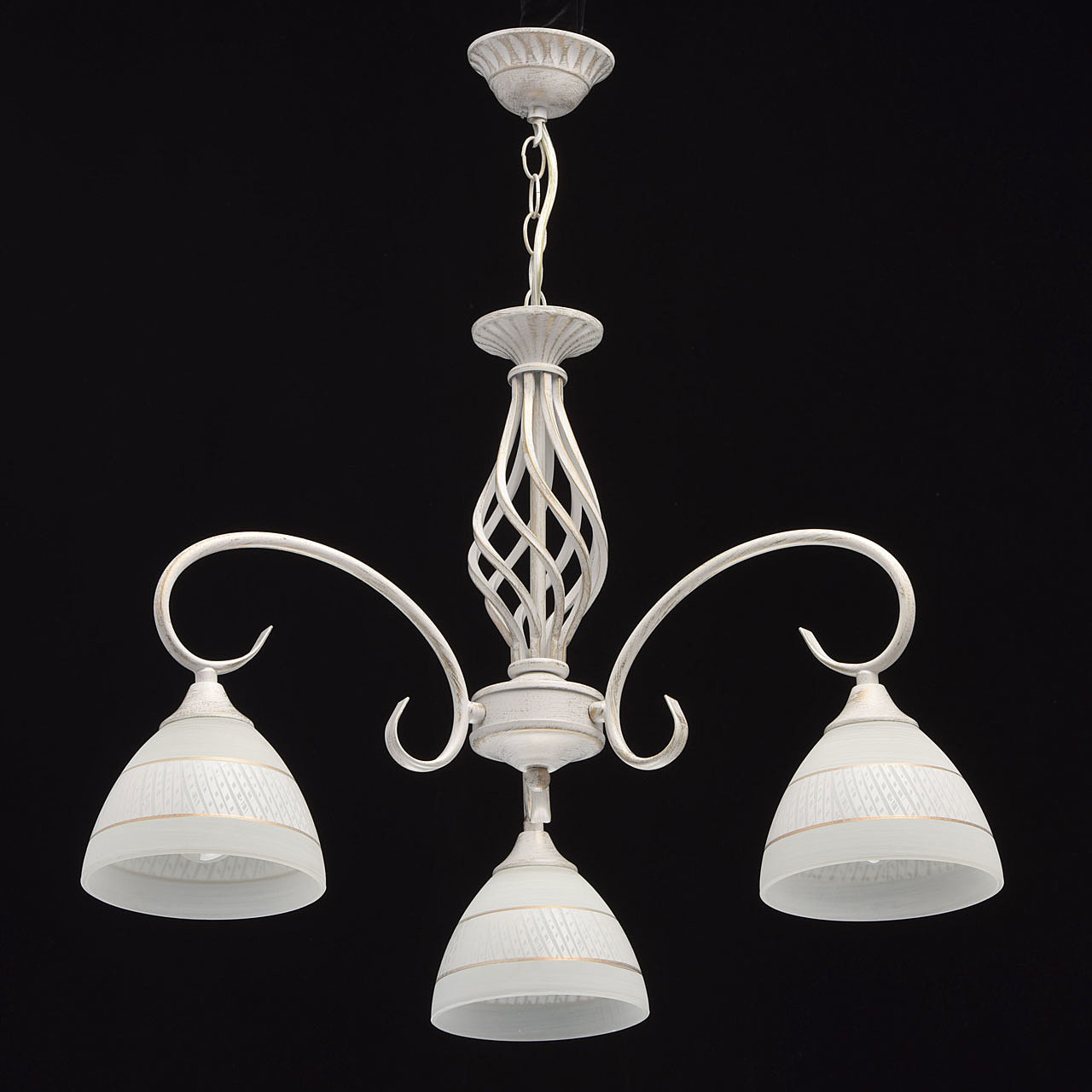 Изящная люстра из коллекции "Ариадна" станет отличным дополнением классических интерьеров. Металлическое основание нежного белого оттенка подчеркнуто эффектом патинирования в цвет золота. В золотом тоне выполнены и полоски на белых стеклянных плафонах. Особый шарм светильнику придает витой декор в центральной части.