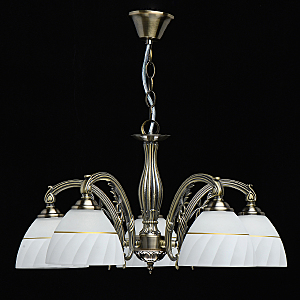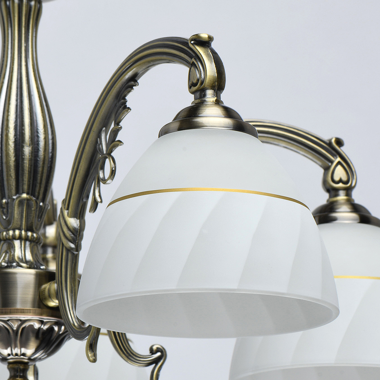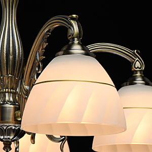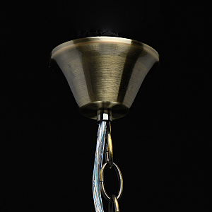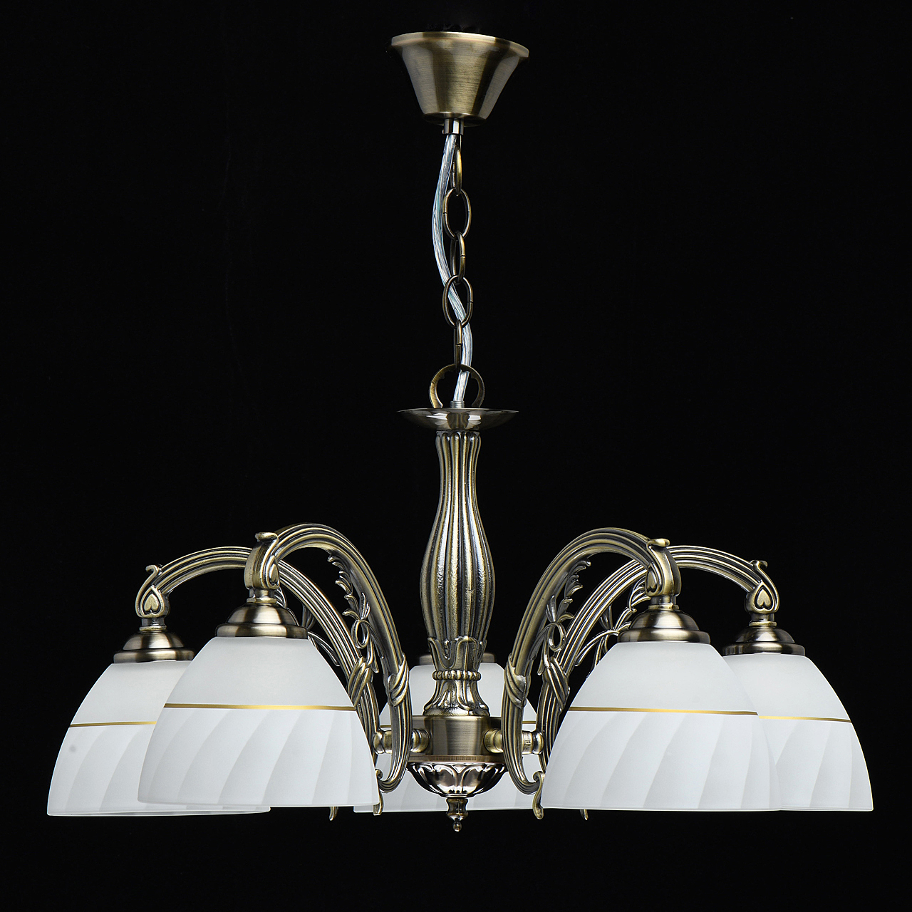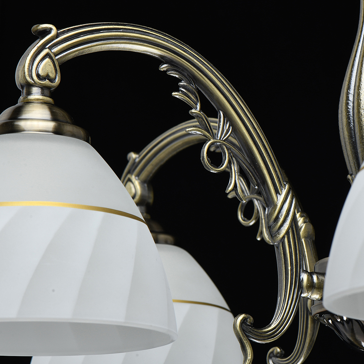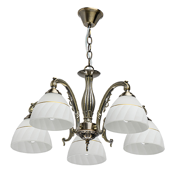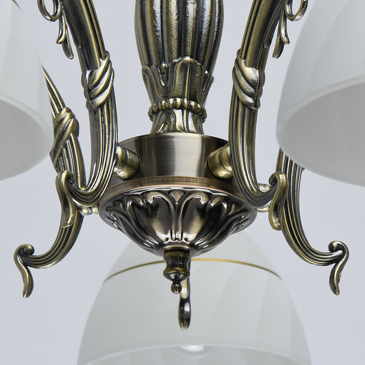 Популярный цвет античной бронзы основания светильника.Белые плафоны с декоративным кантом направлены вниз.Декор из художественного литья на рожках и основания модели.Заменяемые источники света удобны в эксплуатации.Регулирумая высота светильника за счет звеньев цепи.