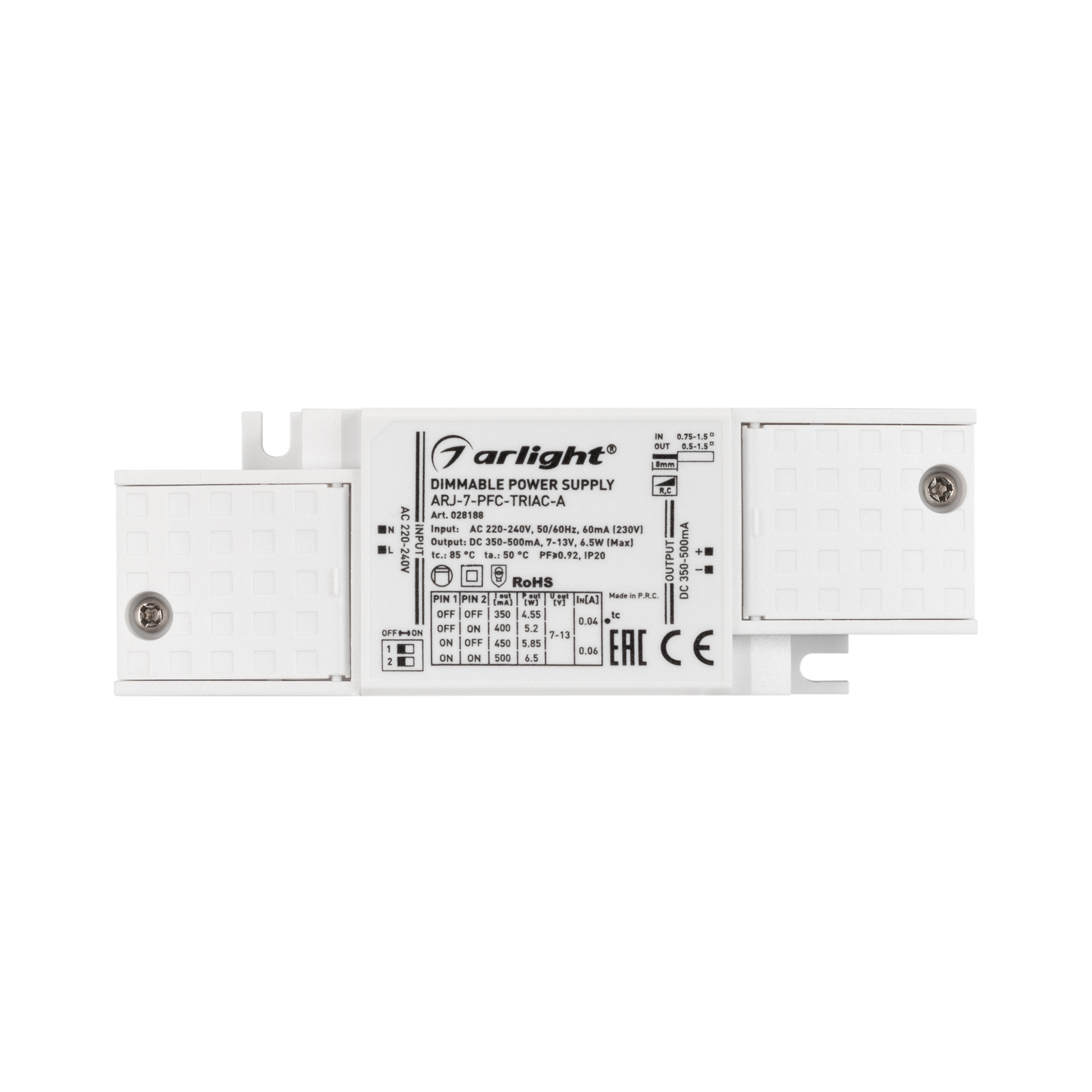 Диммируемый источник тока по стандарту TRIAC с гальванической развязкой для светильников и мощных светодиодов. Входное напряжение 220-240 VAC. Выходные параметры: 7-13 В, 350-500 mА, 6.5 Вт. Выбор значения тока осуществляется DIP-переключателем. Встроенный PFC >0,92. Негерметичный пластиковый корпус IP 20. Габаритные размеры длина 122 мм, ширина 41 мм, высота 23 мм. Гарантийный срок 5 лет.