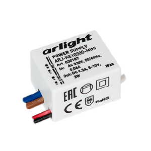 Источник тока с гальванической развязкой для светильников и мощных светодиодов. Входное напряжение 220-240 VAC. Выходные параметры: 5-10 В, 300 mА, 3 Вт. Встроенный PFC >0.4. Негерметичный пластиковый корпус IP 20. Габаритные размеры длина 34 мм, ширина 22.8 мм, высота 17 мм. Гарантийный срок 5 лет.