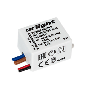 Источник тока с гальванической развязкой для светильников и мощных светодиодов. Входное напряжение 220-240 VAC. Выходные параметры: 1,8-4 В, 700 mА, 2,8 Вт. Встроенный PFC >0.4. Негерметичный пластиковый корпус IP 20. Габаритные размеры длина 34 мм, ширина 22.8 мм, высота 17 мм. Гарантийный срок 5 лет.