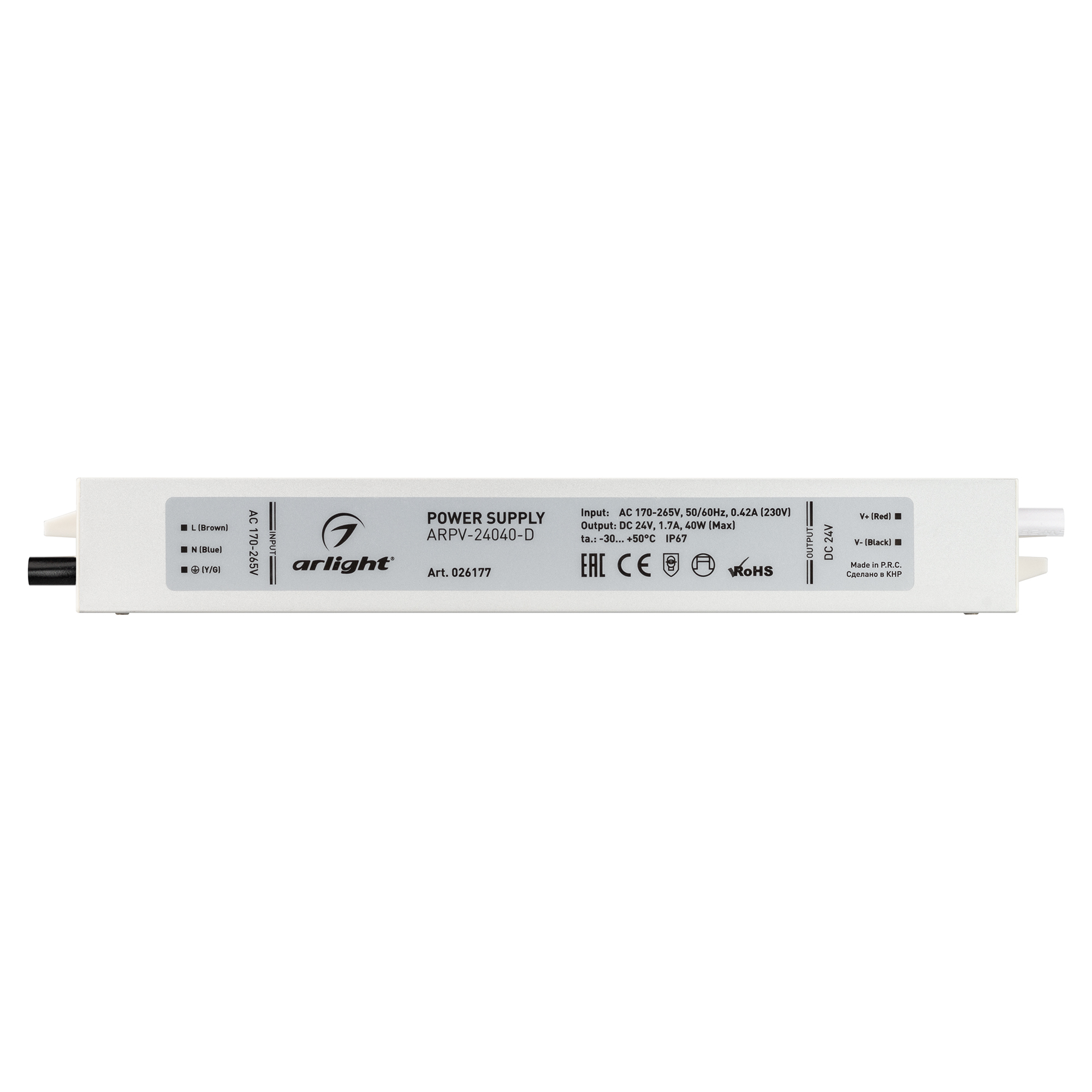 Источник напряжения с гальванической развязкой для светодиодных изделий. Входное напряжение 170-265 VAC. Выходные параметры: 24 В, 1,7 А, 40 Вт. Встроенный PFC >0,5. Герметичный алюминиевый корпус IP 67. Рабочая температура -30…+50C⁰. Габаритные размеры длина 217 мм, ширина 30 мм, высота 20 мм. Гарантийный срок 3 года.