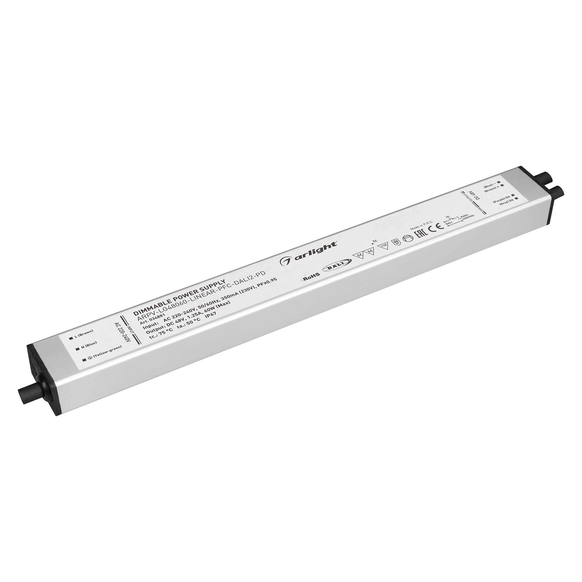 Диммируемый блок питания 48V с гальванической развязкой, ток 1.25А, 60Вт, с управлением DALI, c функцией PUSH-DIM, с корректором мощности, PF>0,95. Тонкий металлический корпус IP67. Вход: 220-240VAC. Выход: 48VDC, ШИМ 1кГц. Размер 290х30х21 mm.. Соответствует требованиям EMC. Гарантия 5 лет.