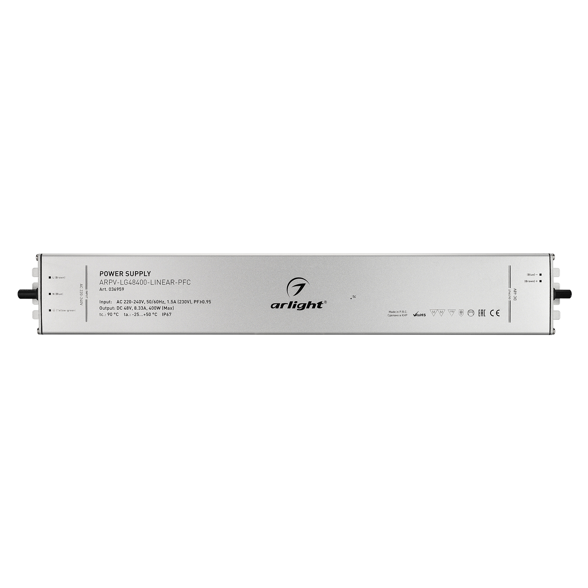 Источник напряжения с гальванической развязкой для светодиодных изделий. Входное напряжение 220-240 VAC. Выходные параметры: 48 В, 8.33 А, 400 Вт. Встроенный PFC >0.95. Тонкий металлический корпус IP67. Вход: 220-240VAC. Выход: 48VDC. Размер 400х60х22 mm.. Совместимость со стандартом EMC. Гарантия 5 лет.