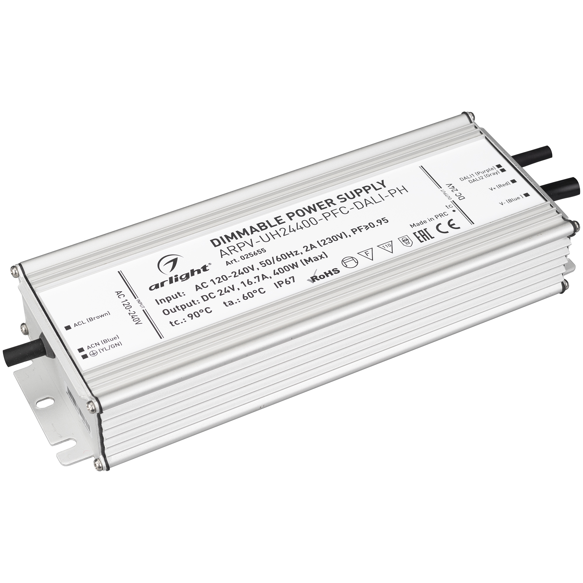 Диммируемый источник напряжения по протоколу DALI с гальванической развязкой для светодиодных изделий. Входное напряжение 120-240 VAC. Выходные параметры: 24 В, 16.7 А, 400 Вт. Встроенный PFC >0.95. Герметичный алюминиевый корпус IP 67. Рабочая температура -40…+70C⁰. Габаритные размеры длина 251 мм, ширина 90 мм, высота 41.5 мм. Гарантийный срок 7 лет.