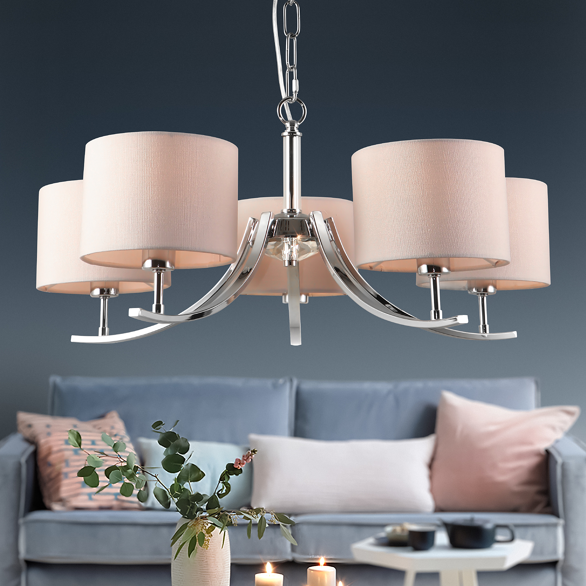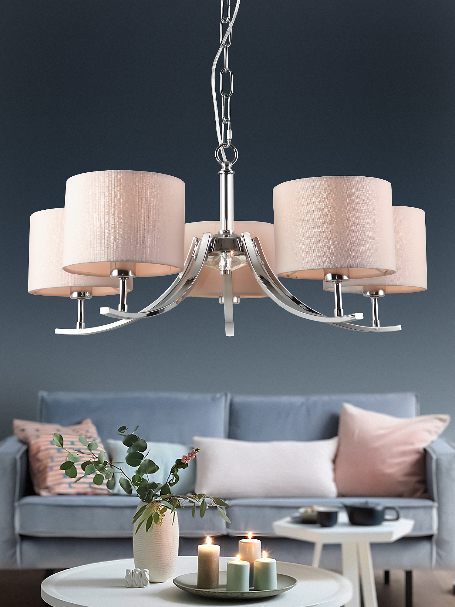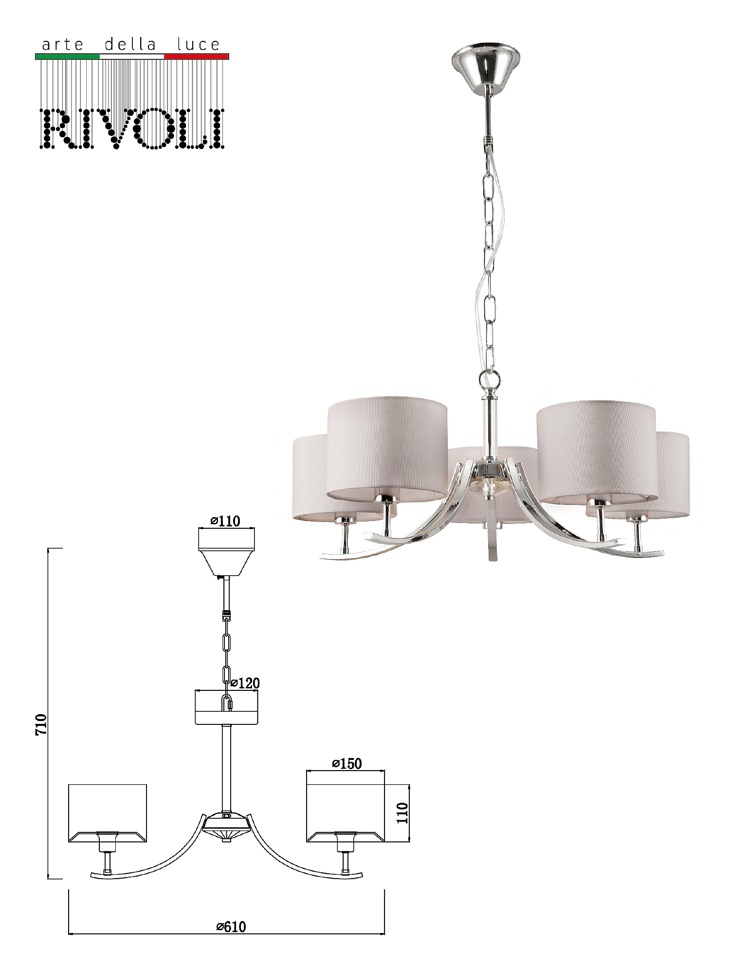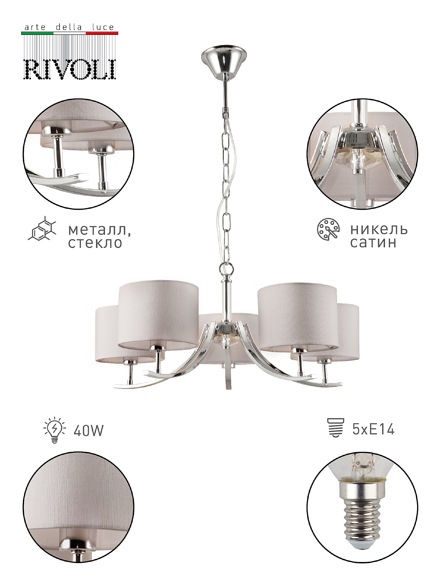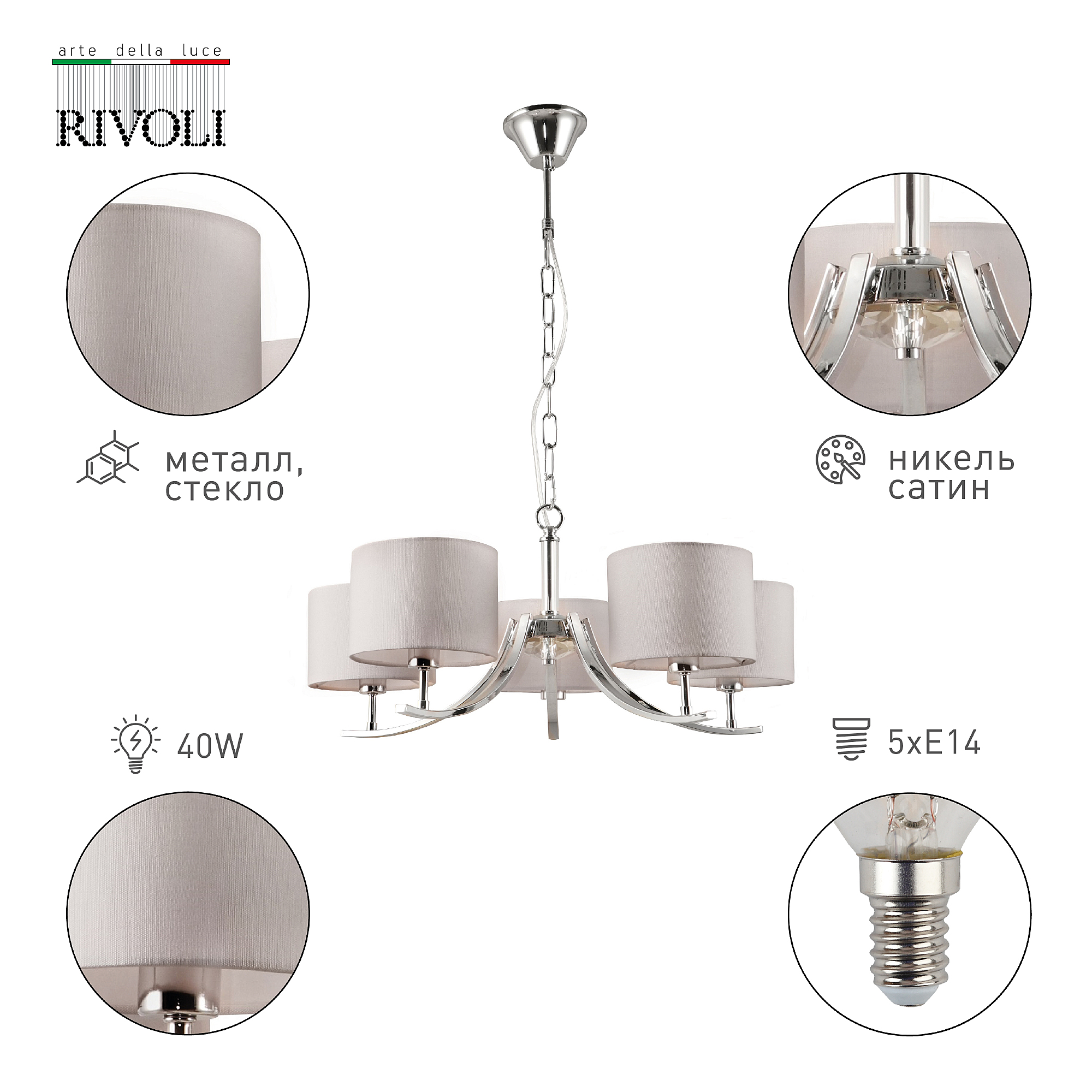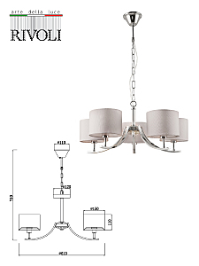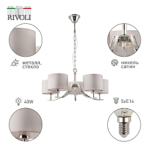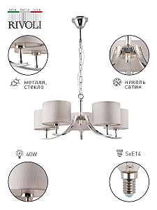 Подвесная классическая люстра Rivoli Artemisia с 5 тканевыми плафонами. Цвет арматуры люстры – хром. Окрашивание корпуса люстры осуществлено гальваническим способом, что сохранит цвет и блеск люстры потолочной надолго. Подвес люстры декорирован цепочкой. Высоту подвешивания люстры можно отрегулировать при монтаже, укоротив подвес и удалив звенья цепочки. Люстра Artemisia осветит качественно и ярко площадь до 15 м2. Это идеальный вариант люстры в гостиную, люстры в спальню, люстры в загородный дом, люстры в кабинет.Классическая коллекция Rivoli Artemisia: бра – арт. 2075-401, подвесная люстра под 5 ламп – арт. 2075-305, подвесная люстра под 7 ламп – арт. 2075-307, настольная лампа – арт. 7075-501.