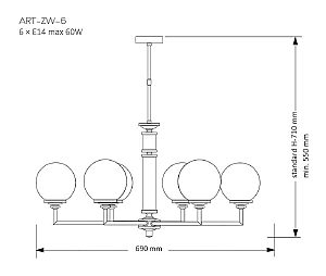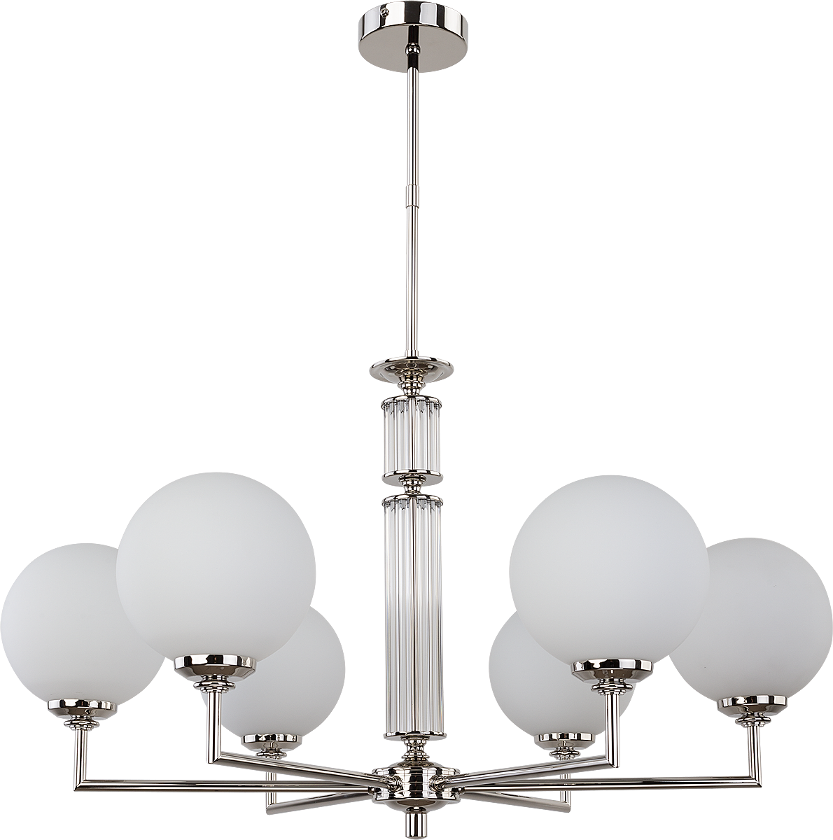 Шестиламповая люстра Artu Glass ART-ZW-6 (N) G выполнена из никелированной латуни со стеклянными плафонами, обеспечивая яркое и равномерное освещение больших помещений, таких как гостиные или залы.