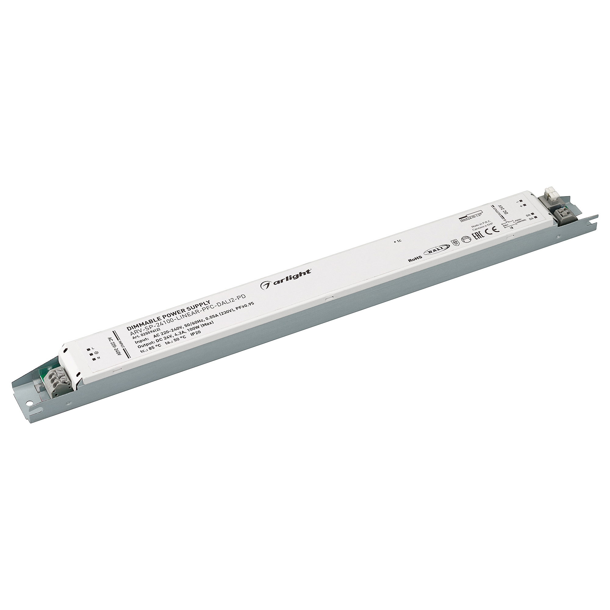 Диммируемый источник напряжения по протоколу DALI 2.0 и функцией PUSH DIM с гальванической развязкой для светодиодных изделий. Входное напряжение 220-240 VAC. Выходные параметры: 24 В, 4,2 А, 100 Вт. Встроенный PFC >0,95. Негерметичный алюминиевый корпус IP 20.Габаритные размеры длина 360 мм, ширина 30 мм, высота 21 мм. Гарантийный срок 5 лет.