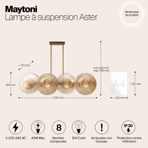 Допускается отличие страны-изготовителя, указанной в характеристиках. Линии производства могут находиться в нескольких государствах. Это не влияет на качество изготовления товара: все заводы данного бренда работают по общим стандартам, а готовые изделия проходят соответствующий контроль.Германия Коллекция Aster ЦветЦвет арматуры Золото Цвет Золото Материал арматуры Металл Материал плафона Стекло РазмерыВысота (мм) 1185 Длина (мм) 1010 Высота минимальная (мм) 685 Ширина (мм) 170 ЭлектрикаКоличество ламп (шт) 8 Цоколь E14 Лампочки в комплекте Нет в комплекте Мощность лампы (Вт) 40 Напряжение (В) 220 Дополнительная информацияСпособ крепления Планка Степень защиты (IP) IP20 Вес (Кг) 11,7 -