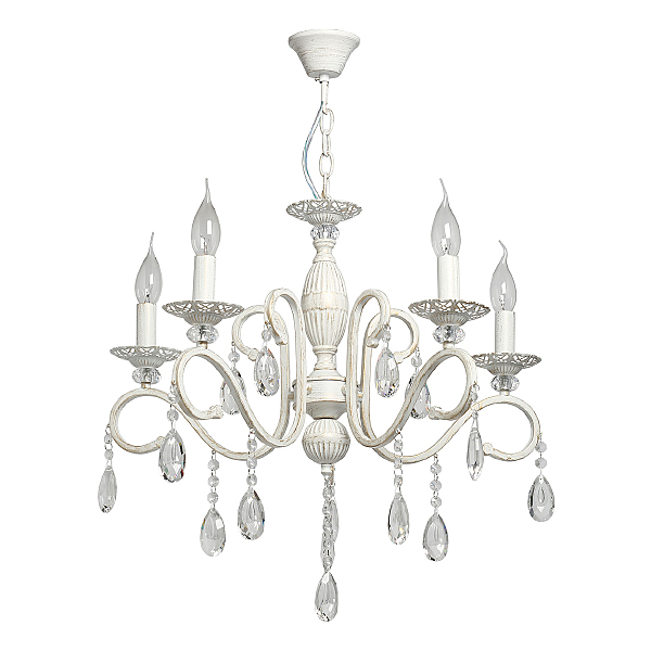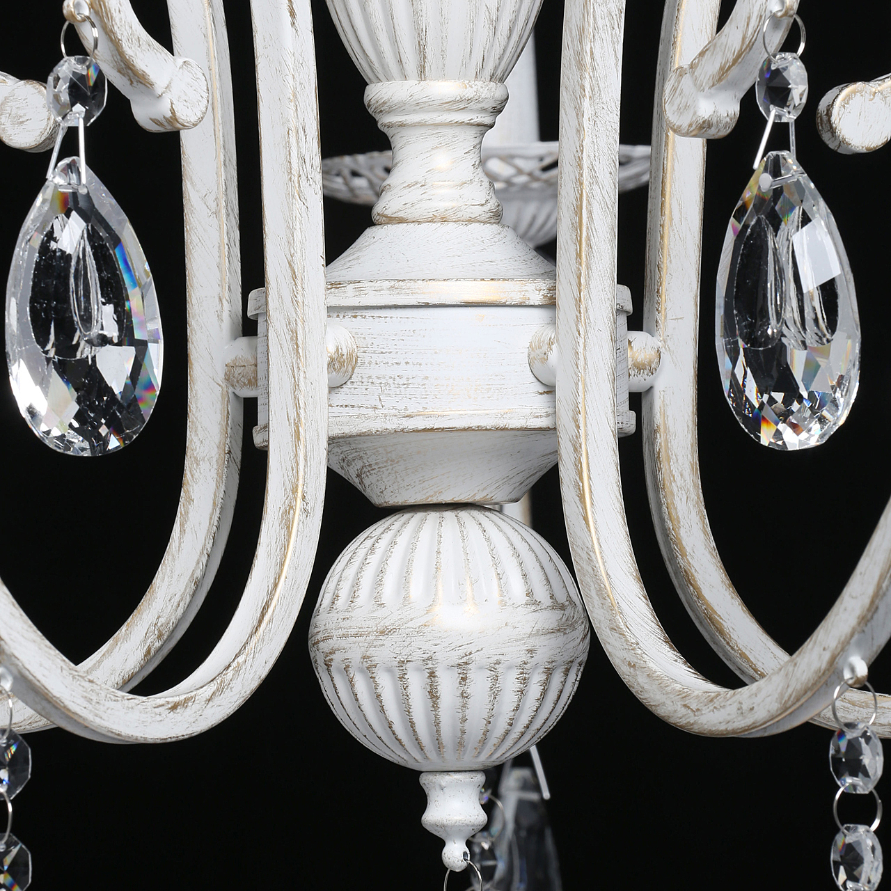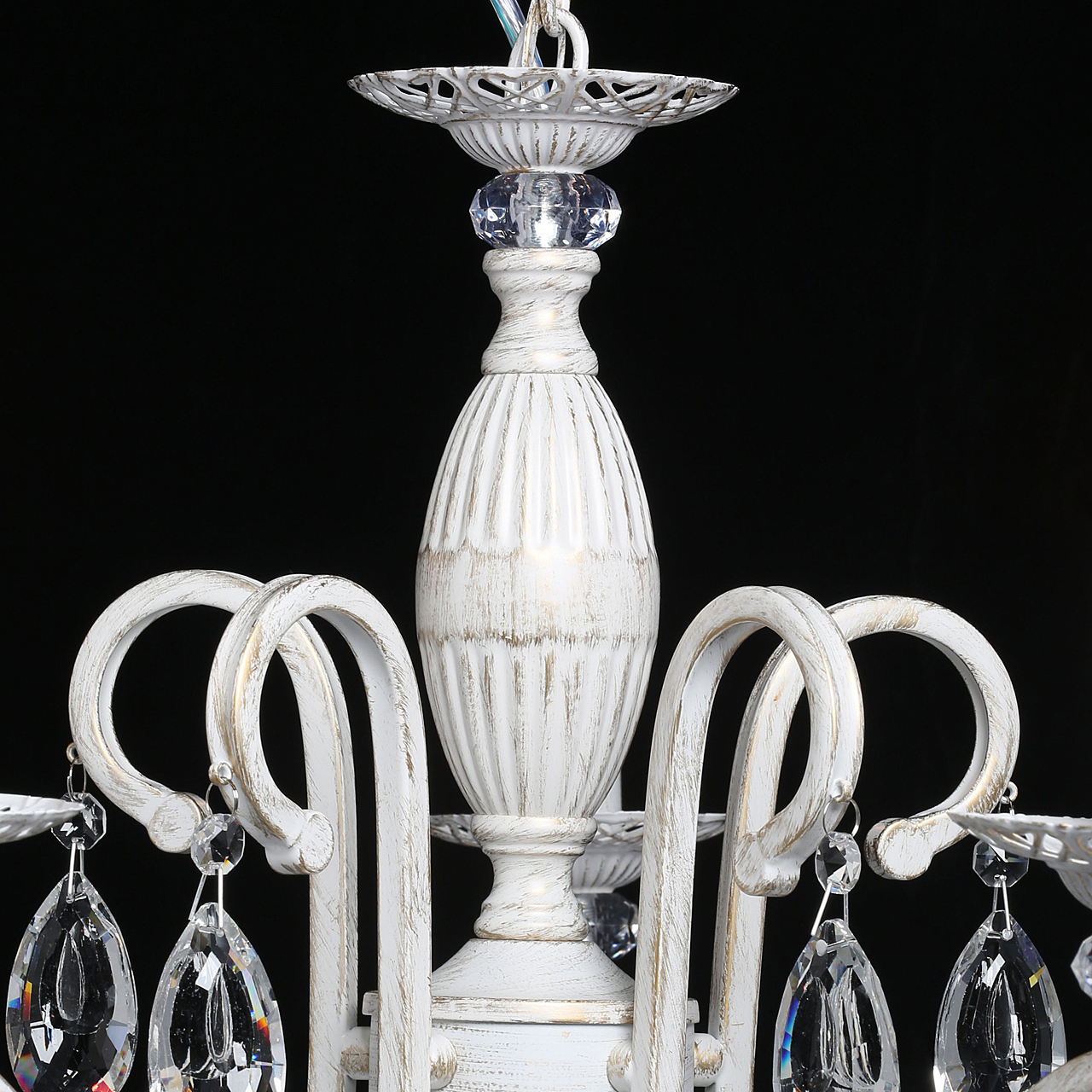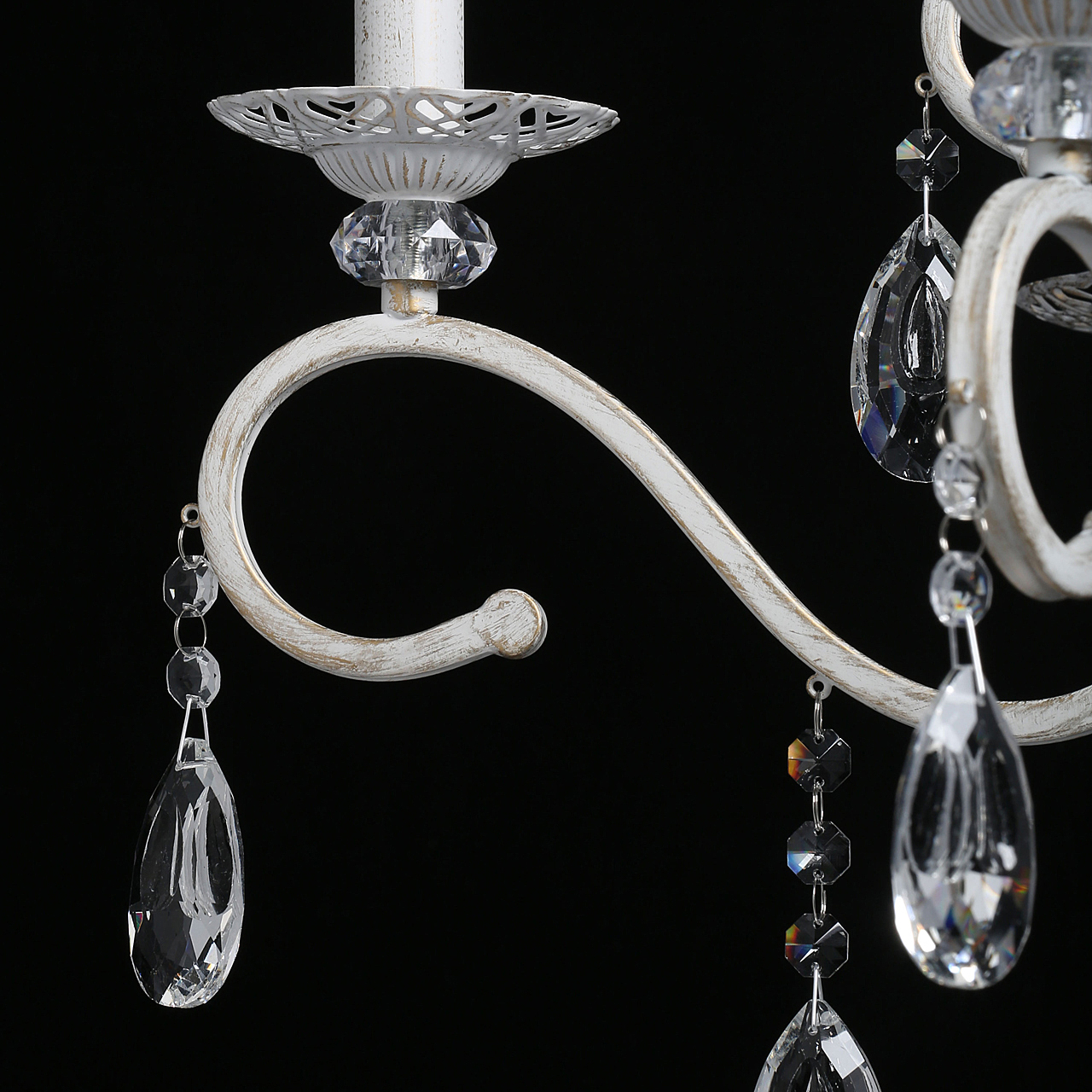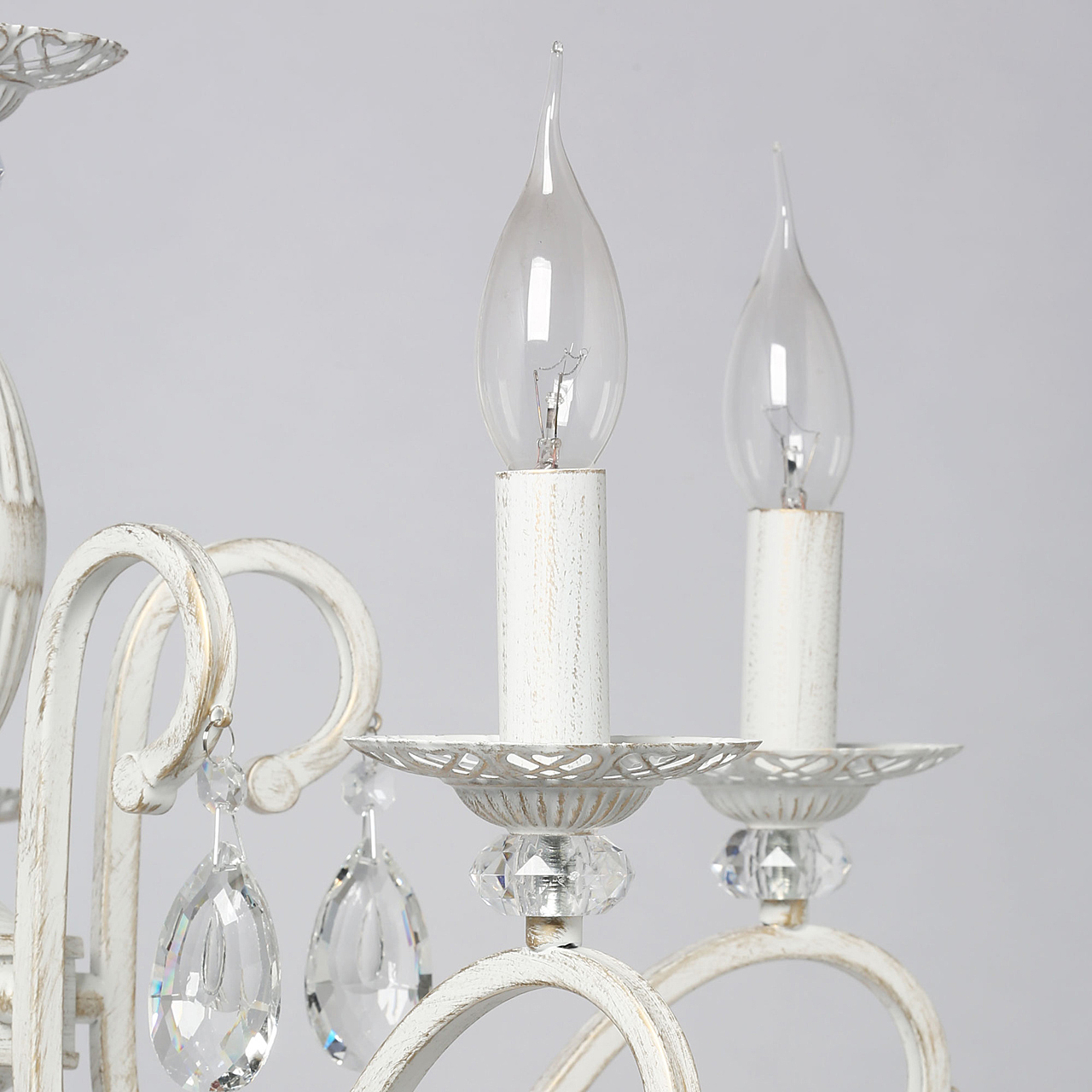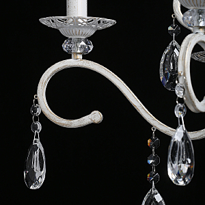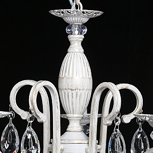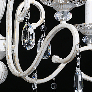 Классическая форма рожков-свечей с наборным основанием белого цвета с золотистой патиной.Оригинальная огранка хрустальных подвесок.Хрустальные элементы рожков с резными розетками придают легкости конструкции.Возможность регулировать высоту светильника, убирая лишние звенья цепи.