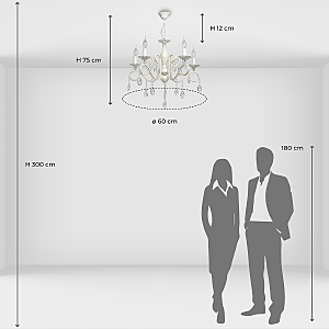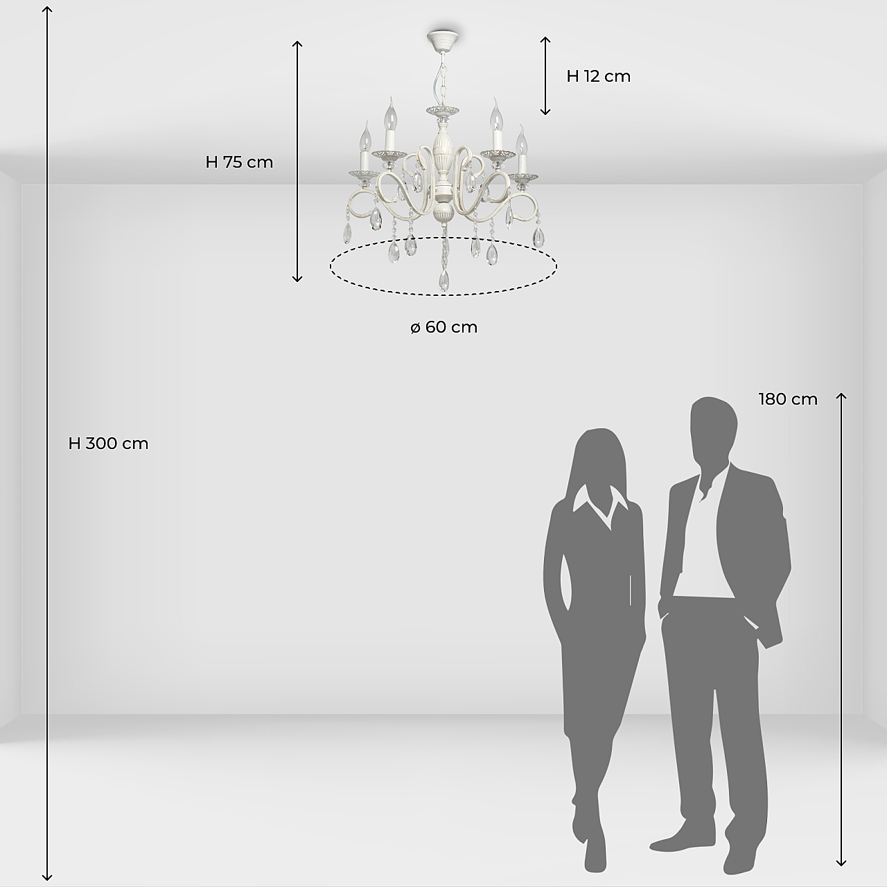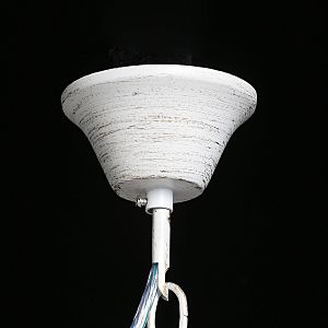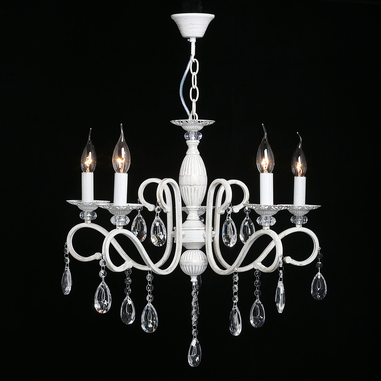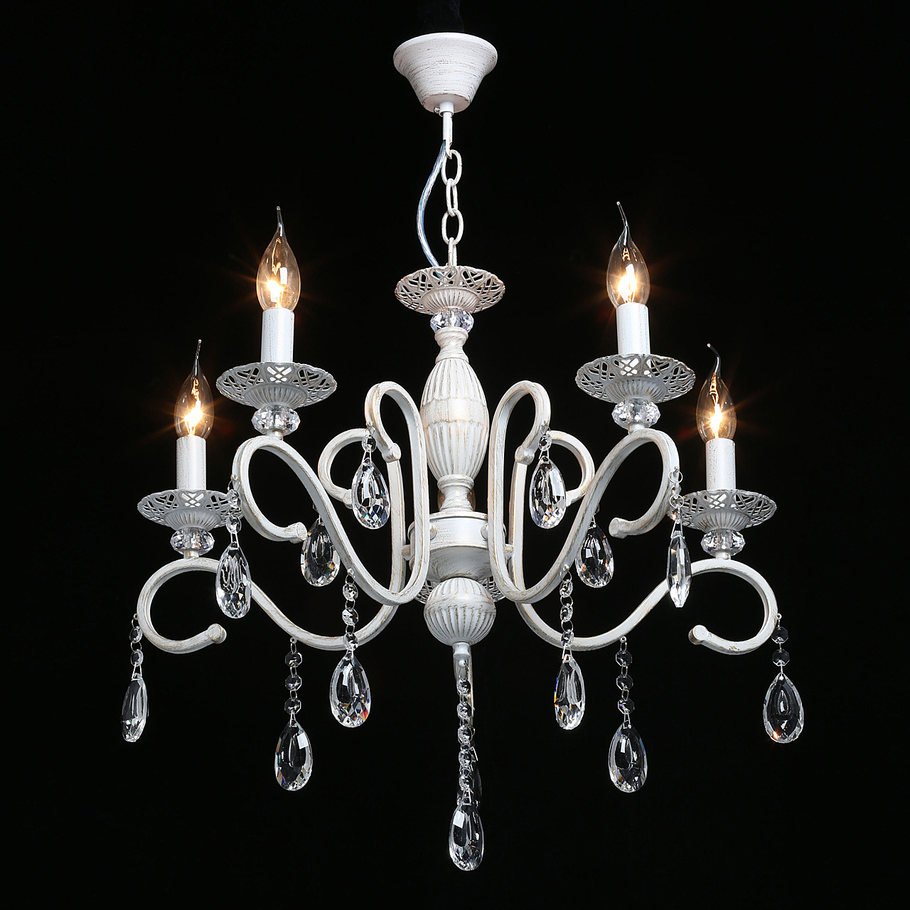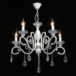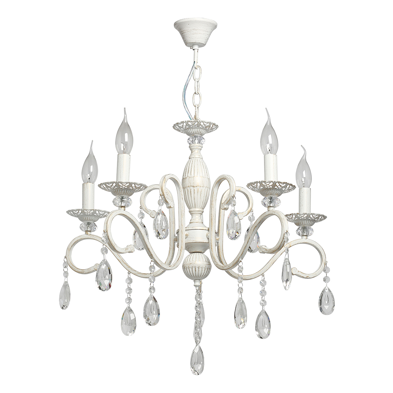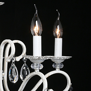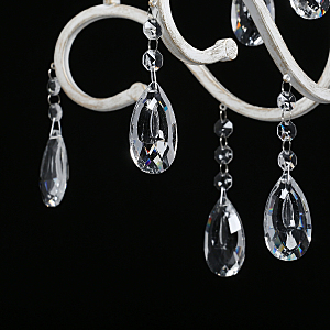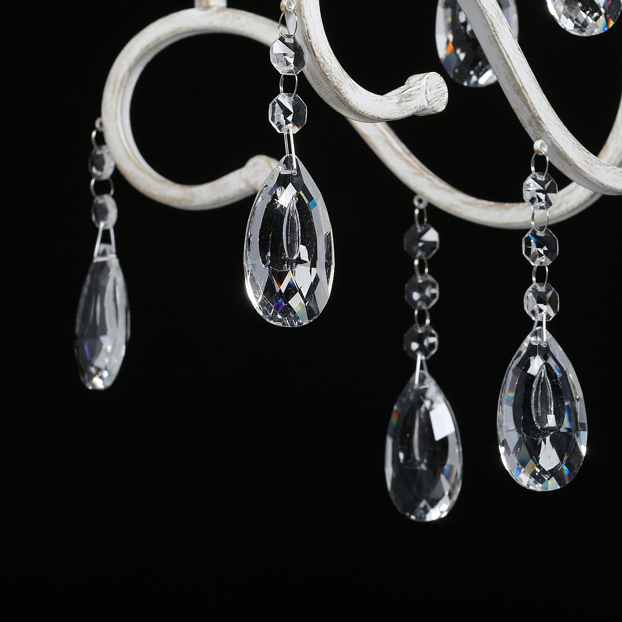 Классическая форма рожков-свечей с наборным основанием белого цвета с золотистой патиной.Оригинальная огранка хрустальных подвесок.Хрустальные элементы рожков с резными розетками придают легкости конструкции.Возможность регулировать высоту светильника, убирая лишние звенья цепи.
