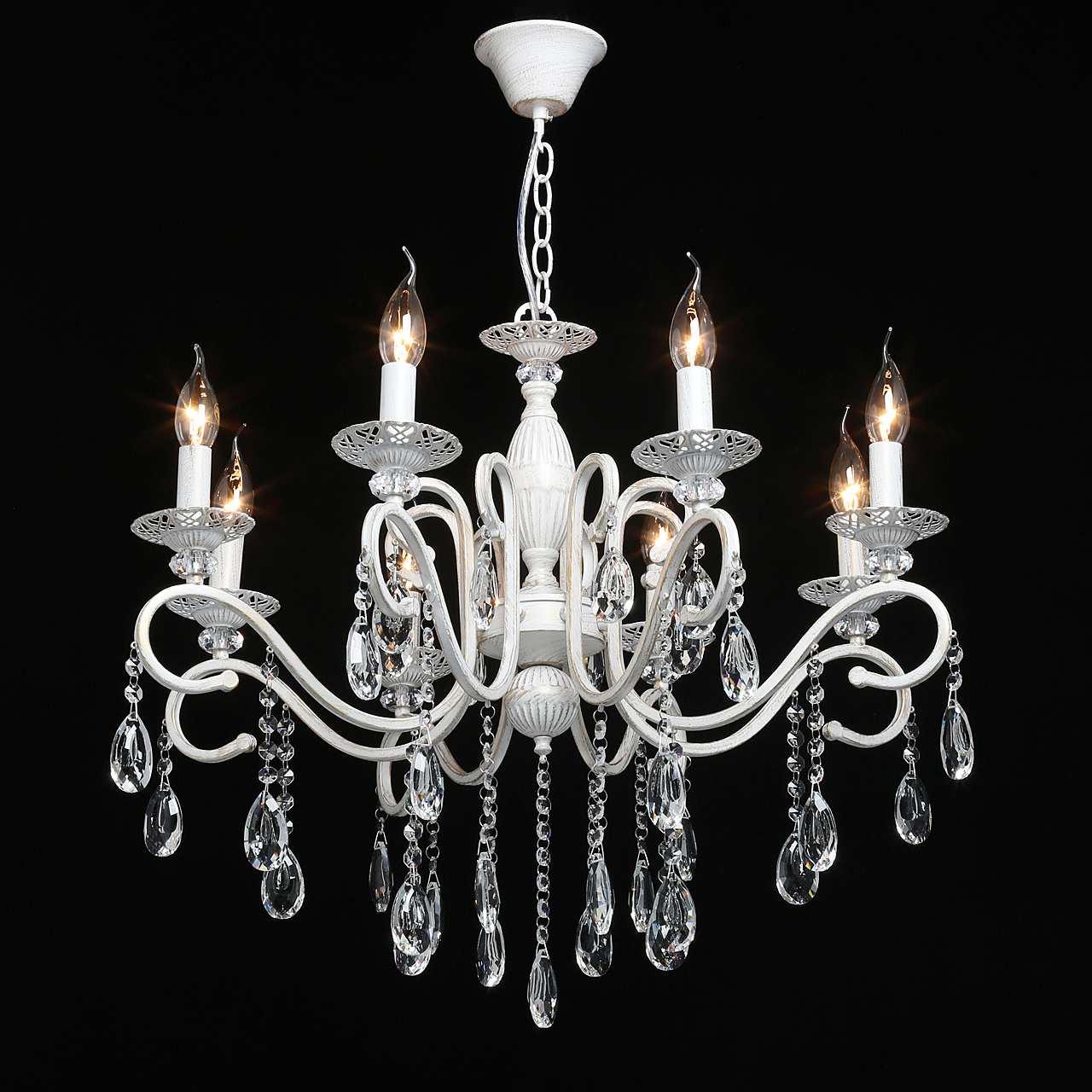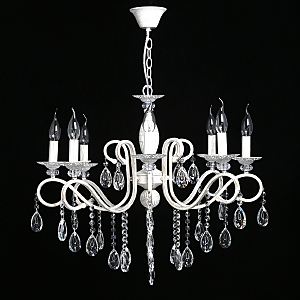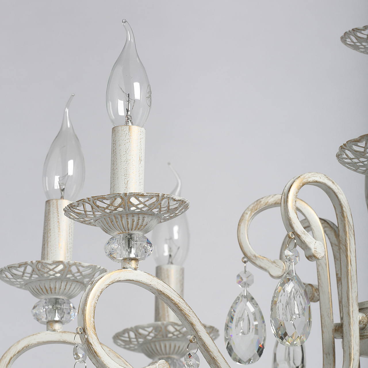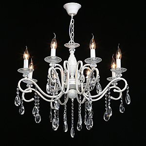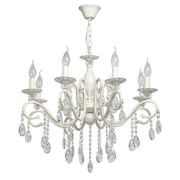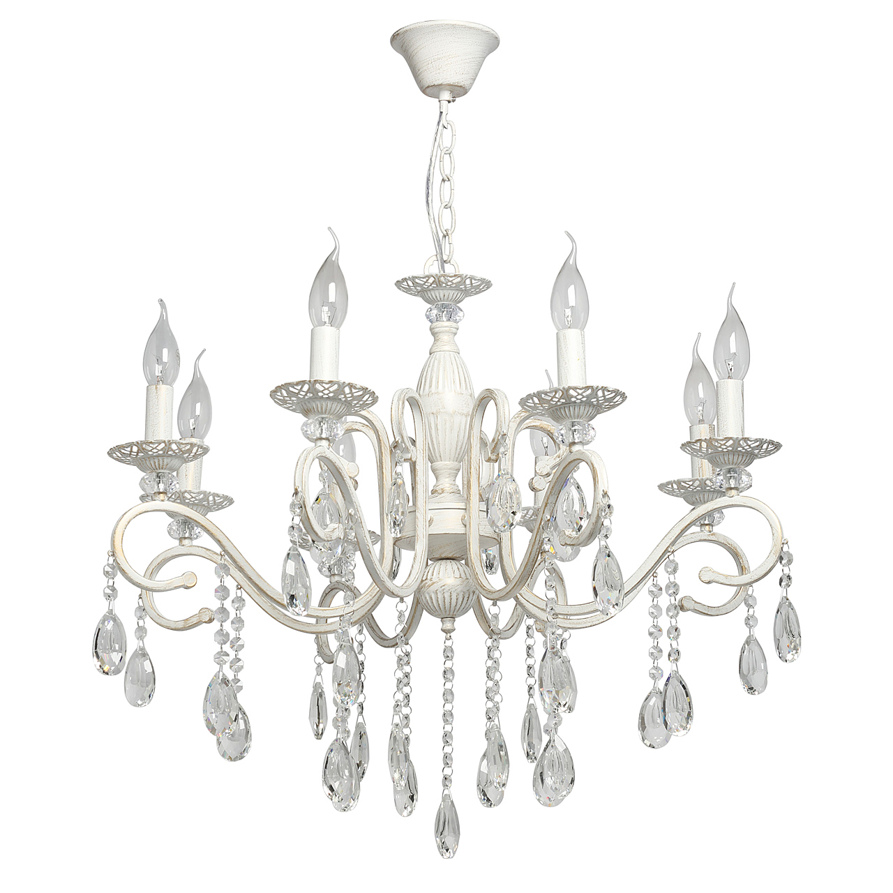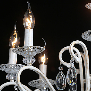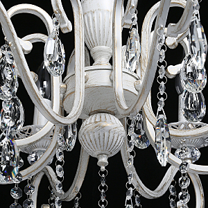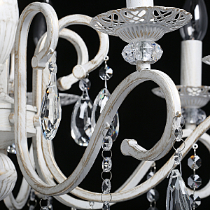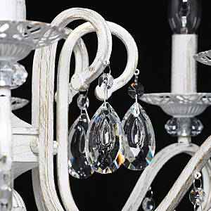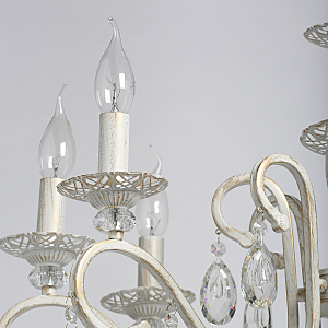Классическая форма рожков-свечей с наборным основанием белого цвета с золотистой патиной.Широкий диаметр у модели на 8 рожков .Оригинальная огранка хрустальных подвесок.Хрустальные элементы рожков с резными розетками придают легкости конструкции.Возможность регулировать высоту светильника, убирая лишние звенья цепи.