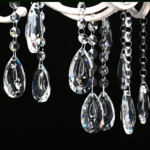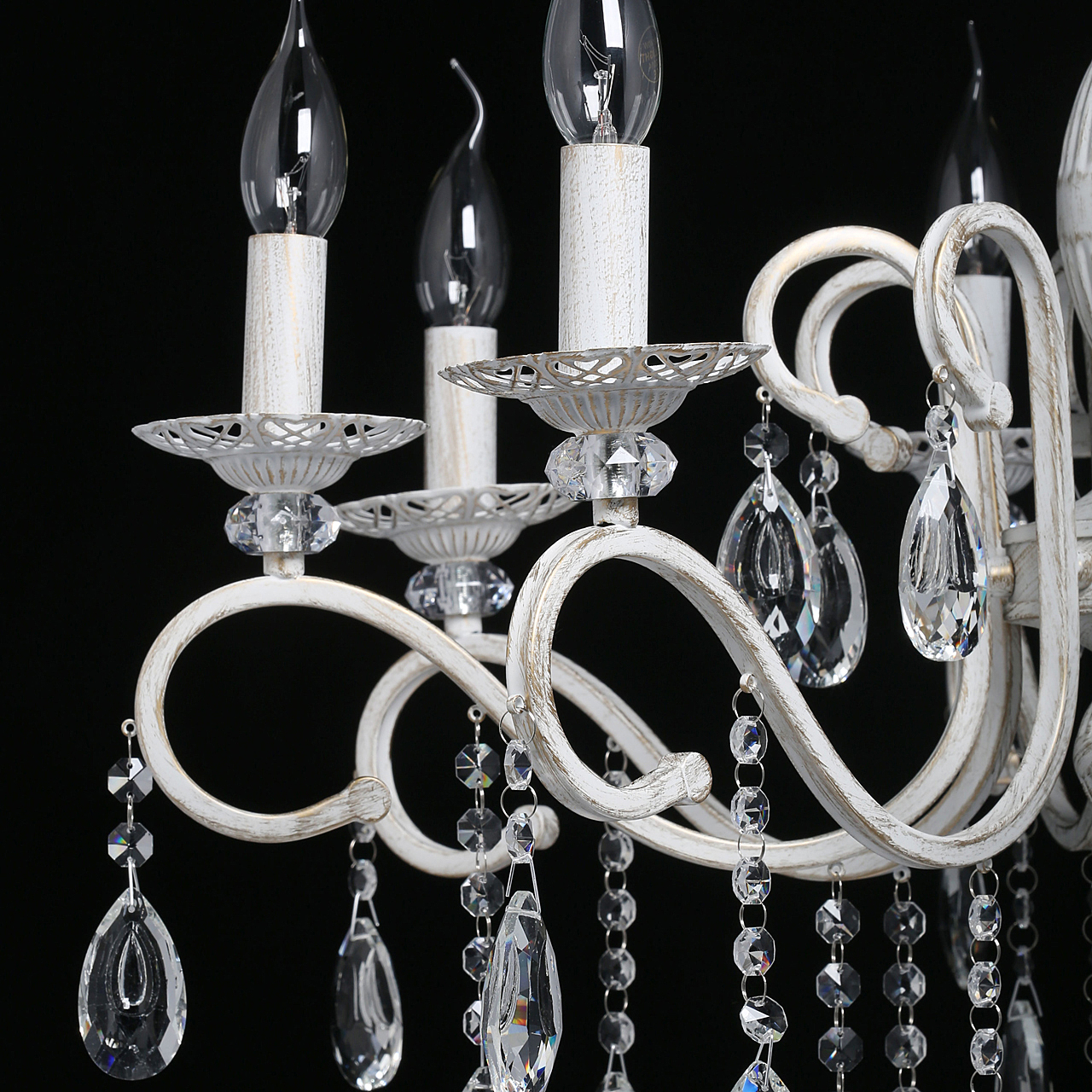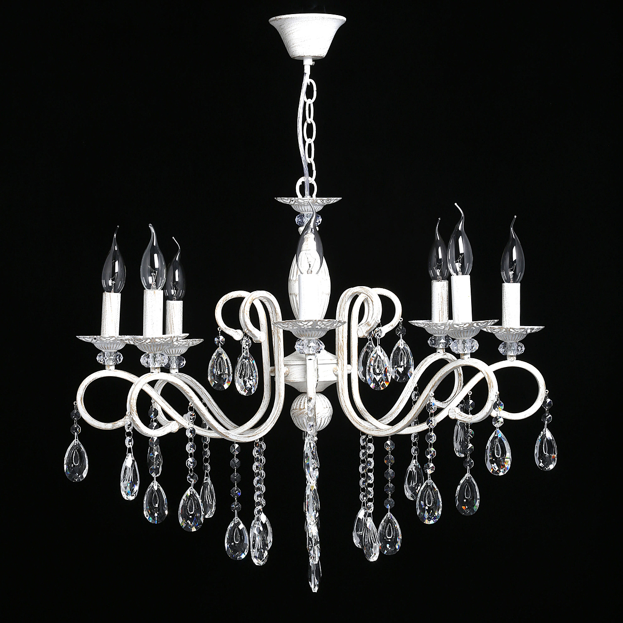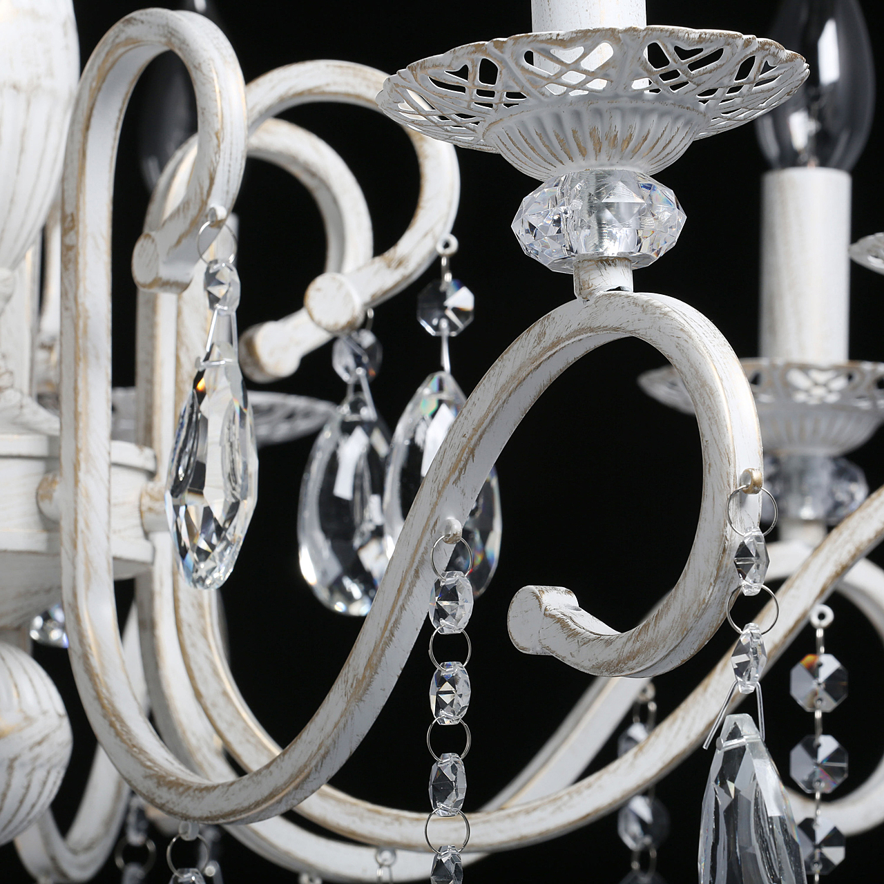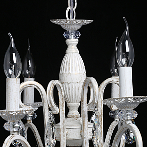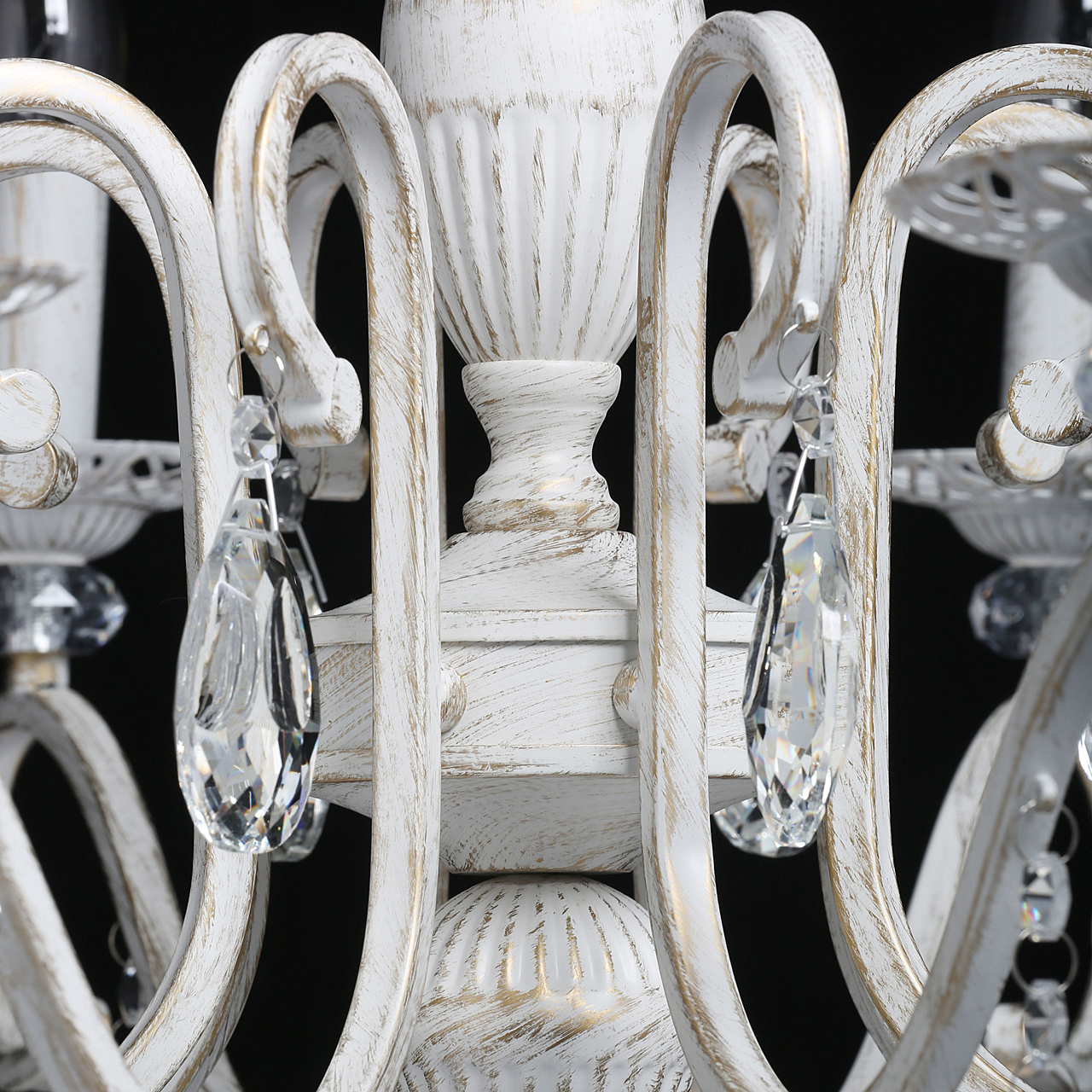 Классическая форма рожков-свечей с наборным основанием белого цвета с золотистой патиной.Широкий диаметр у модели на 8 рожков .Оригинальная огранка хрустальных подвесок.Хрустальные элементы рожков с резными розетками придают легкости конструкции.Возможность регулировать высоту светильника, убирая лишние звенья цепи.