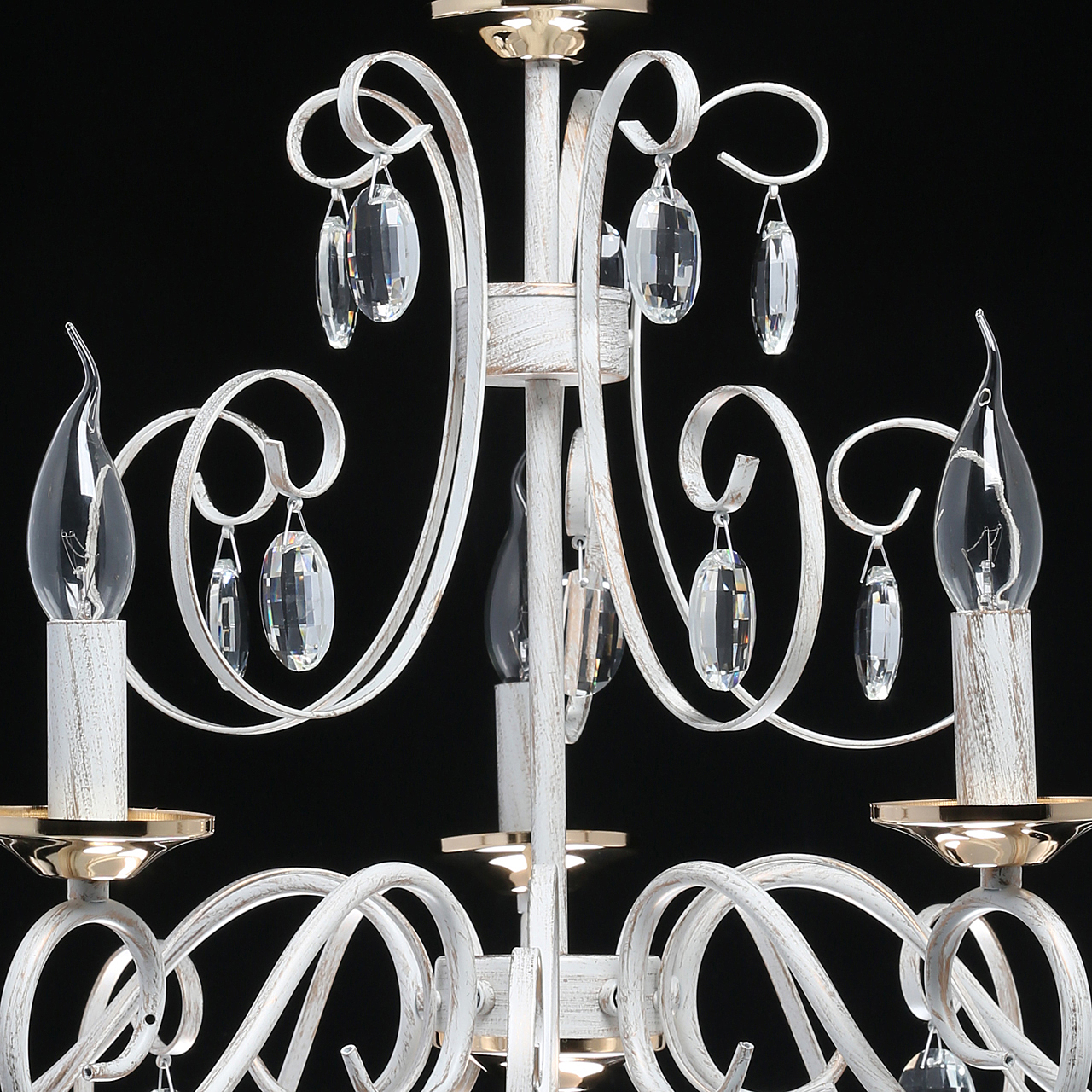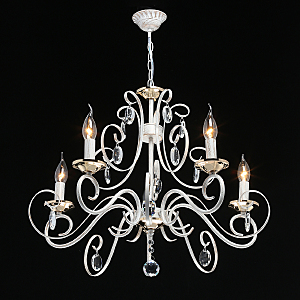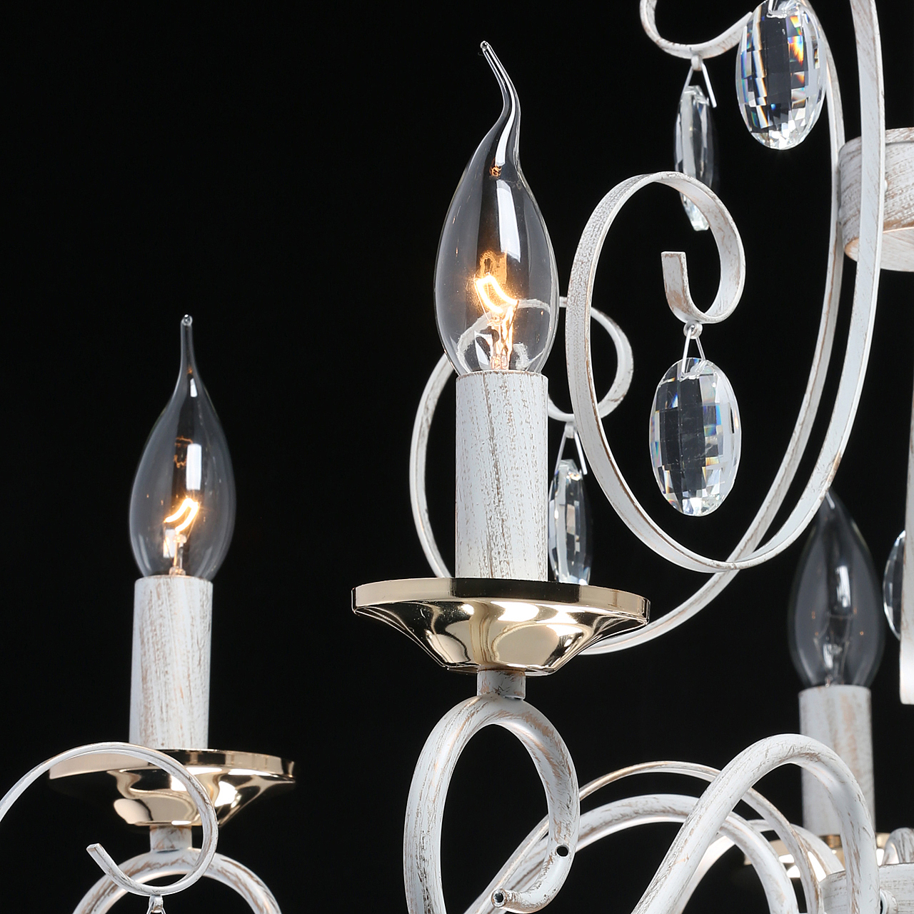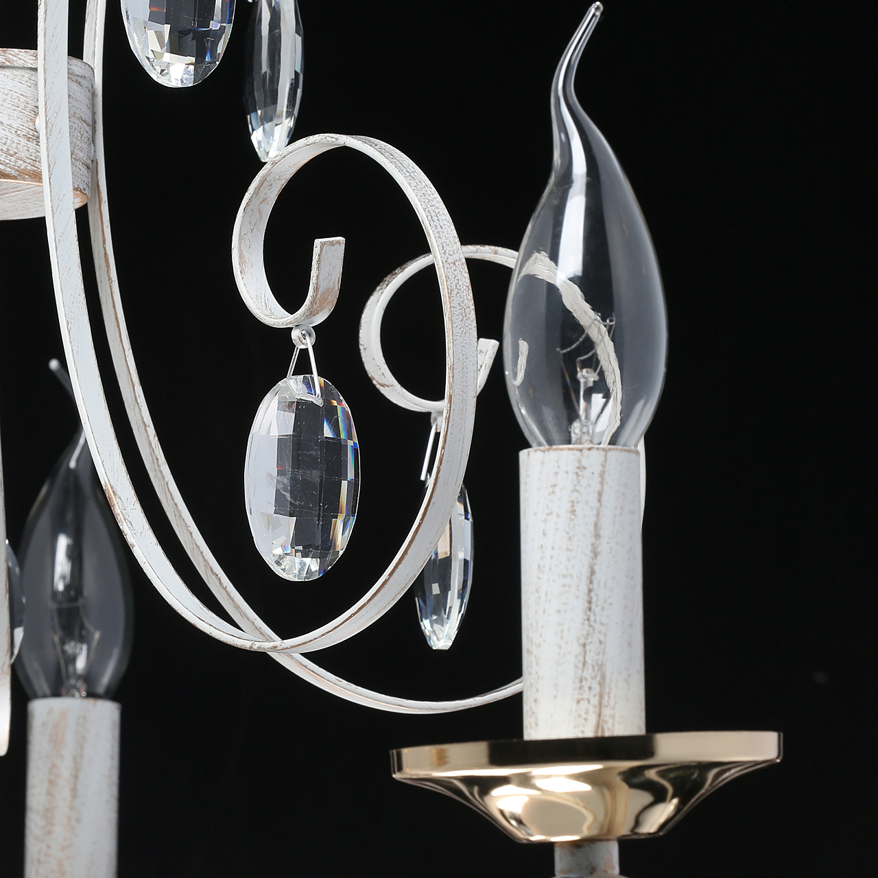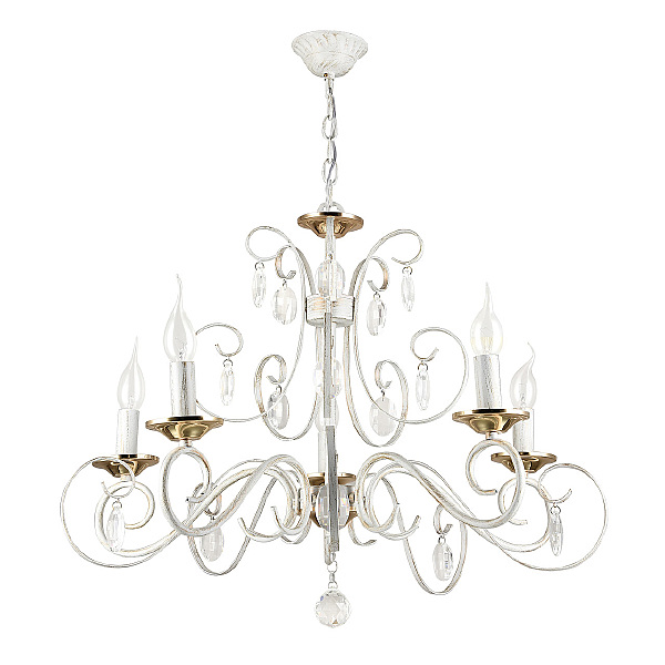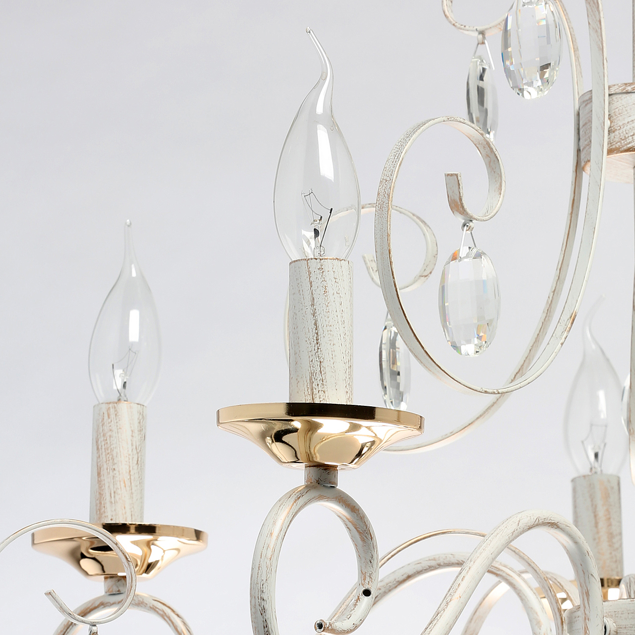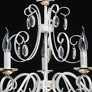 Классическая форма рожков-свечей белого цвета с золотистой патиной.Подвески из прозрачного хрусталя и розетки золотого цвета придают легкости.Возможность регулировать высоту светильника за счет звеньев цепи.