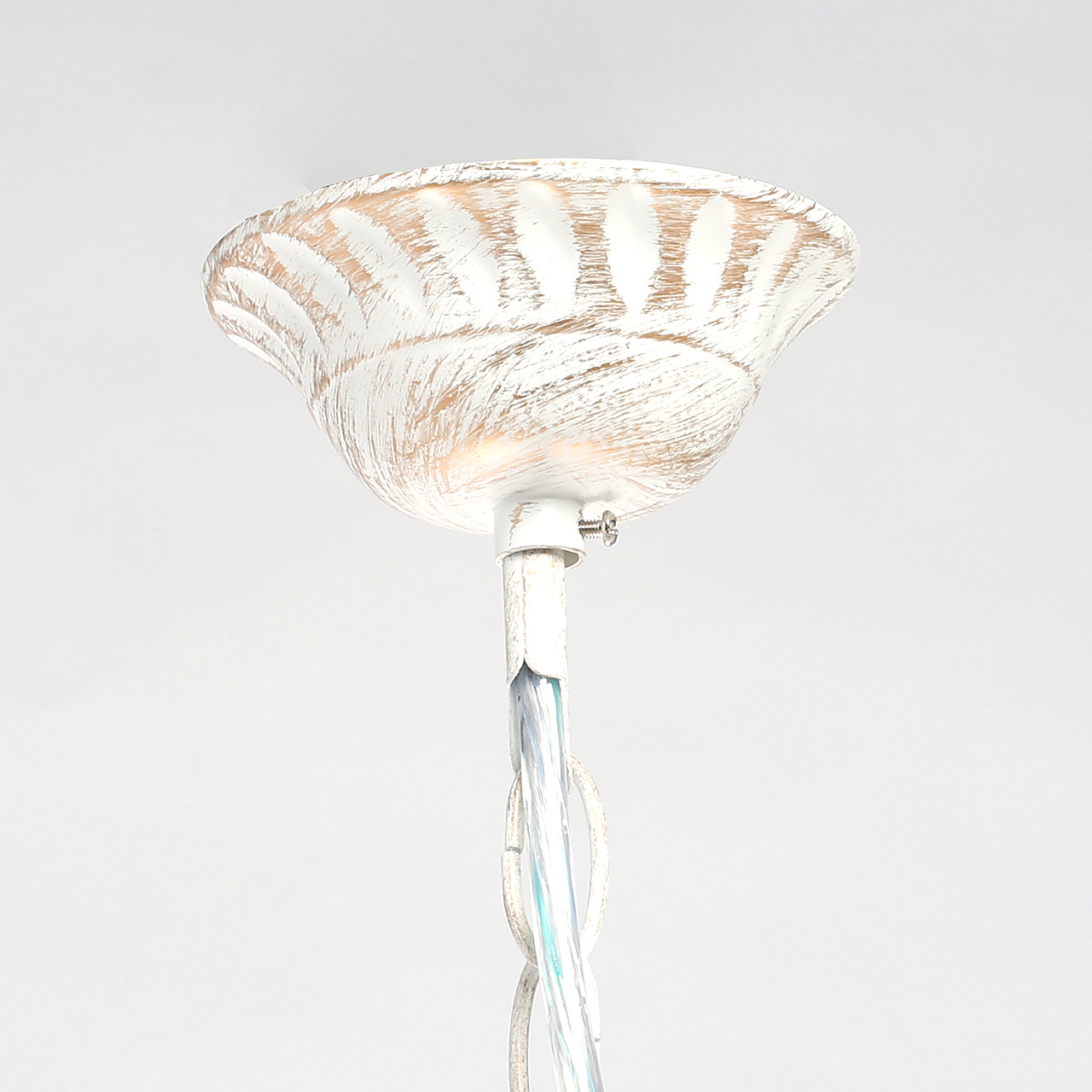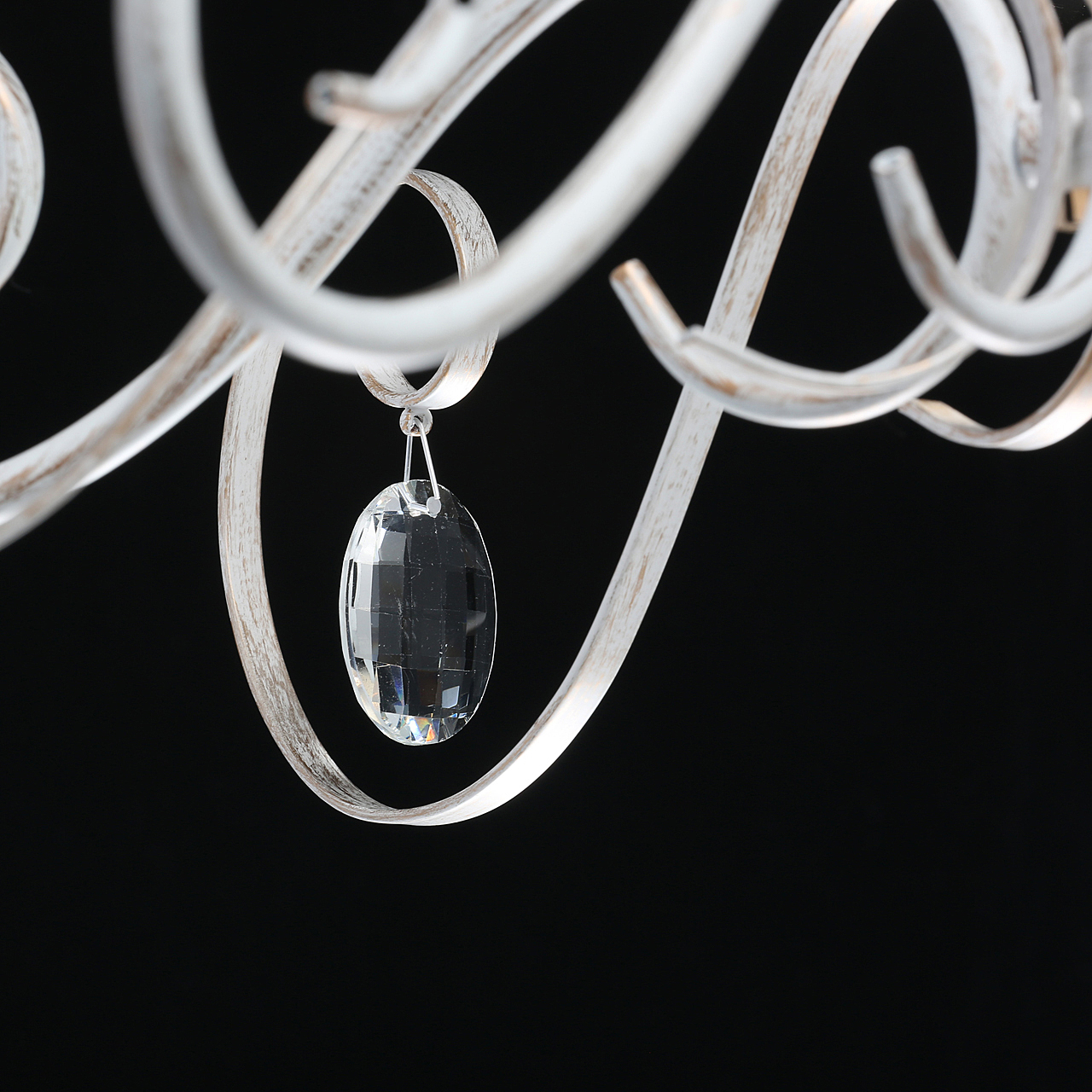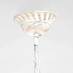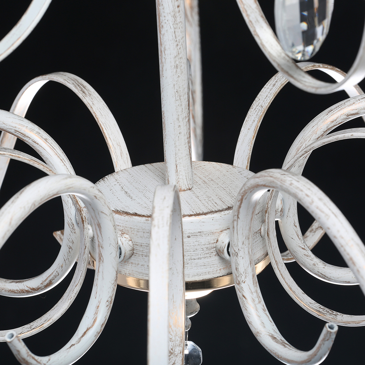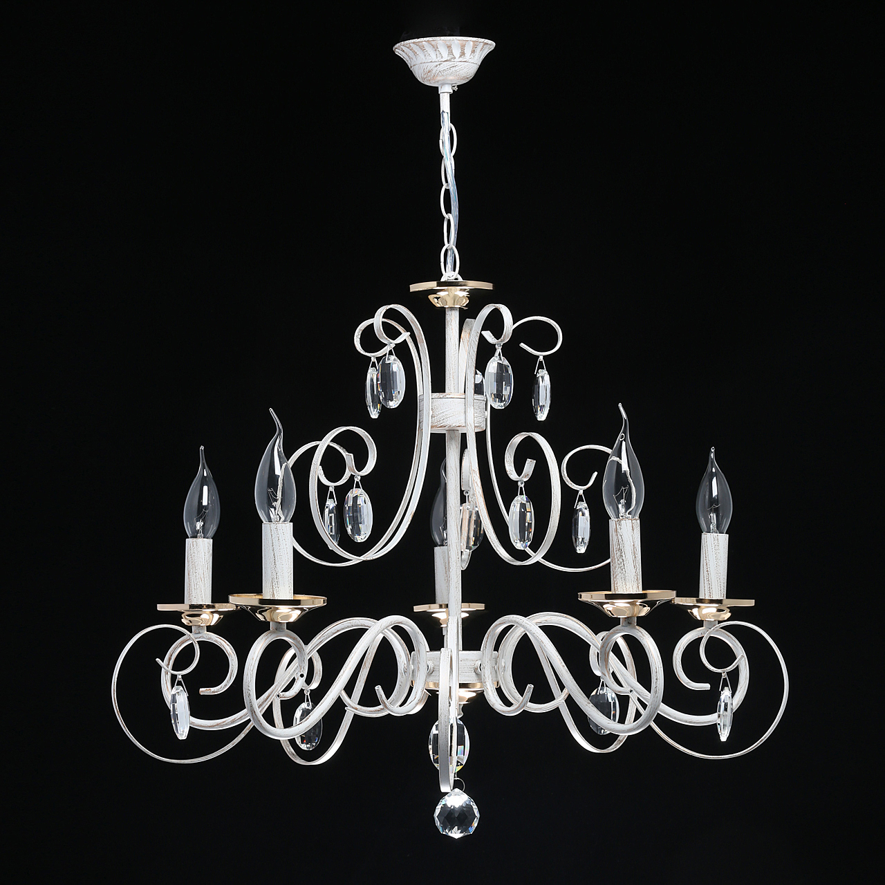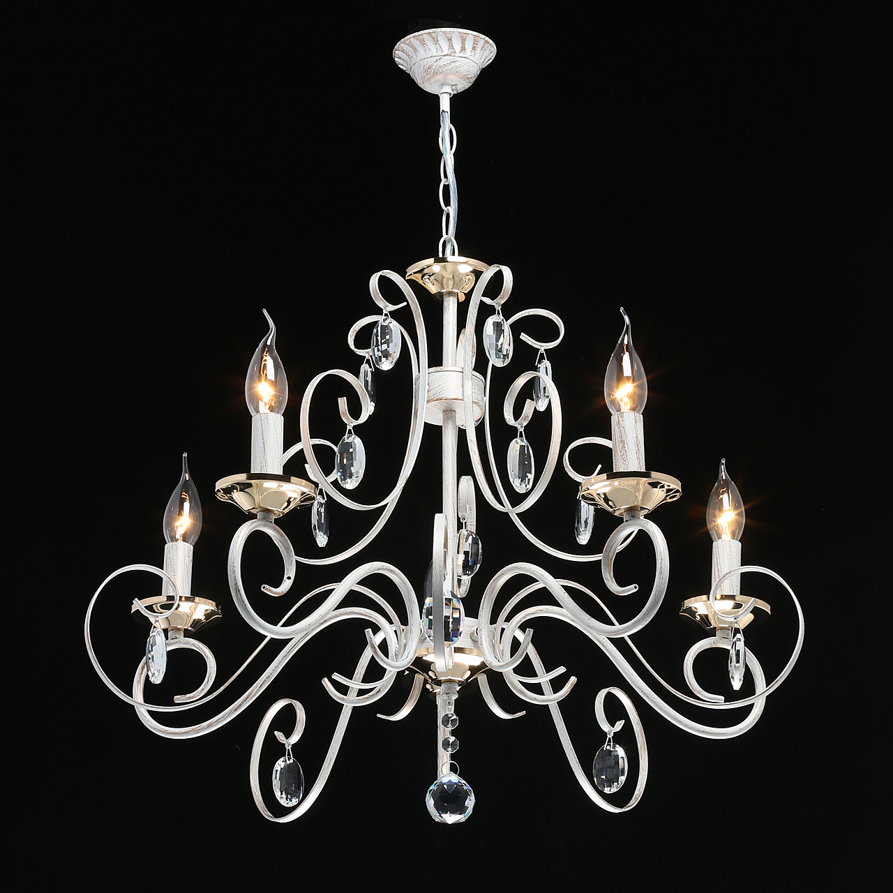 Классическая форма рожков-свечей белого цвета с золотистой патиной.Подвески из прозрачного хрусталя и розетки золотого цвета придают легкости.Возможность регулировать высоту светильника за счет звеньев цепи.