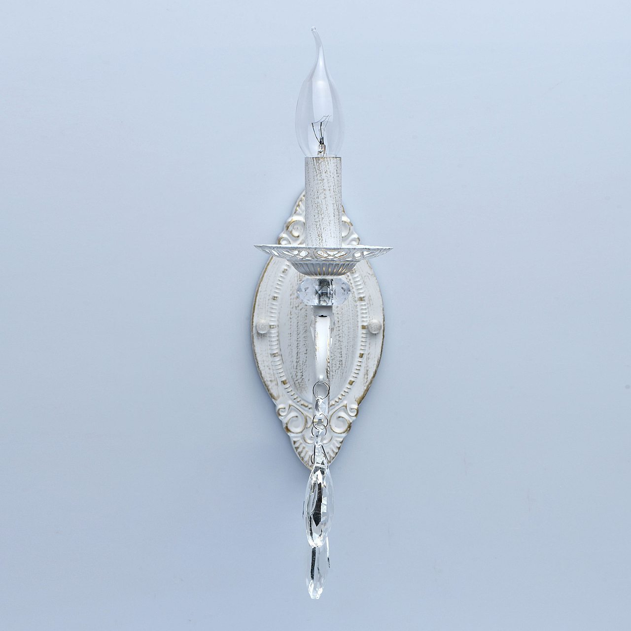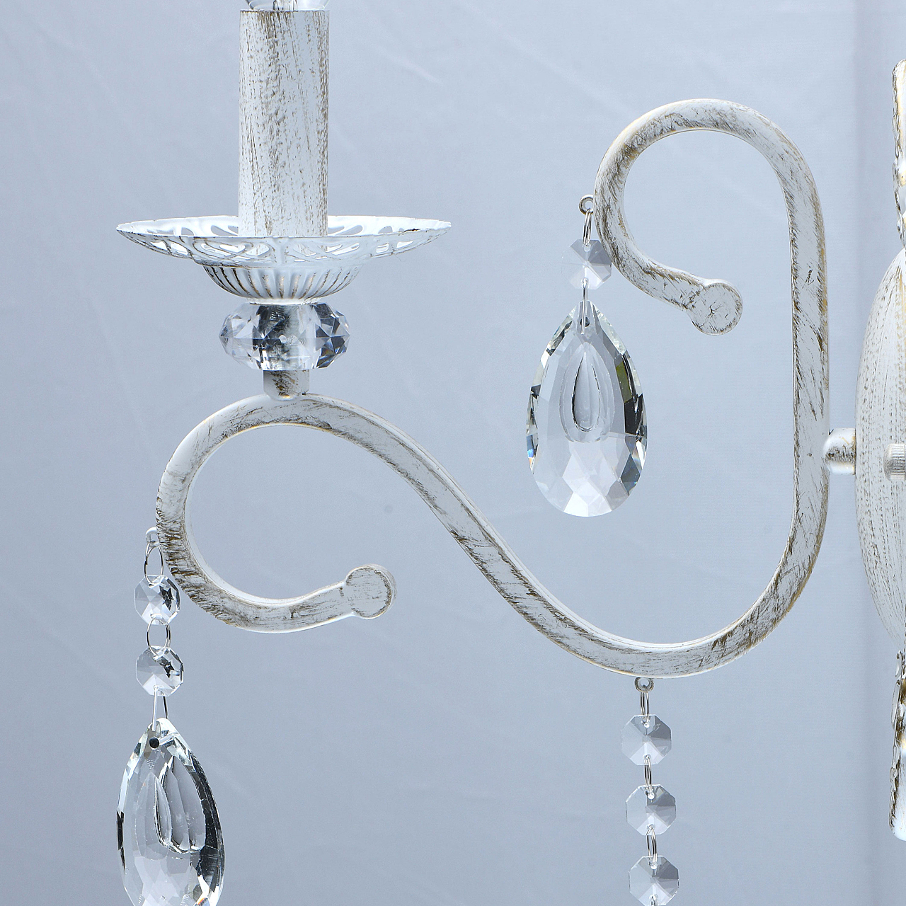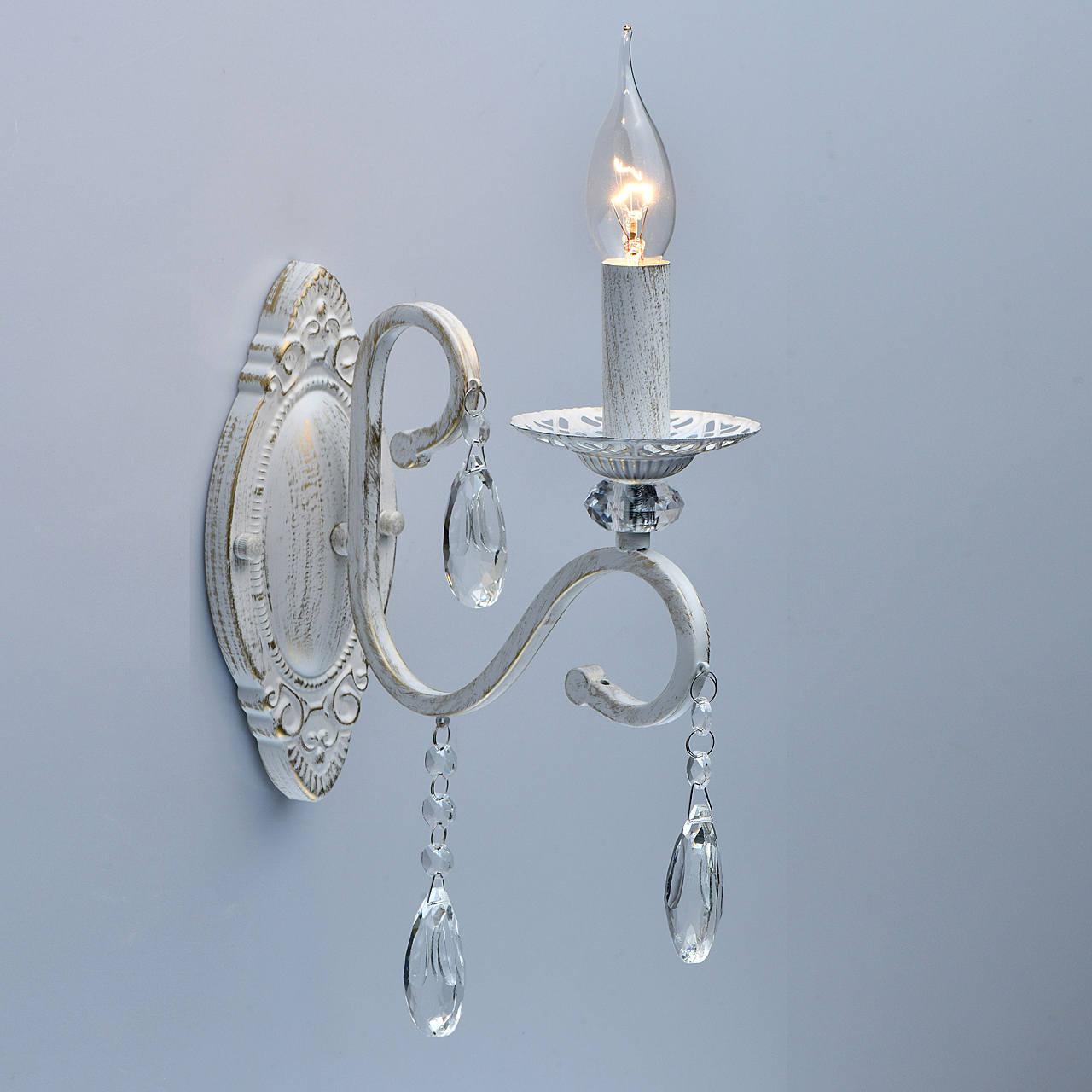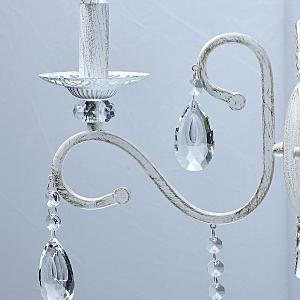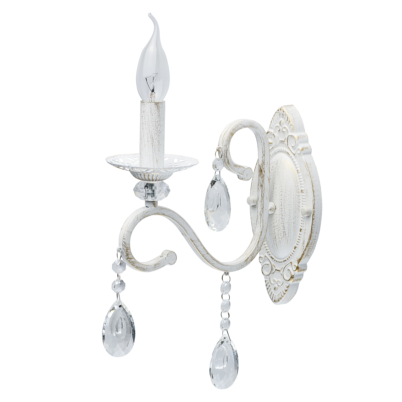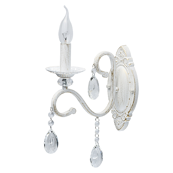 Классическая форма рожка-свечи белого цвета с золотистой патиной.Оригинальная огранка хрустальных подвесок.Декор рожка с резной розеткой придает легкости конструкции.Бра дополняет полную семью со светильниками на 5 и 8 ламп.