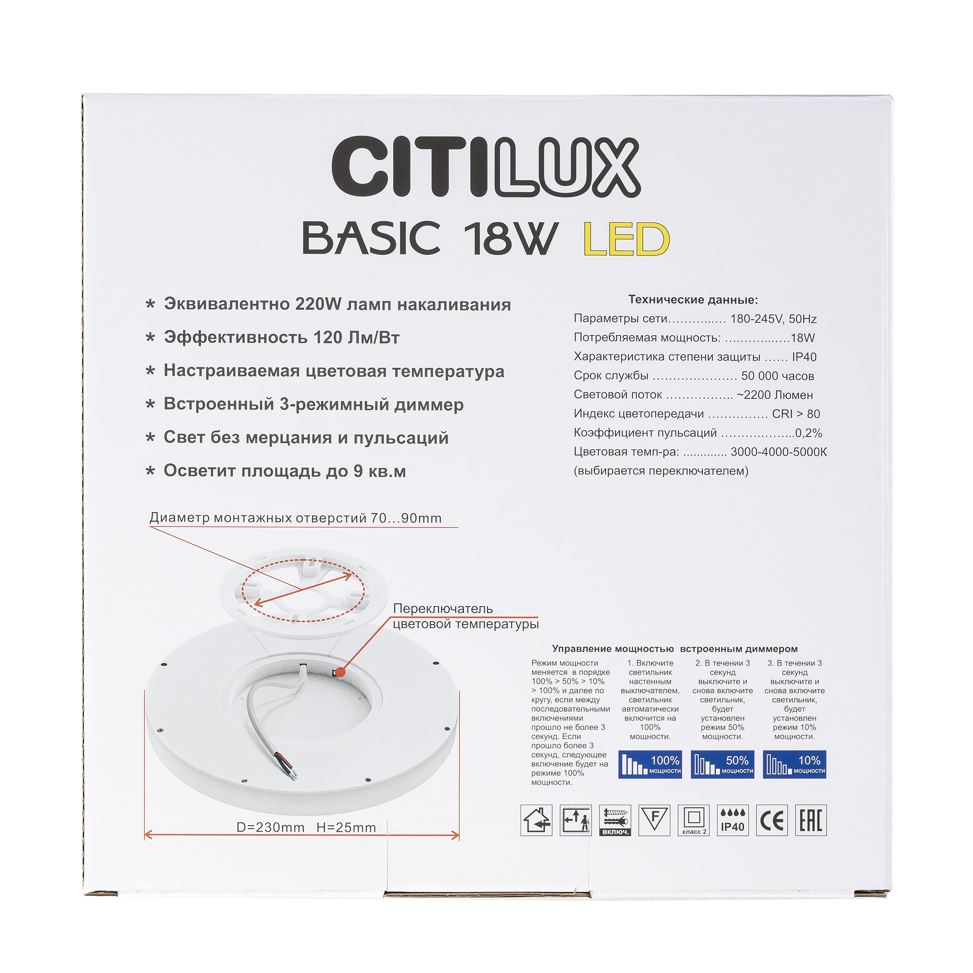 Допускается отличие страны-изготовителя, указанной в характеристиках. Линии производства могут находиться в нескольких государствах. Это не влияет на качество изготовления товара: все заводы данного бренда работают по общим стандартам, а готовые изделия проходят соответствующий контроль.Дания Коллекция Бейсик ЦветЦвет арматуры под дерево Цвет Дерево Материал арматуры Высокопрочный полимер РазмерыВысота (мм) 25 Диаметр (мм) 230 ЭлектрикаТип лампы Светодиодная Общая мощность (Вт) 18 Световой поток 2200 Цветовая температура 3000-4000-5000 Площадь освещения 9 Дополнительная информацияСпособ крепления Планка Степень защиты (IP) IP40 Диммирование Да Техническая оссобеность Регулировка яркости, Полностью светодиодная, Регулировка цветовой температуры -