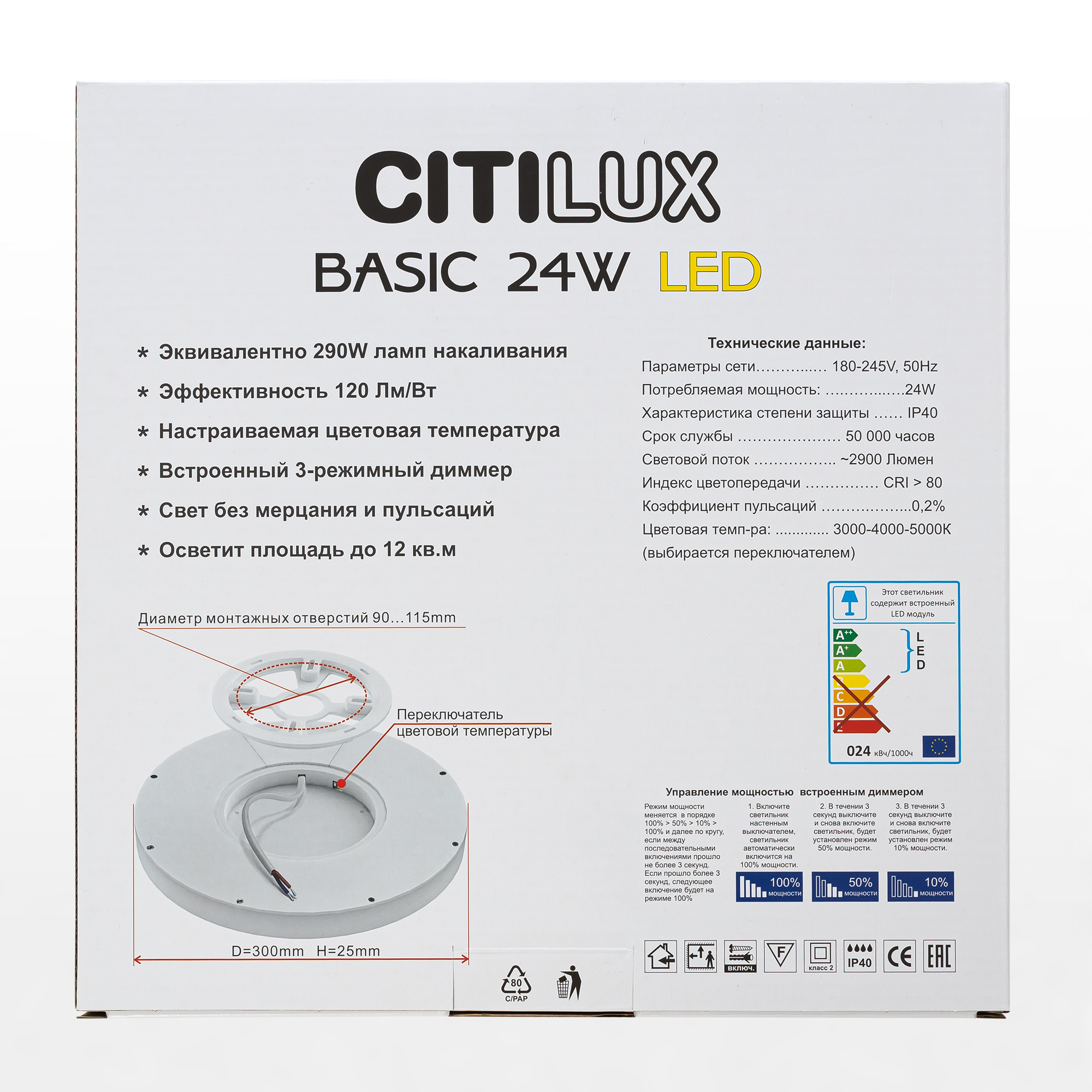 Допускается отличие страны-изготовителя, указанной в характеристиках. Линии производства могут находиться в нескольких государствах. Это не влияет на качество изготовления товара: все заводы данного бренда работают по общим стандартам, а готовые изделия проходят соответствующий контроль.Дания Коллекция Бейсик ЦветЦвет арматуры под дерево Цвет Дерево Материал арматуры Высокопрочный полимер РазмерыВысота (мм) 25 Диаметр (мм) 300 ЭлектрикаТип лампы Светодиодная Общая мощность (Вт) 24 Световой поток 2900 Цветовая температура 3000-4000-5000 Площадь освещения 12 Дополнительная информацияСпособ крепления Планка Степень защиты (IP) IP40 Диммирование Да Техническая оссобеность Регулировка яркости, Полностью светодиодная, Регулировка цветовой температуры -
