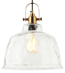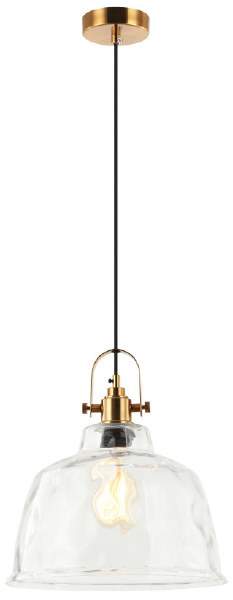 Светильник подвесной из коллекции Bell выполнен из металла, гальванизированного в цвет бронзы, и декорирован плафоном из прозрачного оплавленного стекла. На подвесе дополнительно используется декоративный элемент в виде крупной металлической скобы, гальванизированной в цвет арматуры, что придает подвесу индустриальный вид. Премиальное качество и неповторимыи? дизаи?н светильников идеально подои?дут в современные и дизайнерские интерьеры.