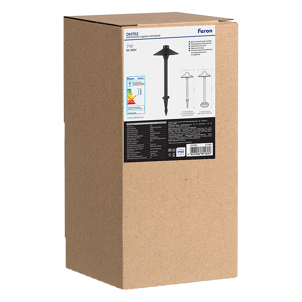 Светильник уличный светодиодный, На постамент/на колышке (ДТУ) FERON DH702, серия Берген, 7W, 2700К (теплый белый), AC85-265VV/50Гц, 120Lm, IP65, 1LED*COB, класс защиты 1, раб.t -40?C - +40?C, цвет черный, корпус алюминий, 200*200*510мм,