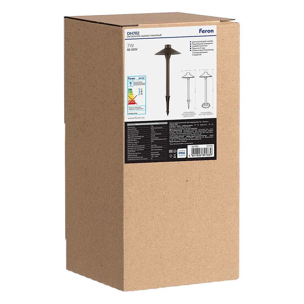 Светильник уличный светодиодный, На постамент/на колышке (ДТУ) FERON DH702, серия Берген, 7W, 2700К (теплый белый), AC85-265VV/50Гц, 120Lm, IP65, 1LED*COB, класс защиты 1, раб.t -40?C - +40?C, цвет коричневый, корпус алюминий, 200*200*510мм,