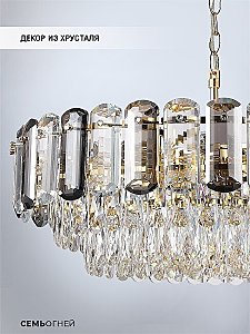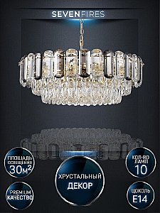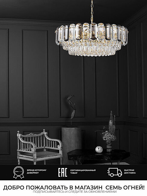ПРЕИМУЩЕСТВА. Гальваническое покрытие цвета Золото. Хрусталь непревзойденного качества ASTREA. Хорошие осветительные характеристики благодаря многогранности хрусталя. ПРИМЕНЕНИЕ. Люстра подвесная предназначена для основного освещения помещений-. гостиная,зал,спальня,прихожая,детская,кухня. Можно регулировать высоту люстры изменением длины цепи. Используемые материалы-металл,хрусталь. Источник света-лампы накаливания мощностью до 40Вт,светодиодные лампы мощностью до 12Вт. Крепление накладным способом монтажной планки шурупами. Удобный крепеж подойдет под все виды потолков-бетон,гипсокартон,натяжные и деревянные потолки. Люстра подвесная изготовлена из высококачественных материалов и является безопасной для человека и окружающей среды.. Семь Огней создает продукт от эскиза до готового шедевра. Над созданием светильников трудятся одни из лучших дизайнеров и конструкторов. Наша компания предъявляет высокие требования к производимой продукции, что подтверждено сертификатами качества.